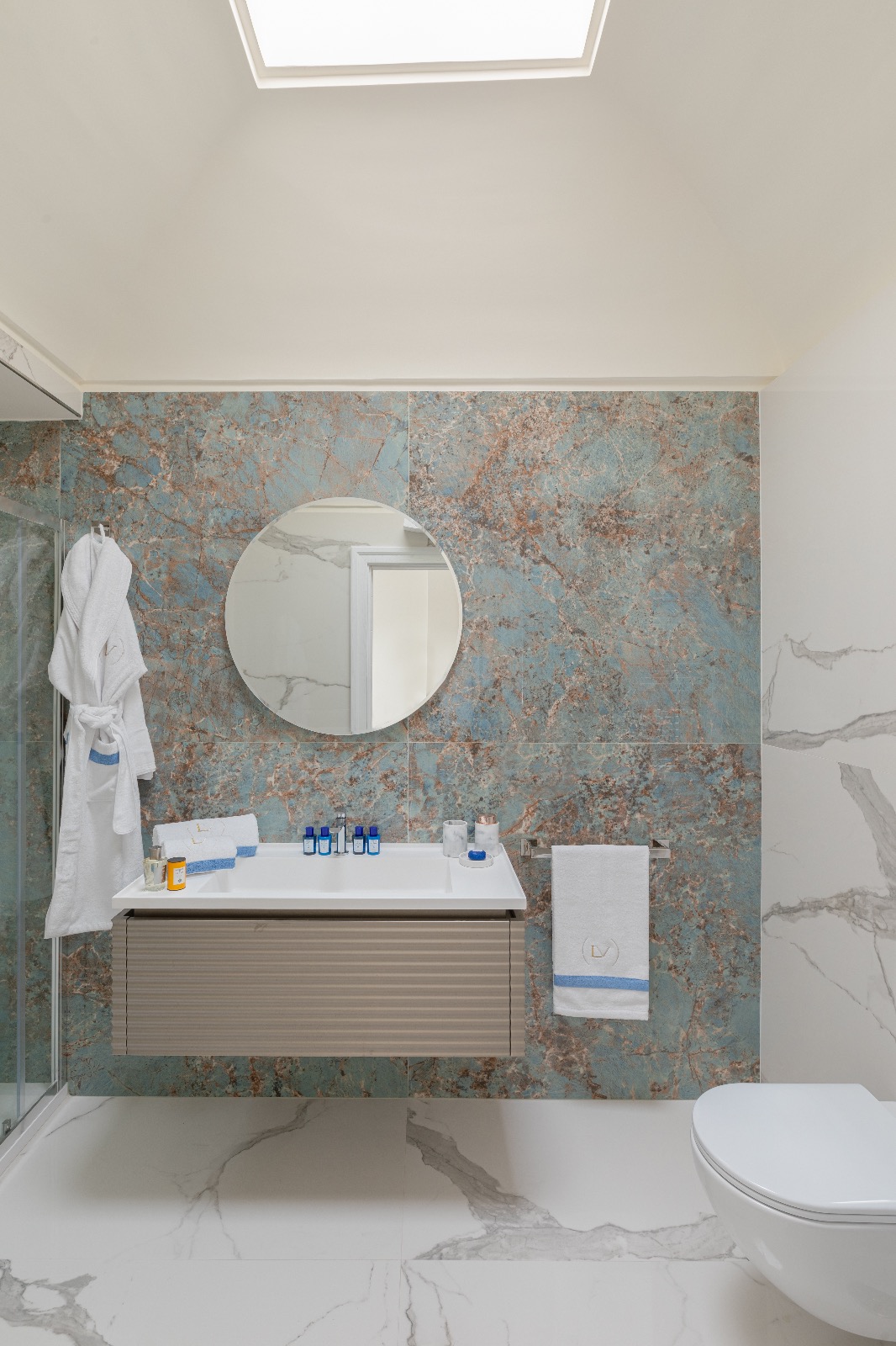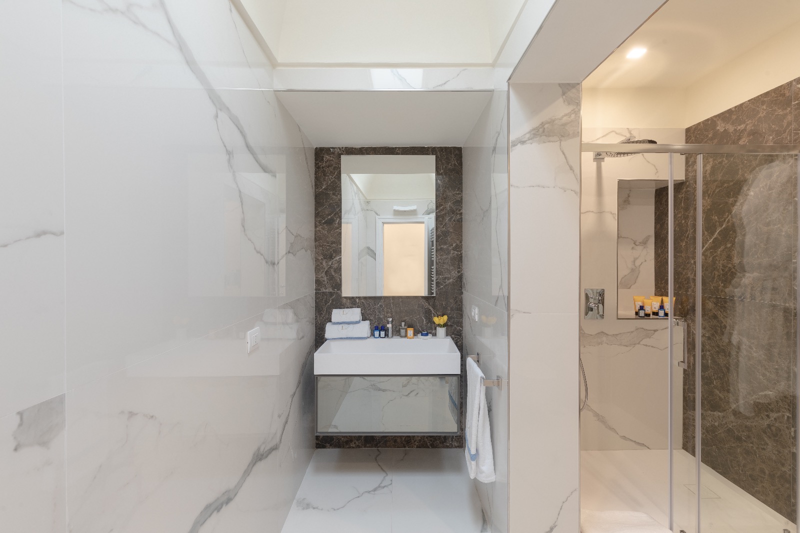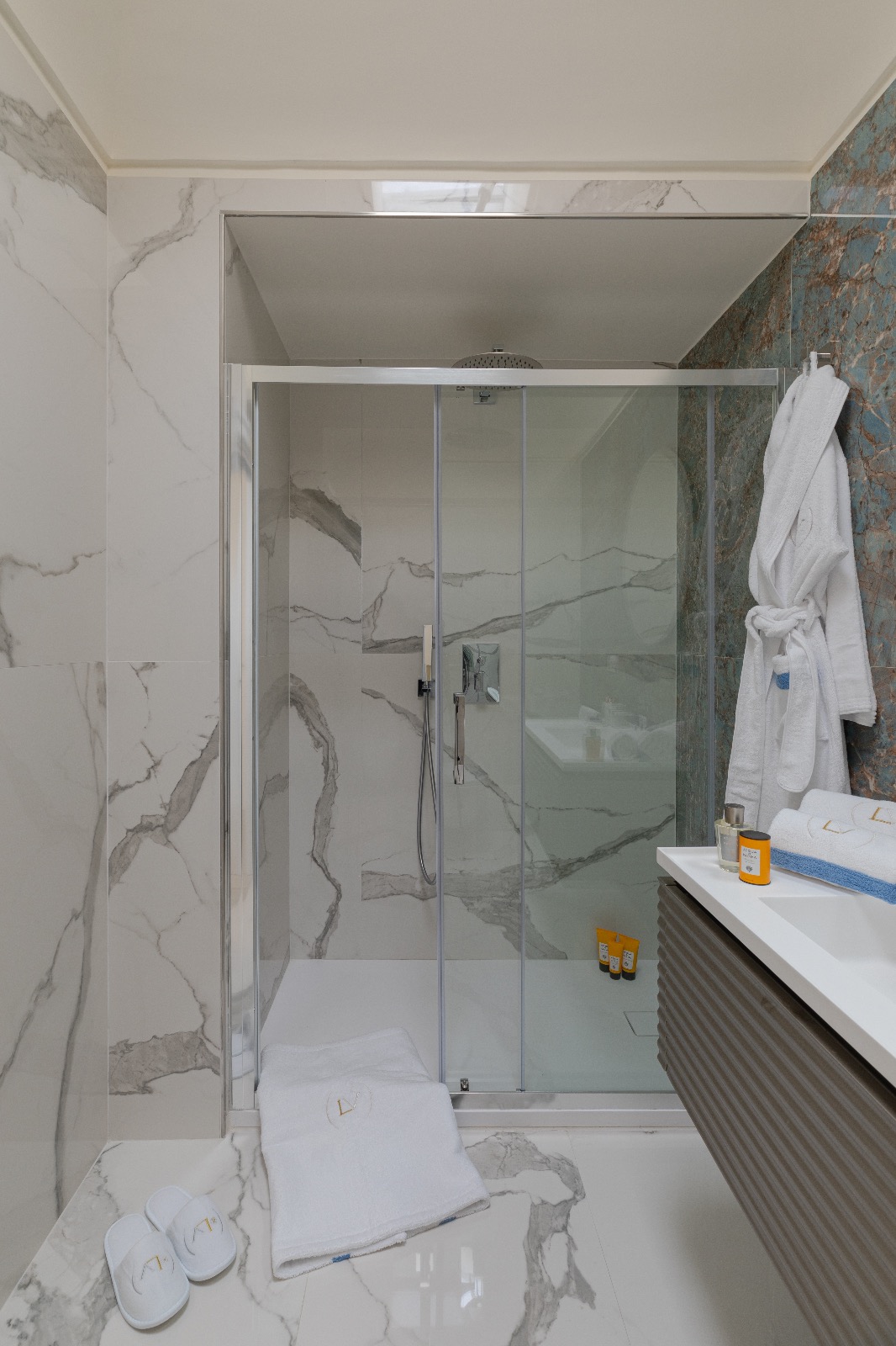 Le deuxième étage est dédié aux trois suites de repos avec lits doubles. La suite n°1 dispose d’une salle de bain attenante avec des finitions en marbre italien. Les suites n2 et n3 disposent d’une salle de bain partagée revêtue en précieux marbre blanc de Carrare.