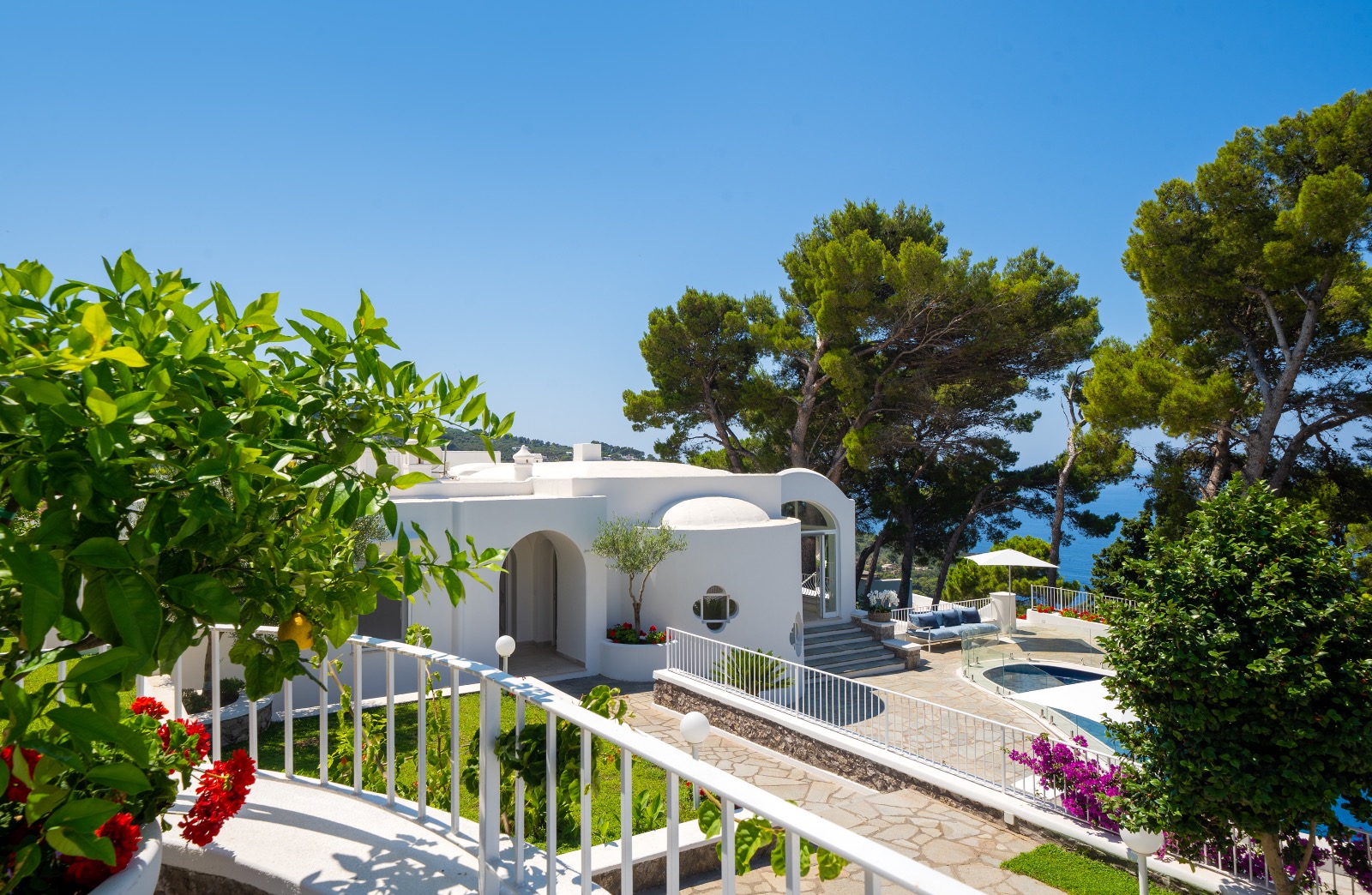 L’extension de plus de 1000 mètres carrés de la propriété, ainsi que sa position unique dans l’un des quartiers résidentiels les plus prestigieux, garantit une intimité et une détente maximales, tout en vous permettant de profiter des vues magnifiques sur la mer et des inoubliables couchers de soleil de Capri.
