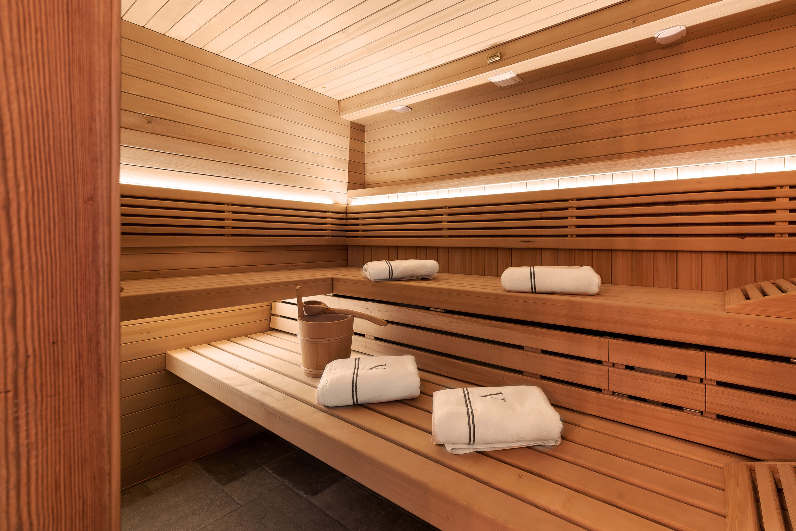 • Private year-round heated outdoor infinity pool, sauna, hot tub, and steam shower.