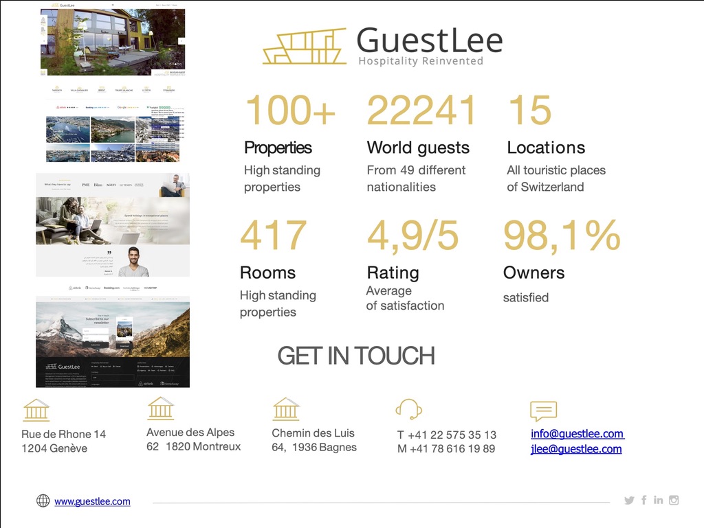 GuestLee est une société suisse innovante de gestion immobilière de luxe et de location de maisons fondée en 2016. Spécialisés dans les transactions immobilières et dans les locations de courte durée de haute qualité et desservies de A à Z, nous offrons une expérience fluide aussi bien aux propriétaires qu’aux invités.
