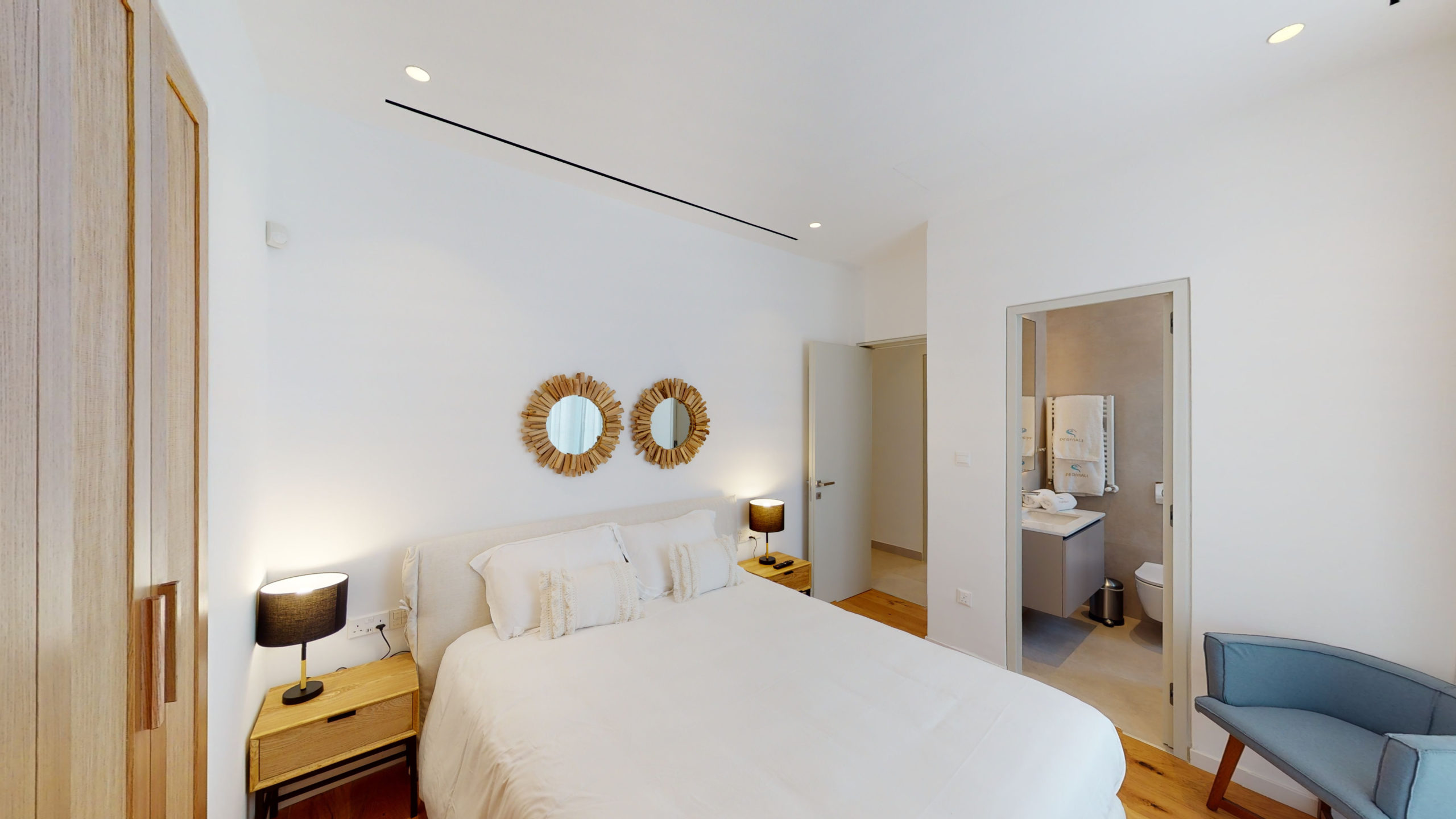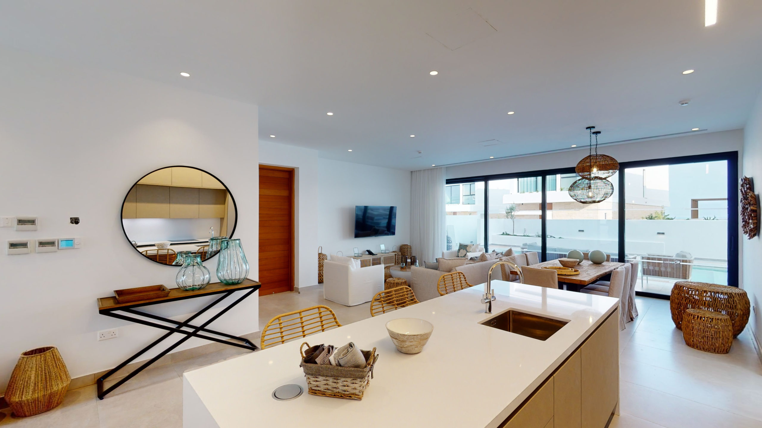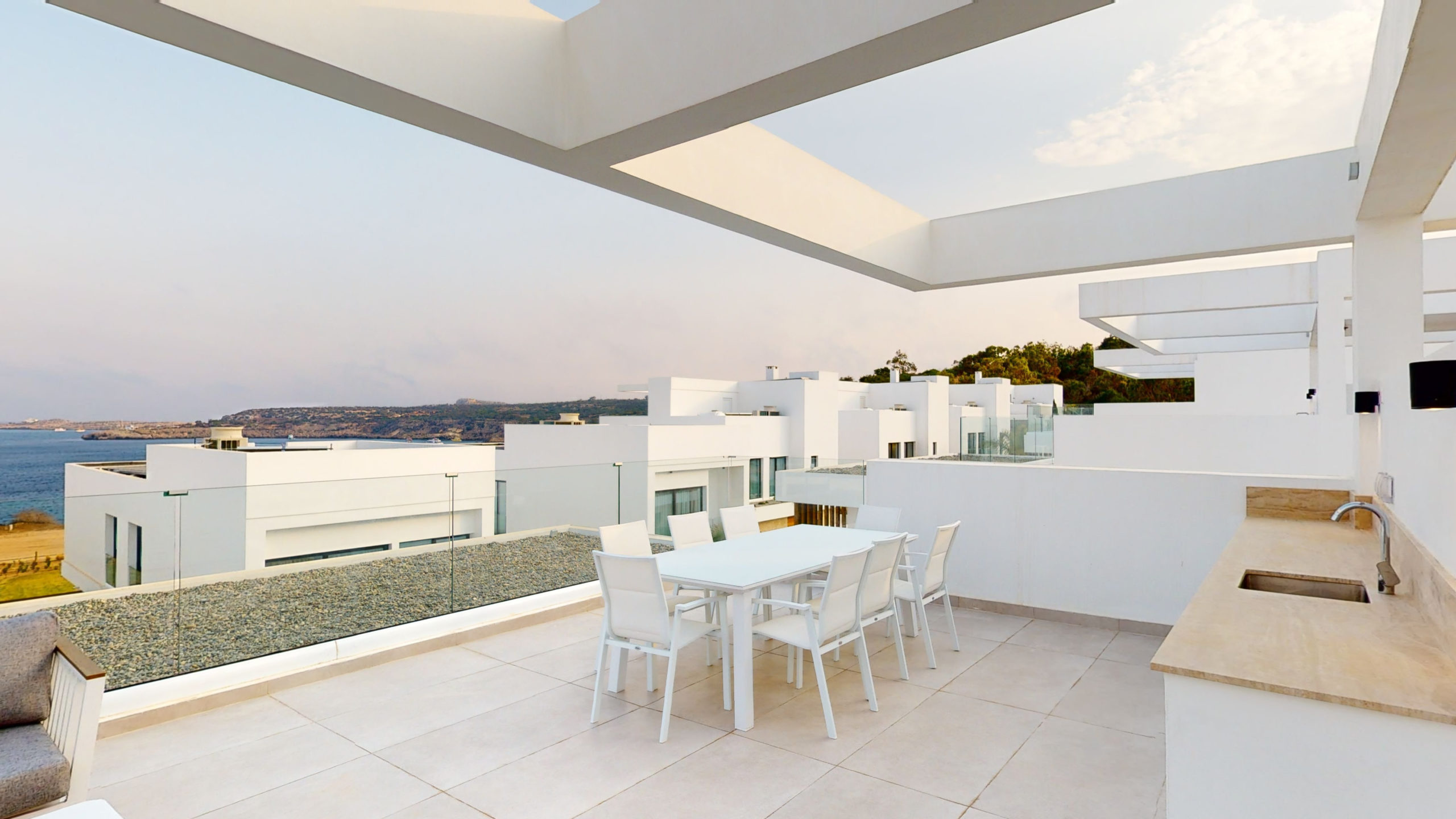 Villa Efterpi provides side-sea views of Konnos Bay. Villa Efterpi is fully furnished and comes with contemporary luxury lifestyle amenities and interior design fittings. The villa offers a stunning living room space, modern cooking facilities, inside and outdoor dining and chill-out furniture, TV, surround sound, and first-floor bedrooms with side views of the bay. The villa is fully air-conditioned, fitted with an elevator, and has its own private garage. There is a gorgeous private pool with sunbathing deck.