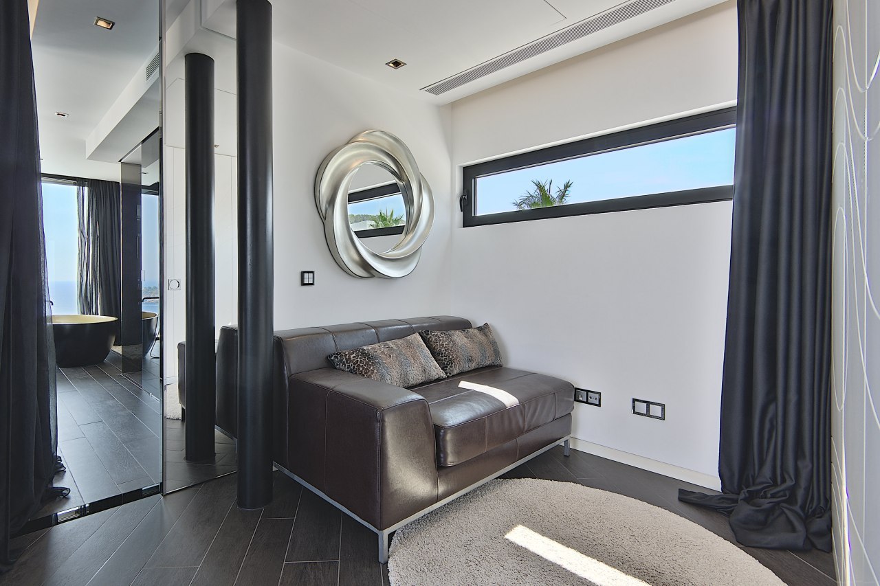 The master bedroom, located on the first floor, features a round bed and a ceiling-mounted TV. You’ll find the ocean views from the bathroom absolutely stunning. On the large terrace, relax in your private jacuzzi and enjoy the cozy lounge areas designed for both relaxation and socializing.