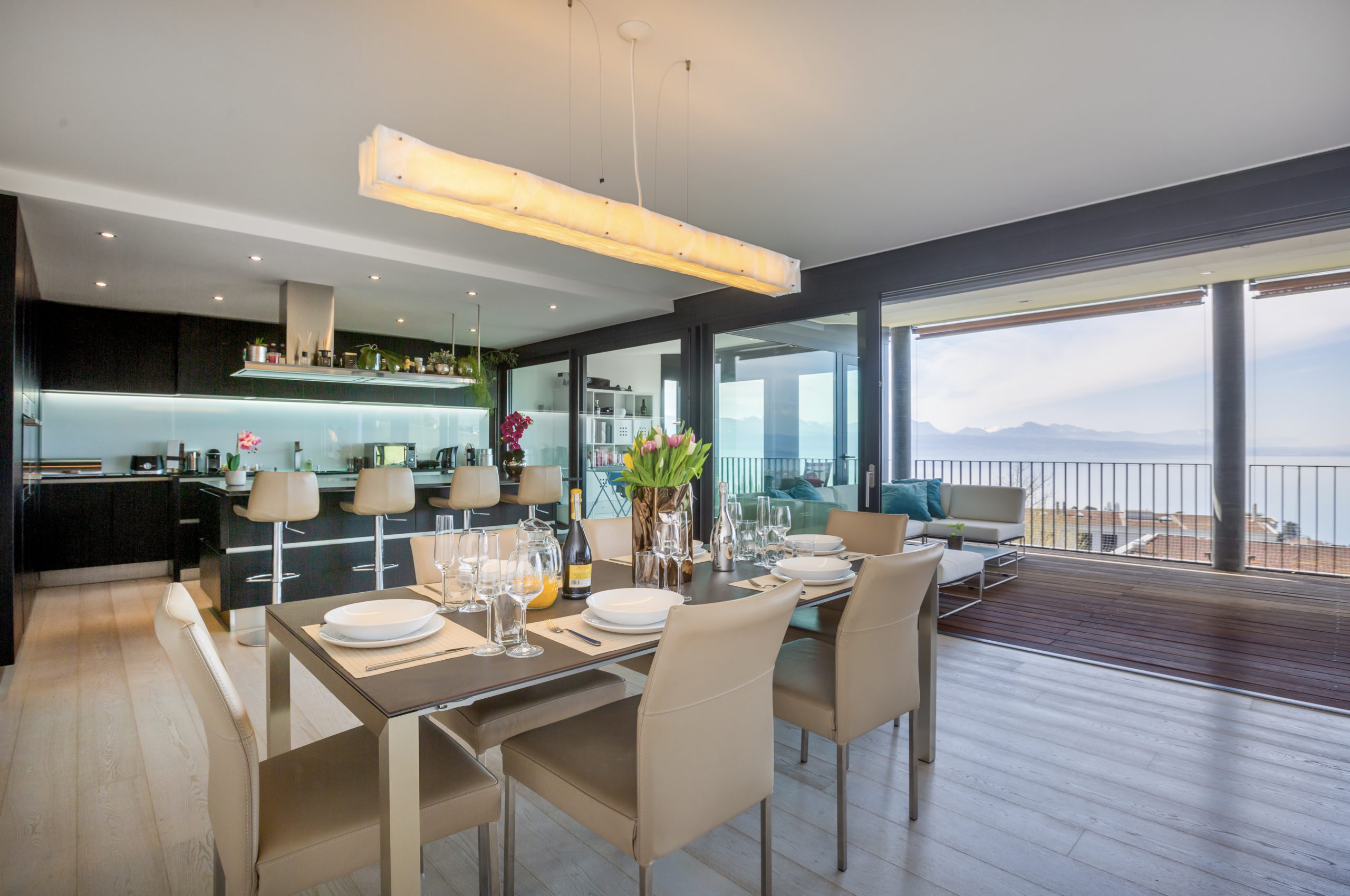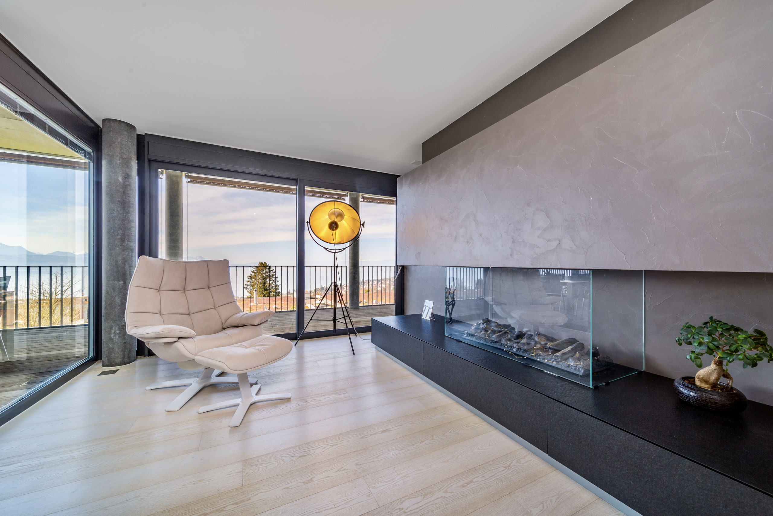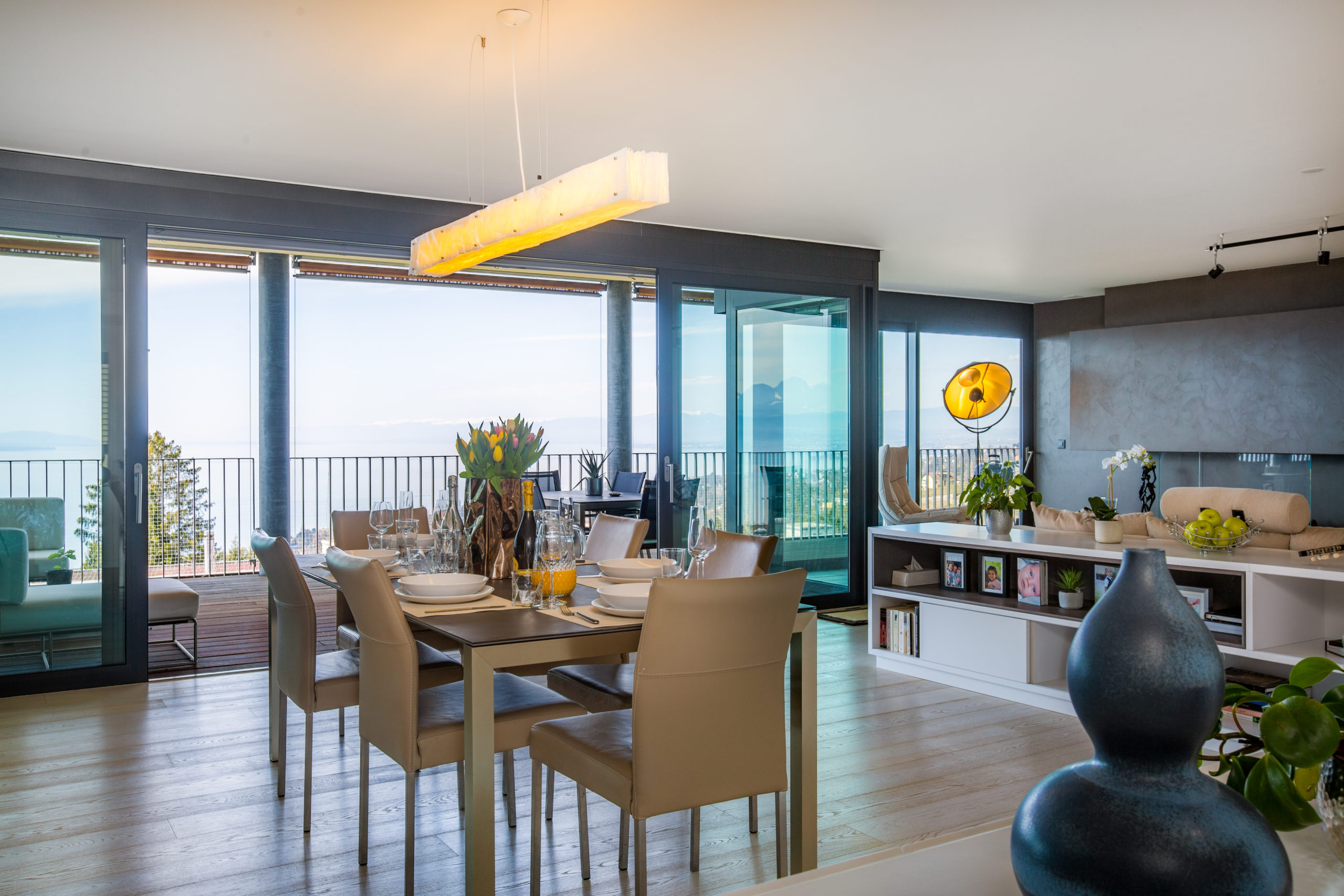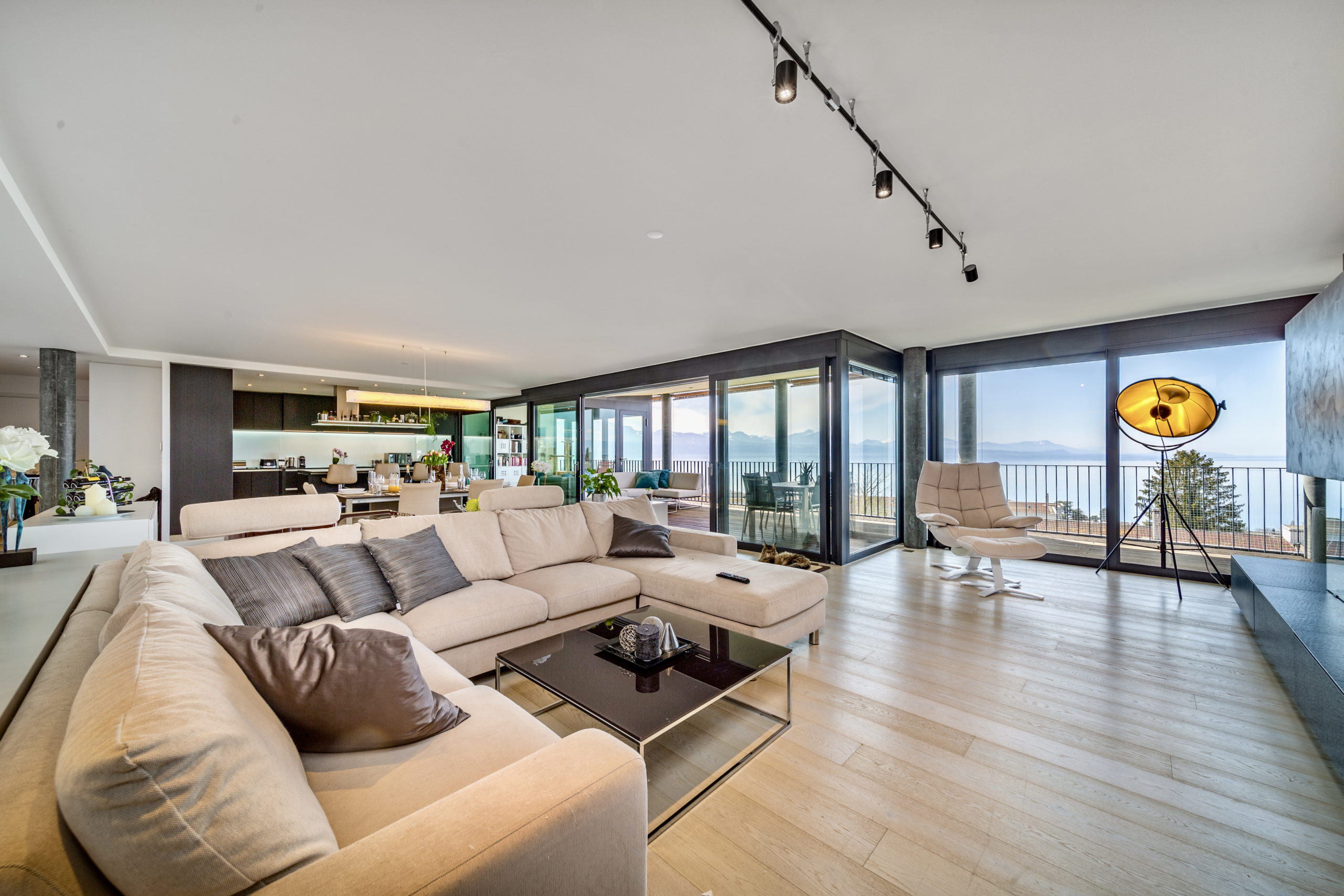 This extravagant penthouse is spread over 200 sq.m2 offering complete privacy and uninterrupted lake views of the Leman and the Swiss Alps.