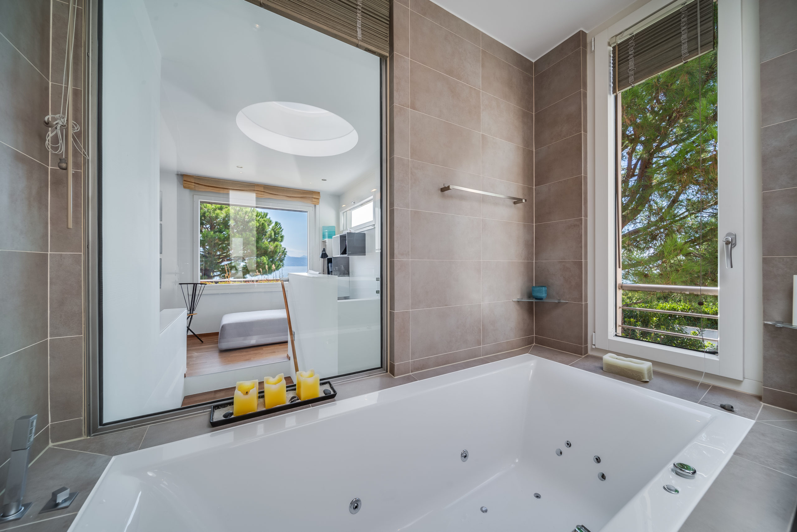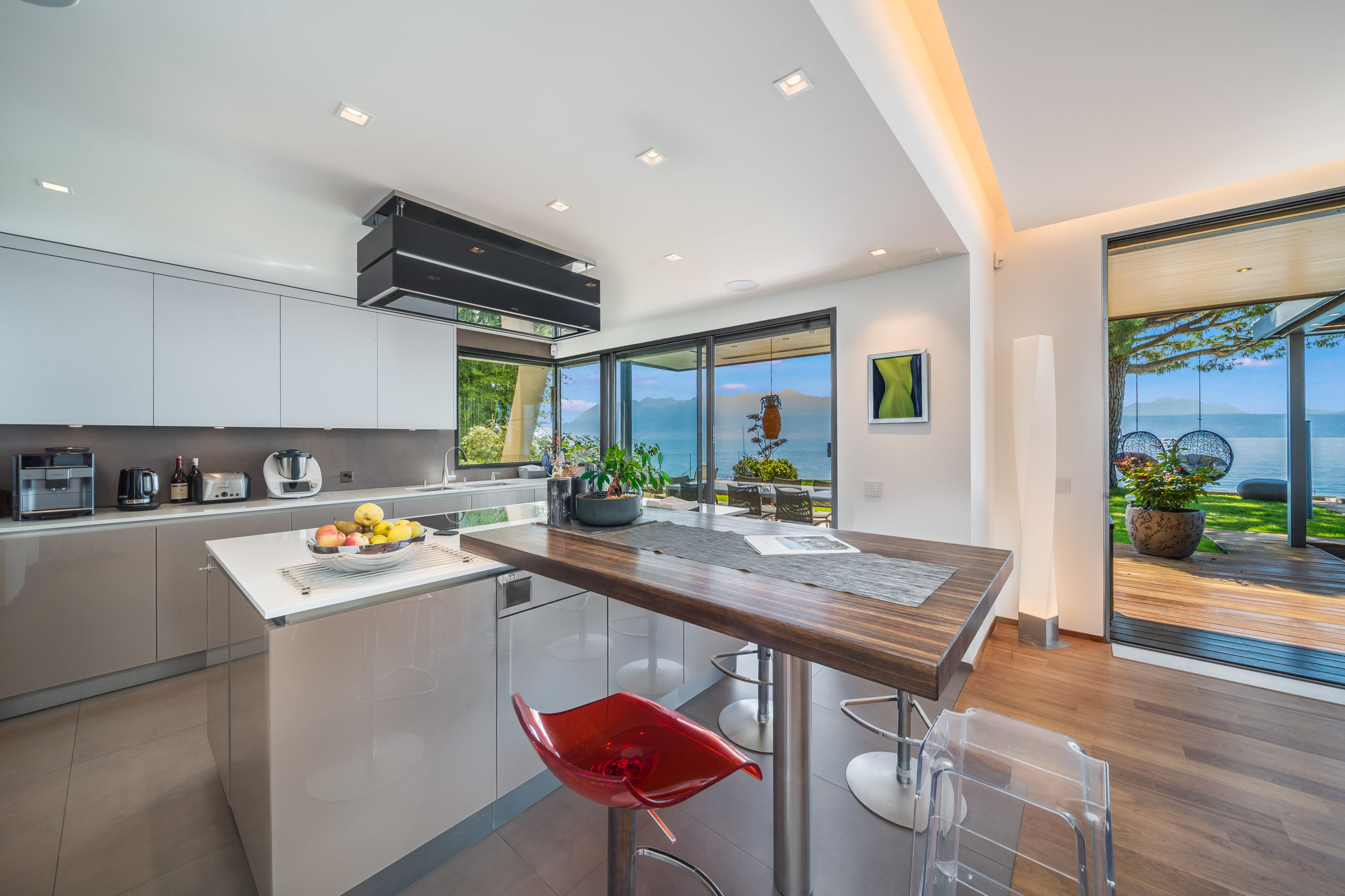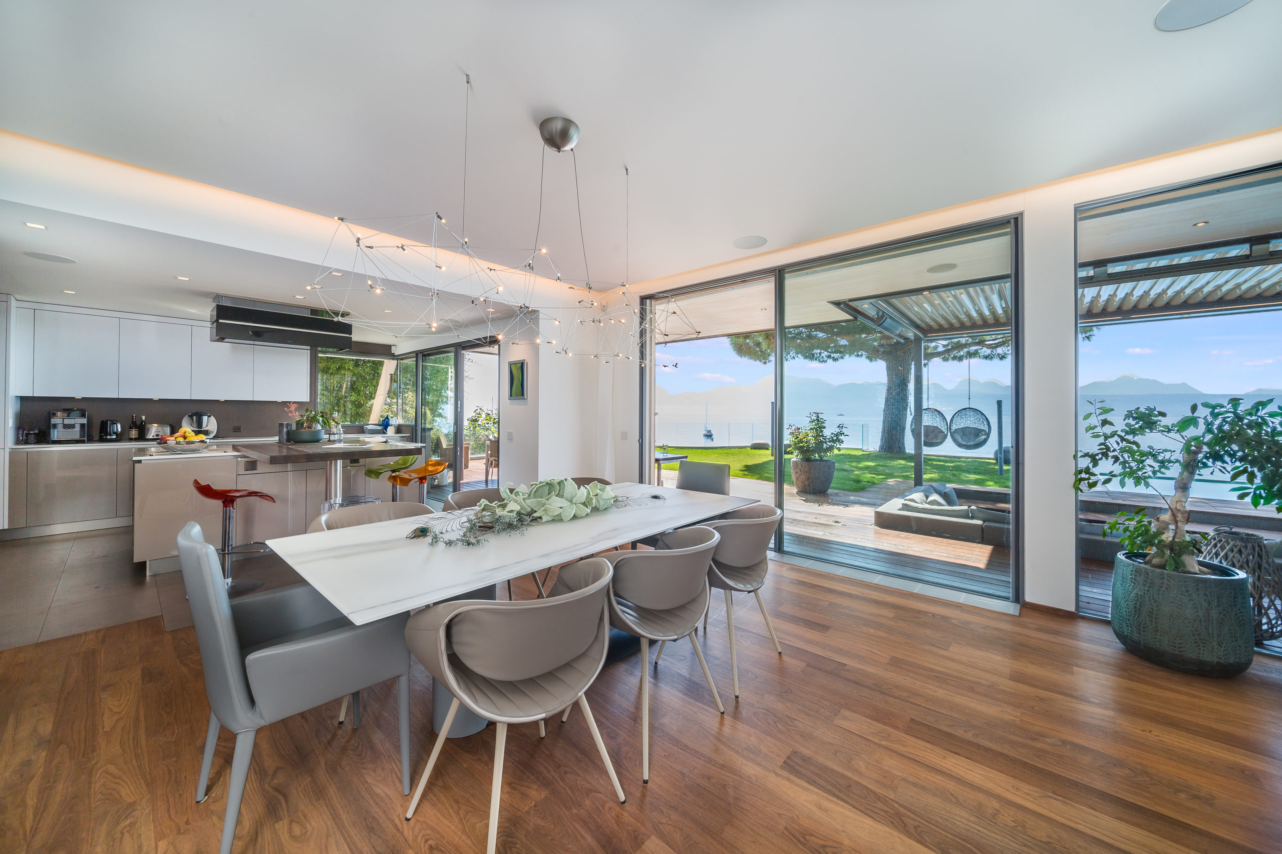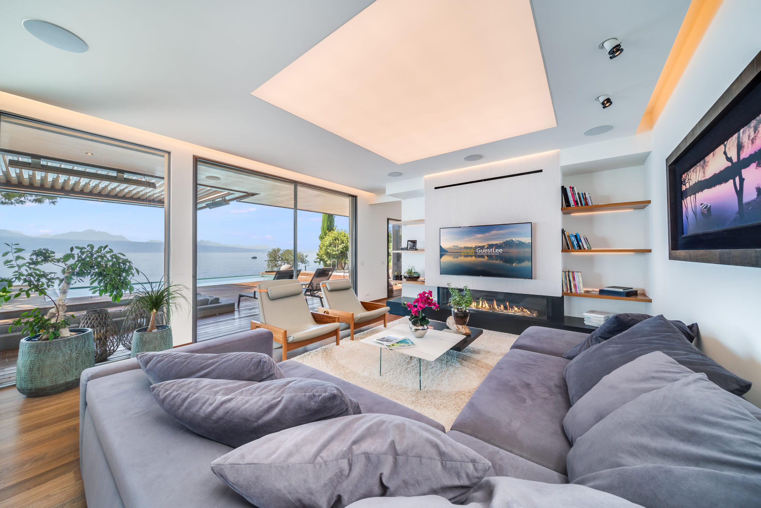 Modern Design & Floor-to-Ceiling Windows: Step into a world of contemporary sophistication as you enter this meticulously designed villa. The sleek, modern interiors are complemented by floor-to-ceiling windows that flood every room with natural light and provide uninterrupted views of the lake and mountains.
