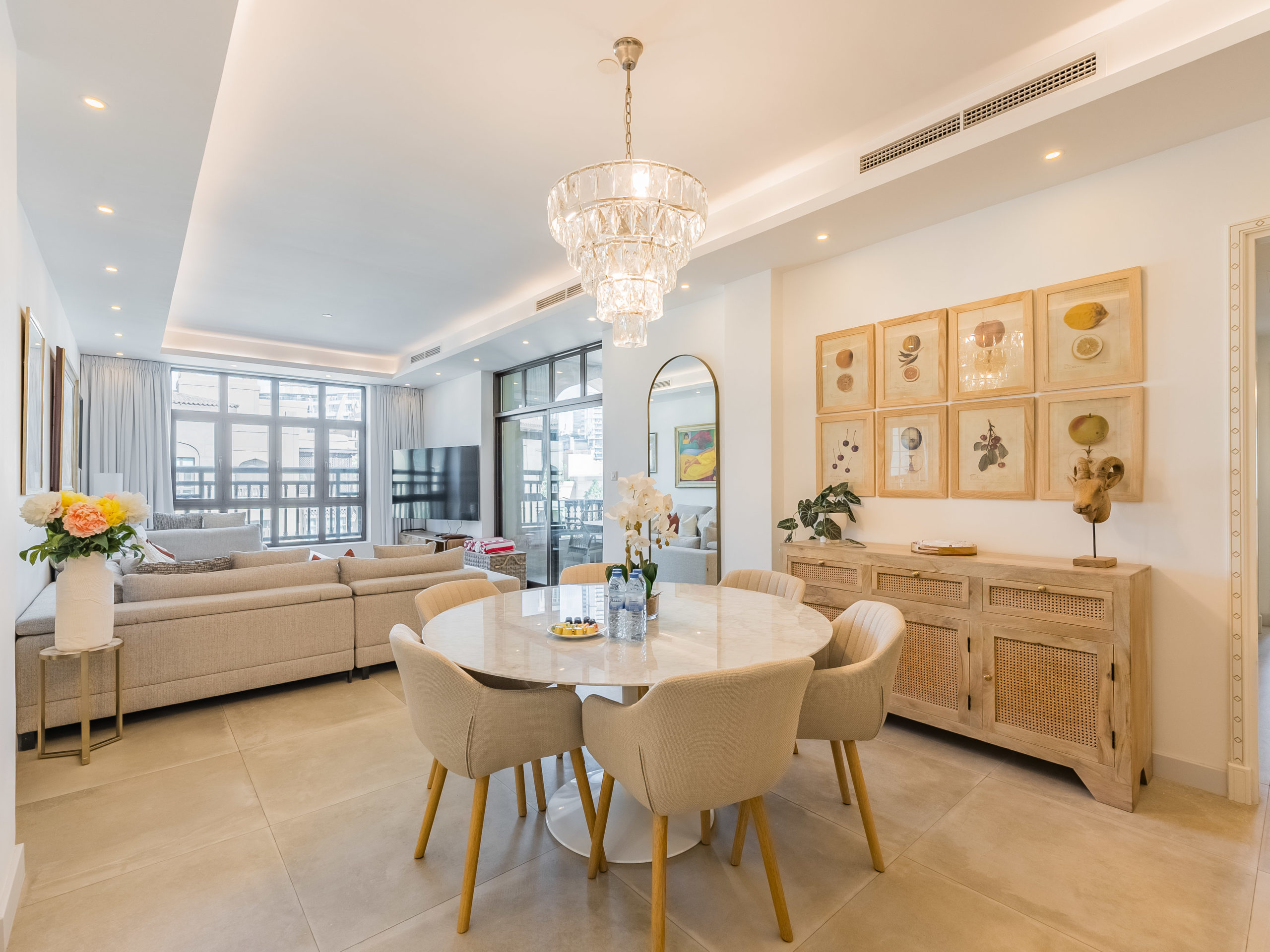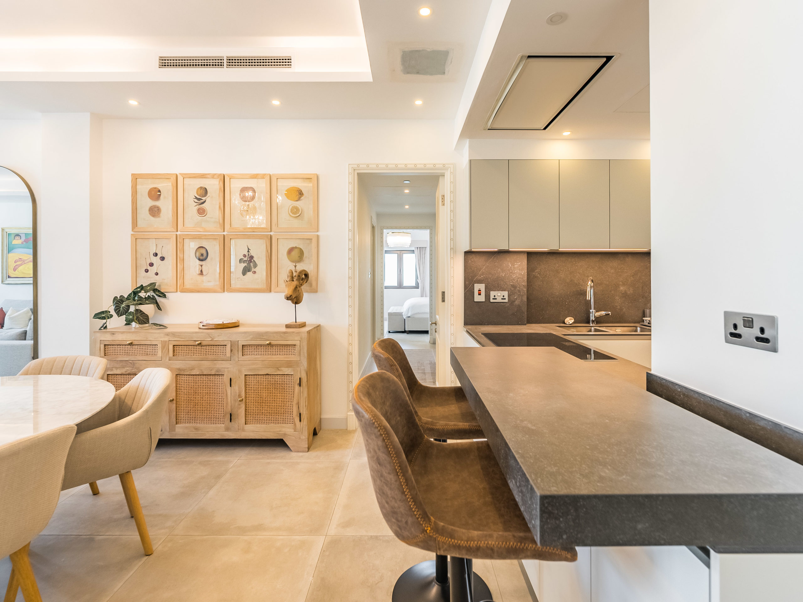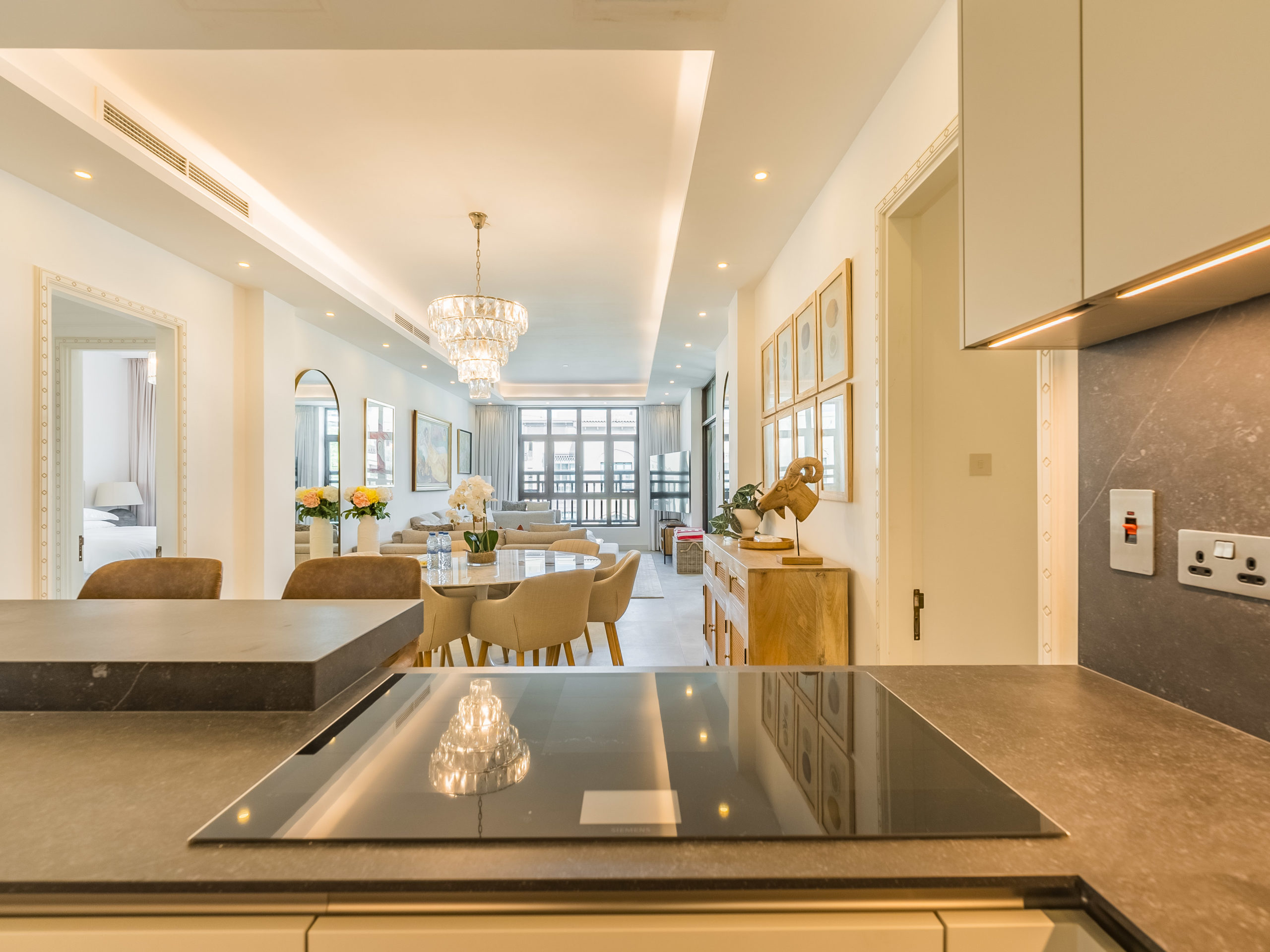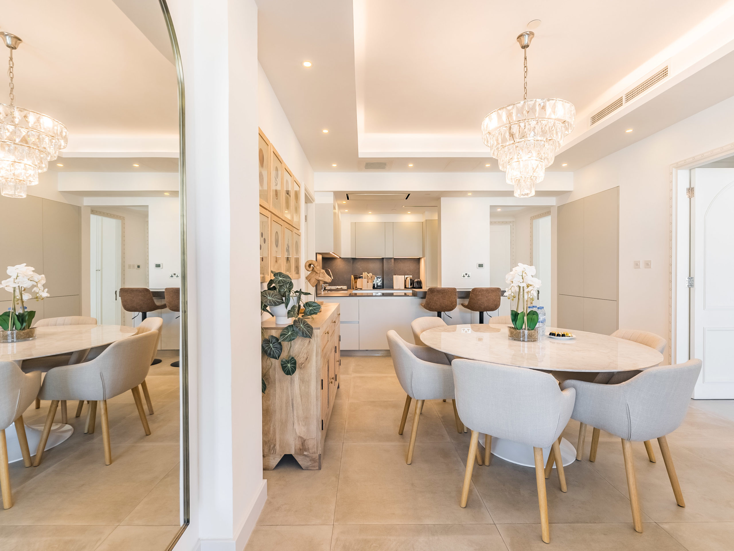 The two main bedrooms are fitted with queen-sized beds, ensuring a restful stay. The maid’s room, which can be used as an additional sleeping space, adds flexibility for families or small groups. The apartment’s two modern bathrooms feature high-end fixtures, providing a spa-like experience with sleek designs and premium finishes.