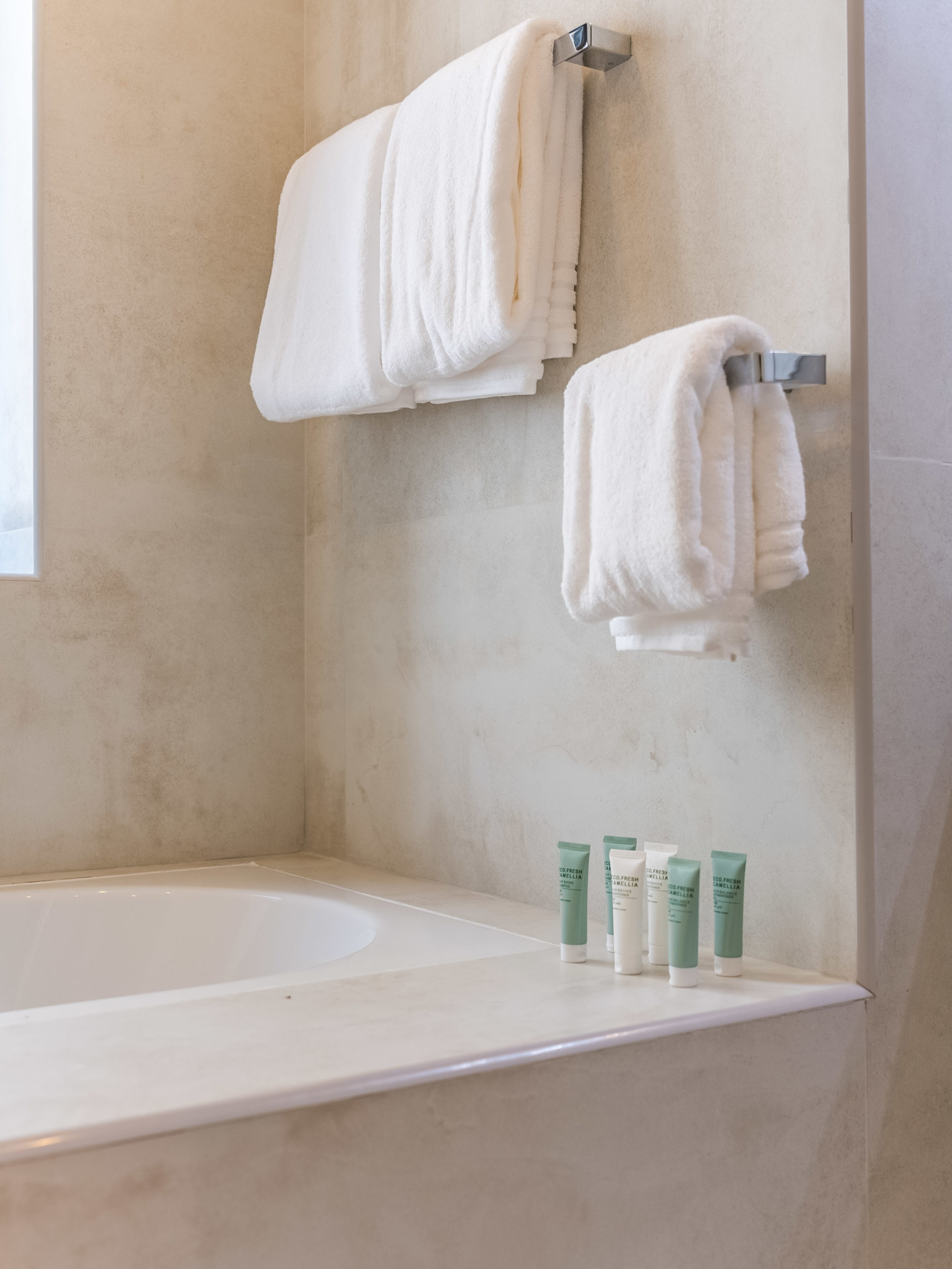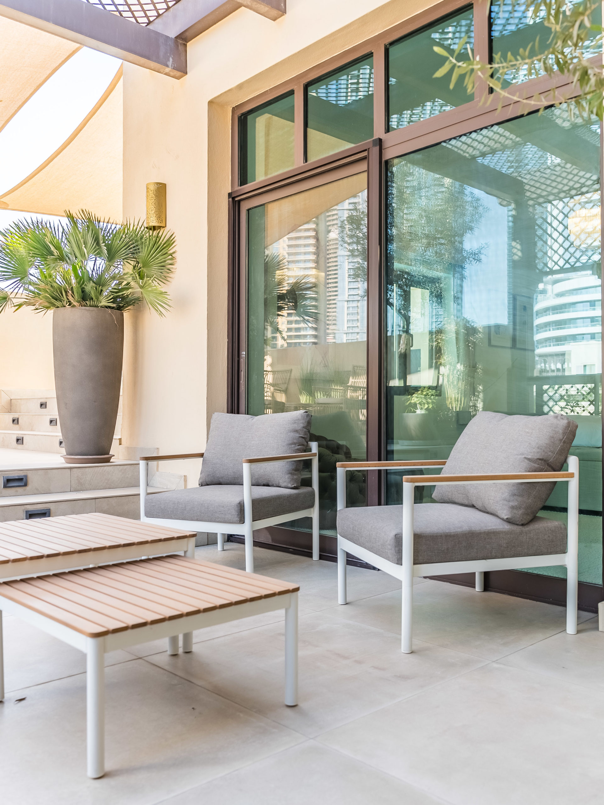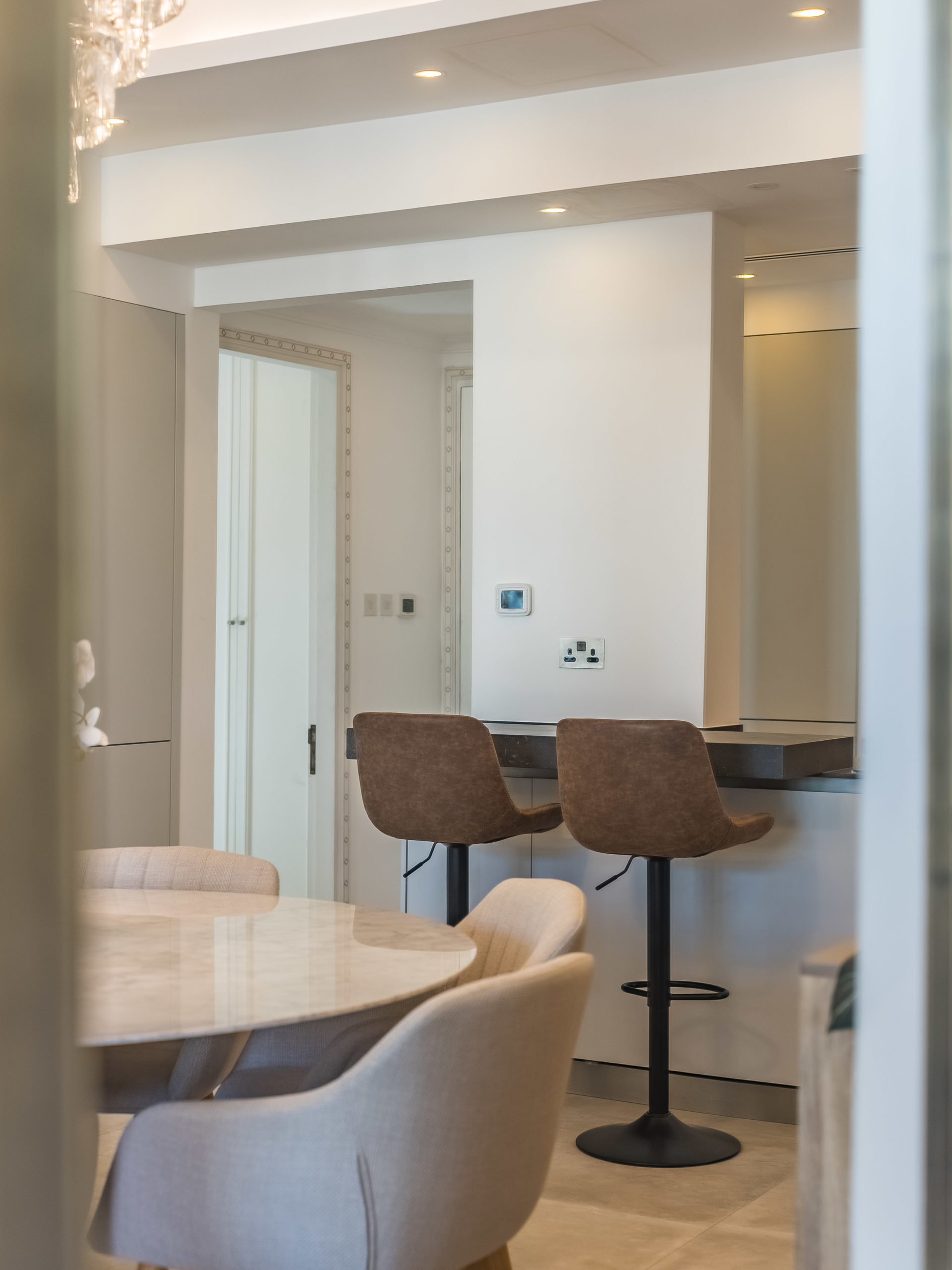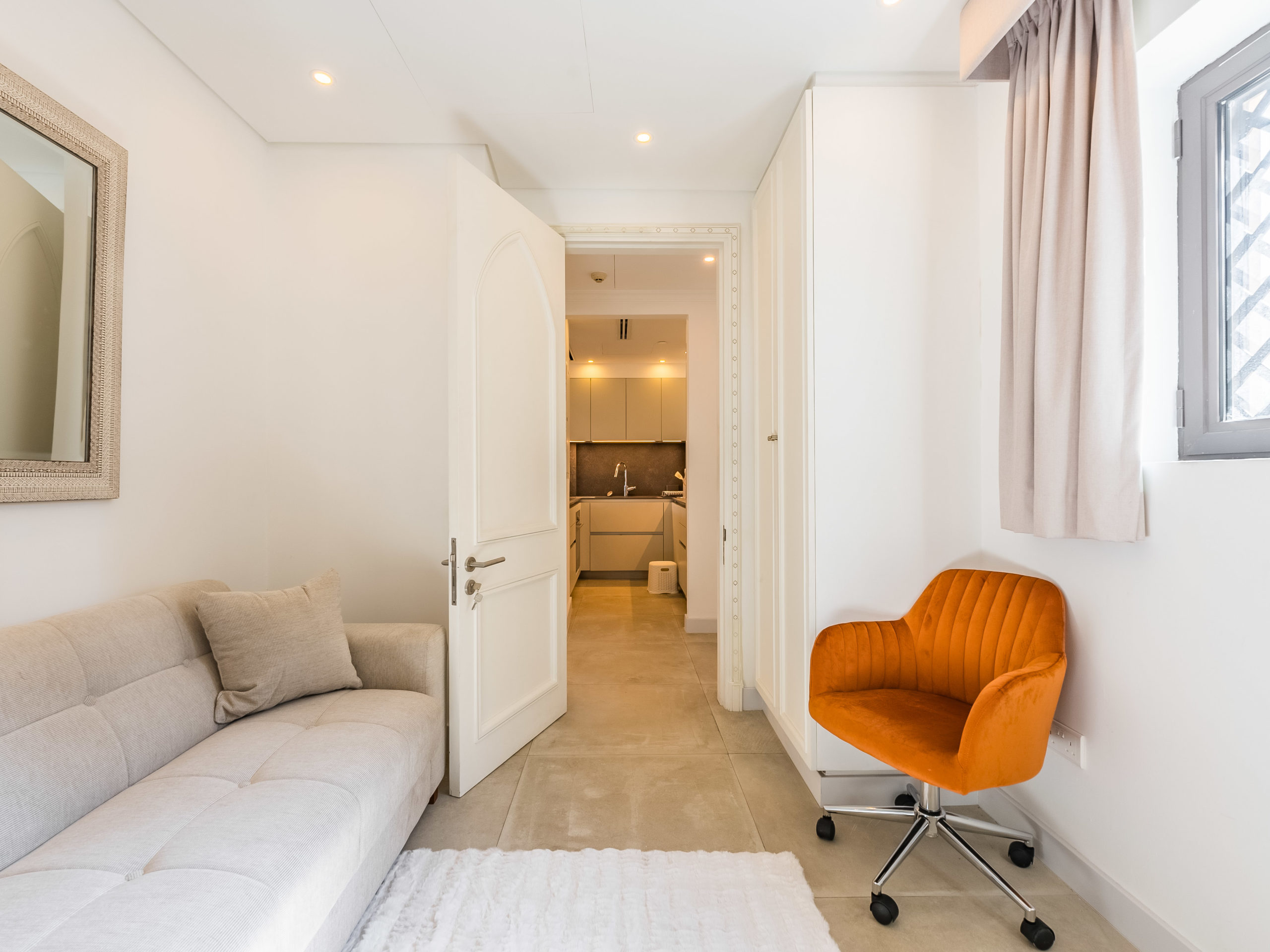 The two main bedrooms are fitted with queen-sized beds, ensuring a restful stay. The maid’s room, which can be used as an additional sleeping space, adds flexibility for families or small groups. The apartment’s two modern bathrooms feature high-end fixtures, providing a spa-like experience with sleek designs and premium finishes.