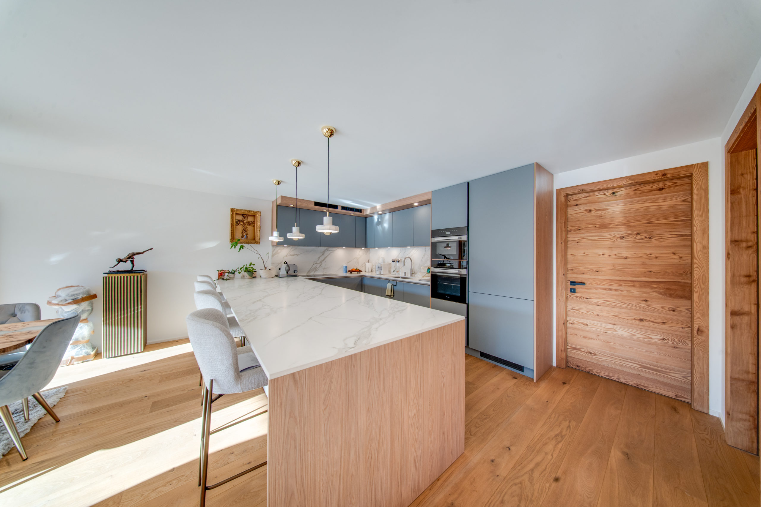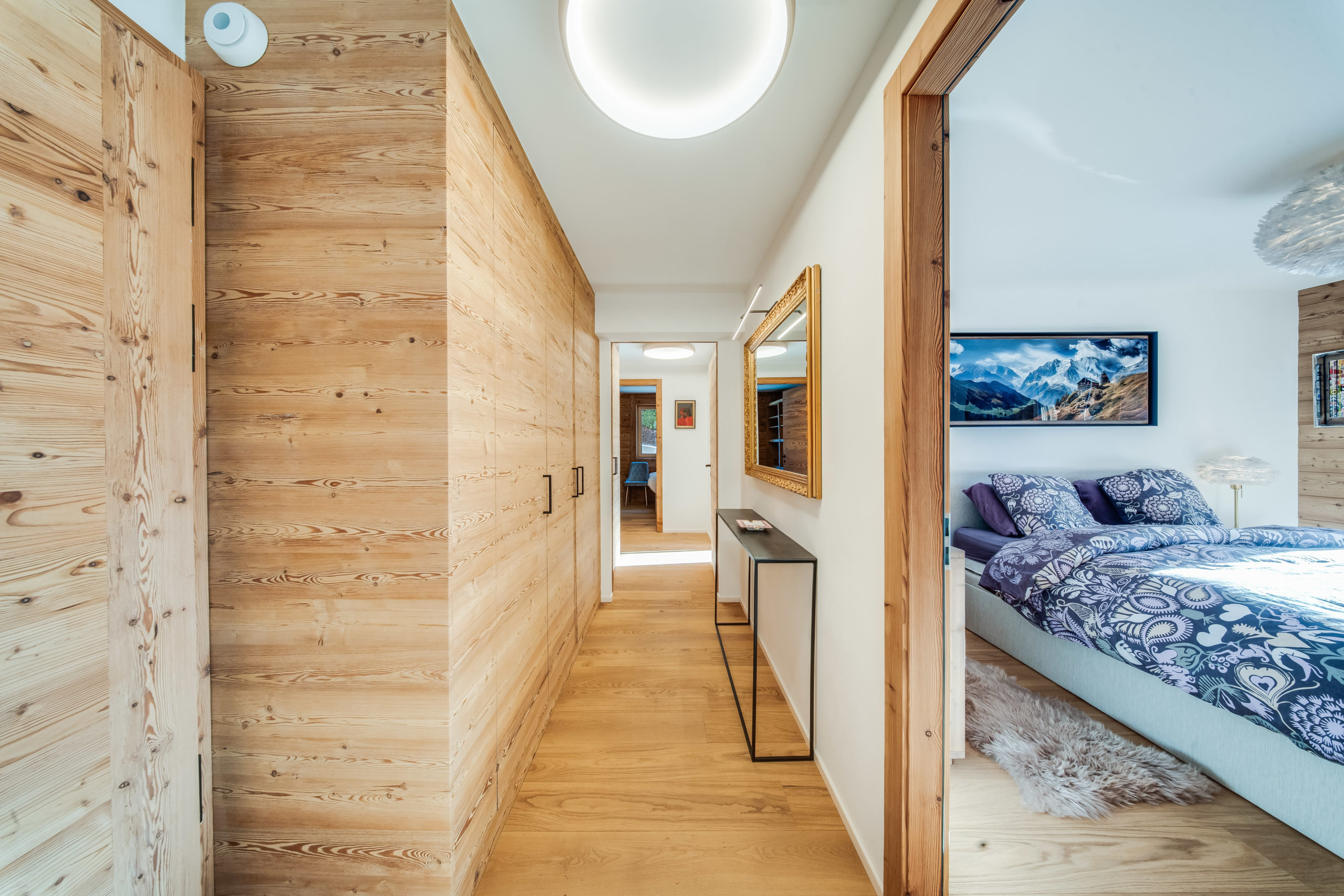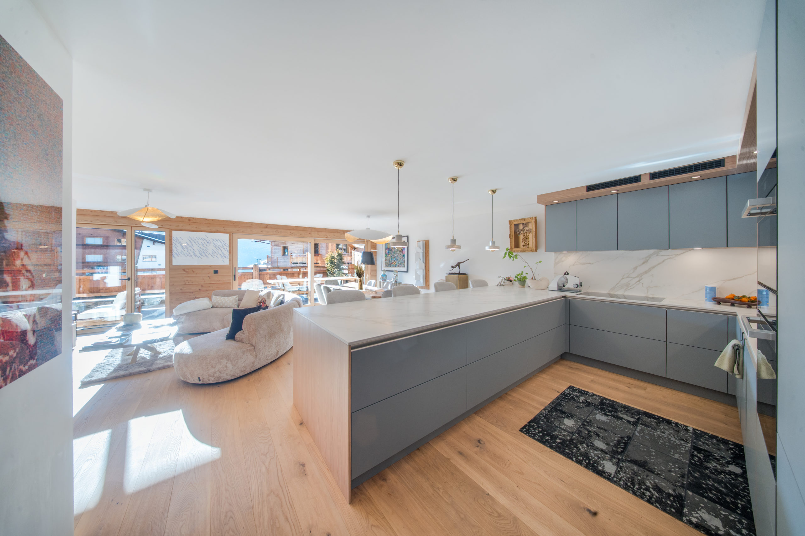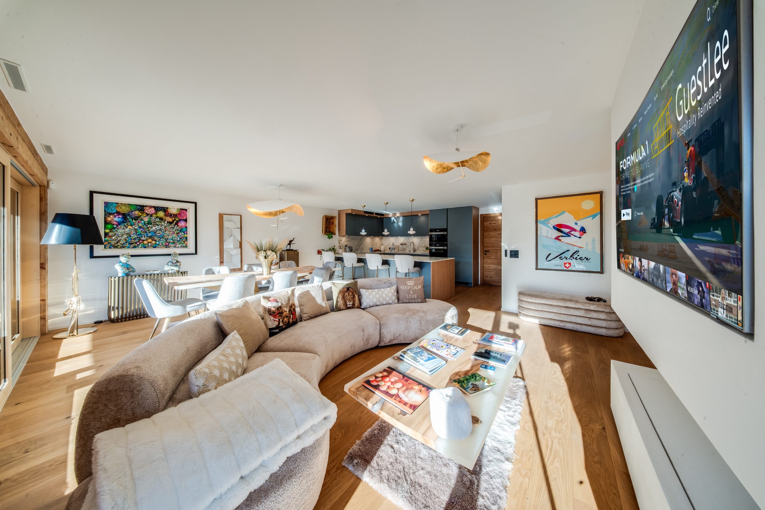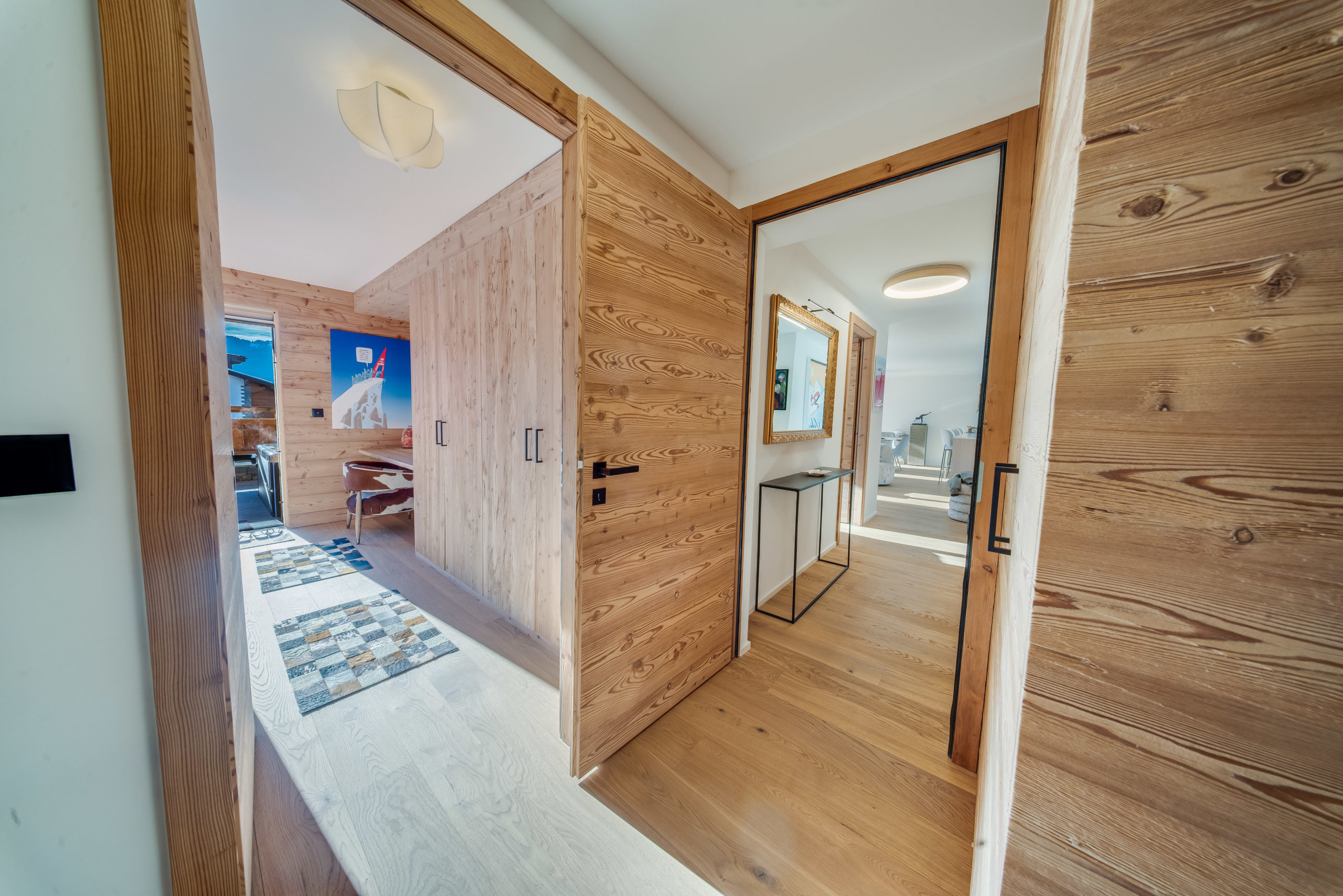 All on one level, with elevator access and generous living spaces, the apartment is perfect for families, groups, or wellness retreats looking for a premium stay in Switzerland’s most iconic mountain resort.