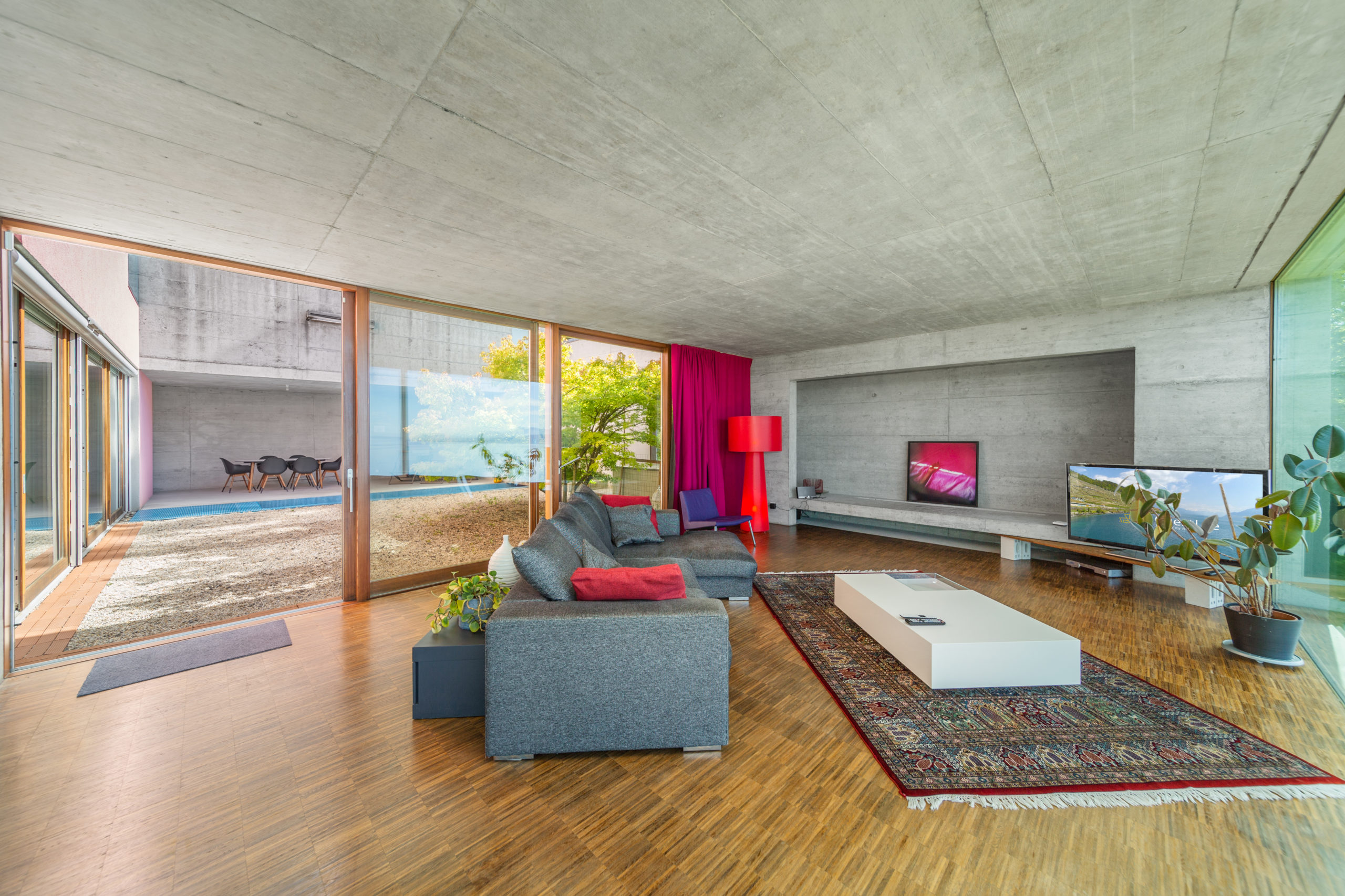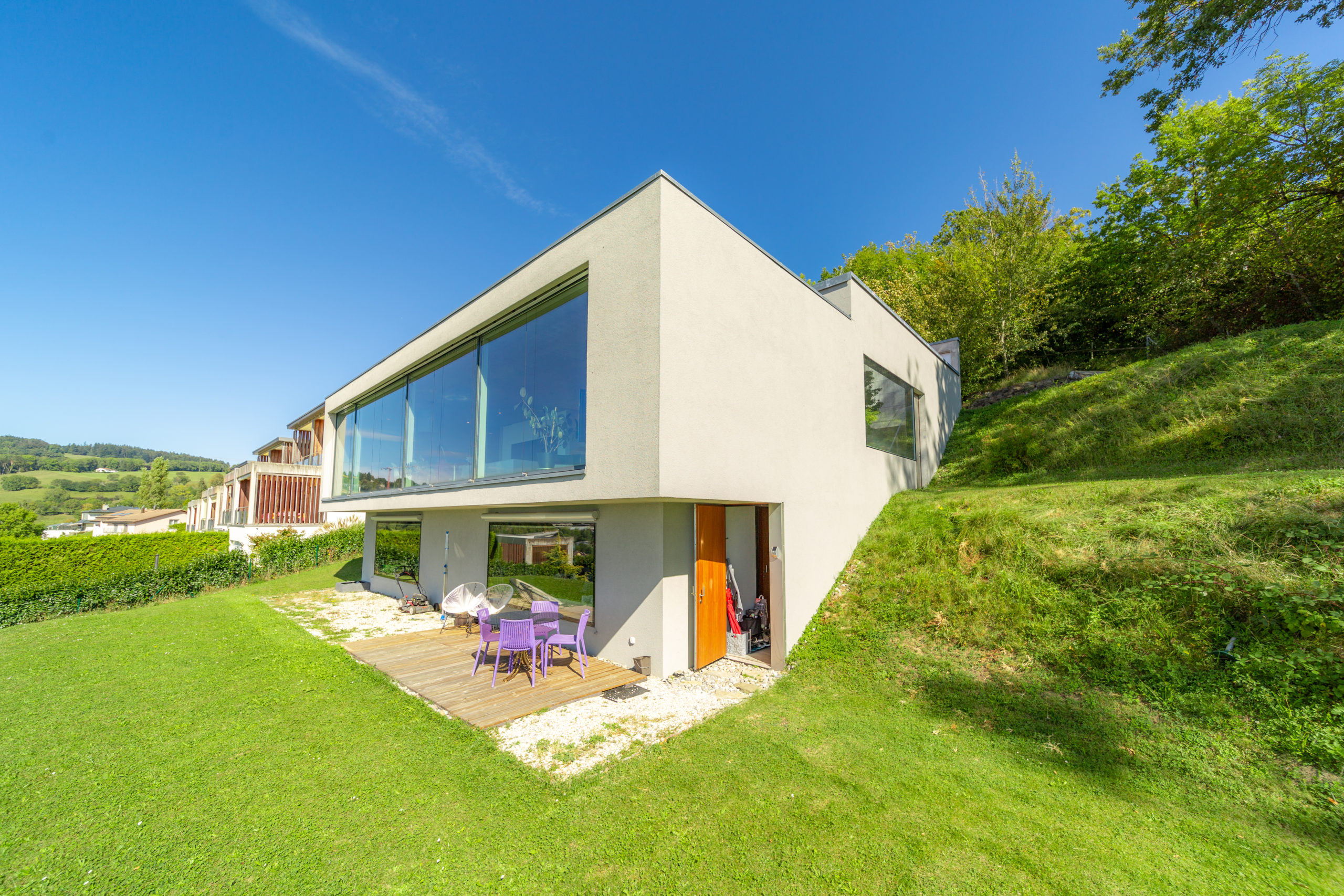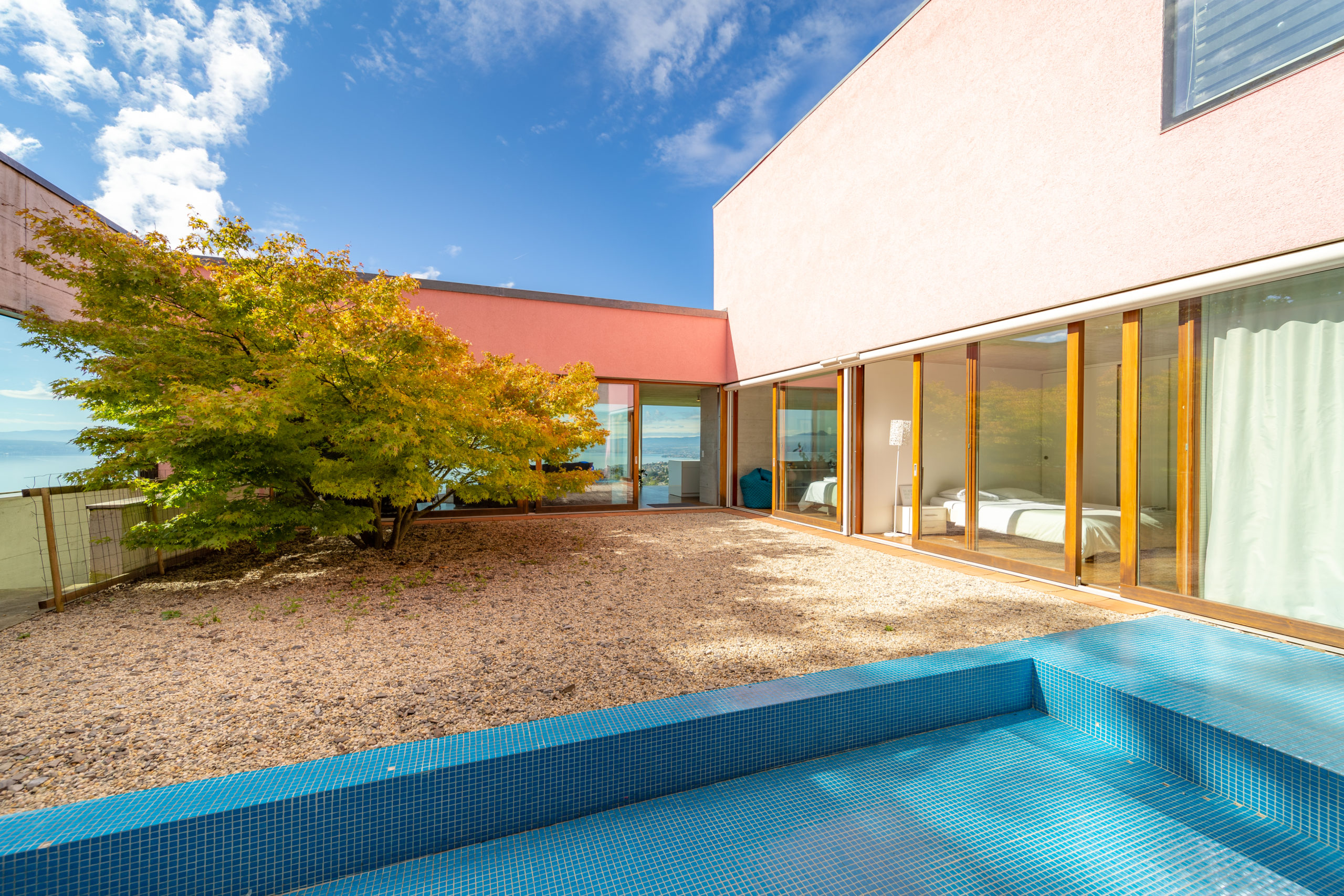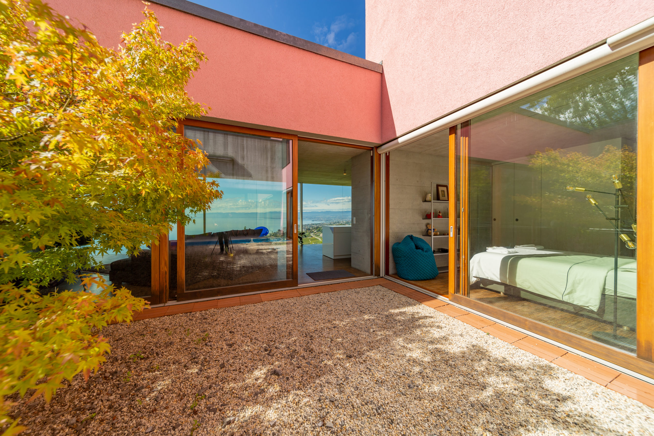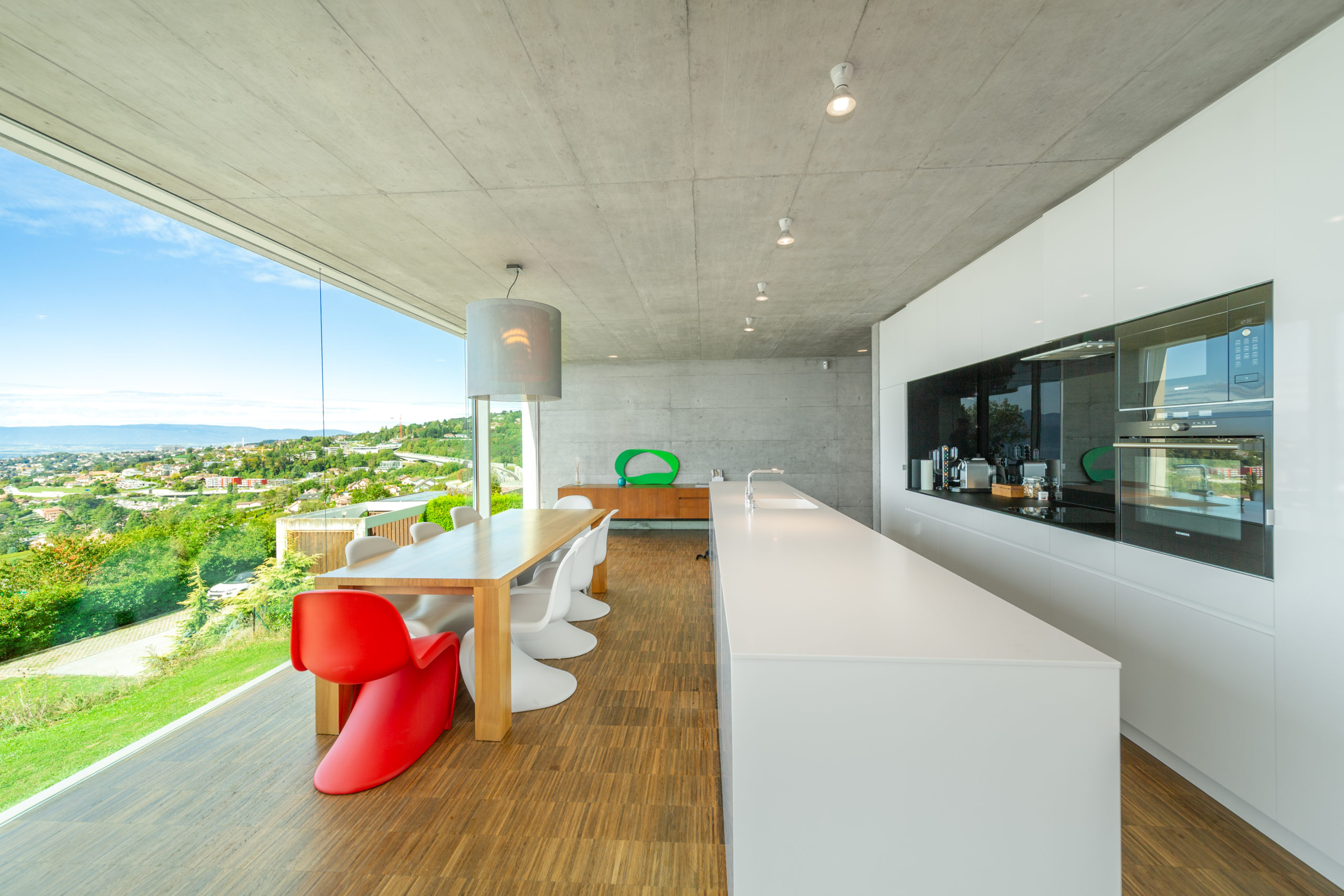 On the same floor, you have access to the large private garden with a panoramic view of the Lake and the Swiss Alps. There is also a garage that can accommodate between 3 and 5 vehicles.