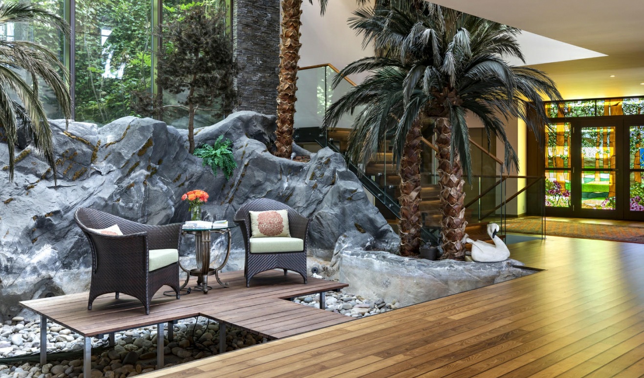 • Mediterranean courtyard with rare trees for privacy.