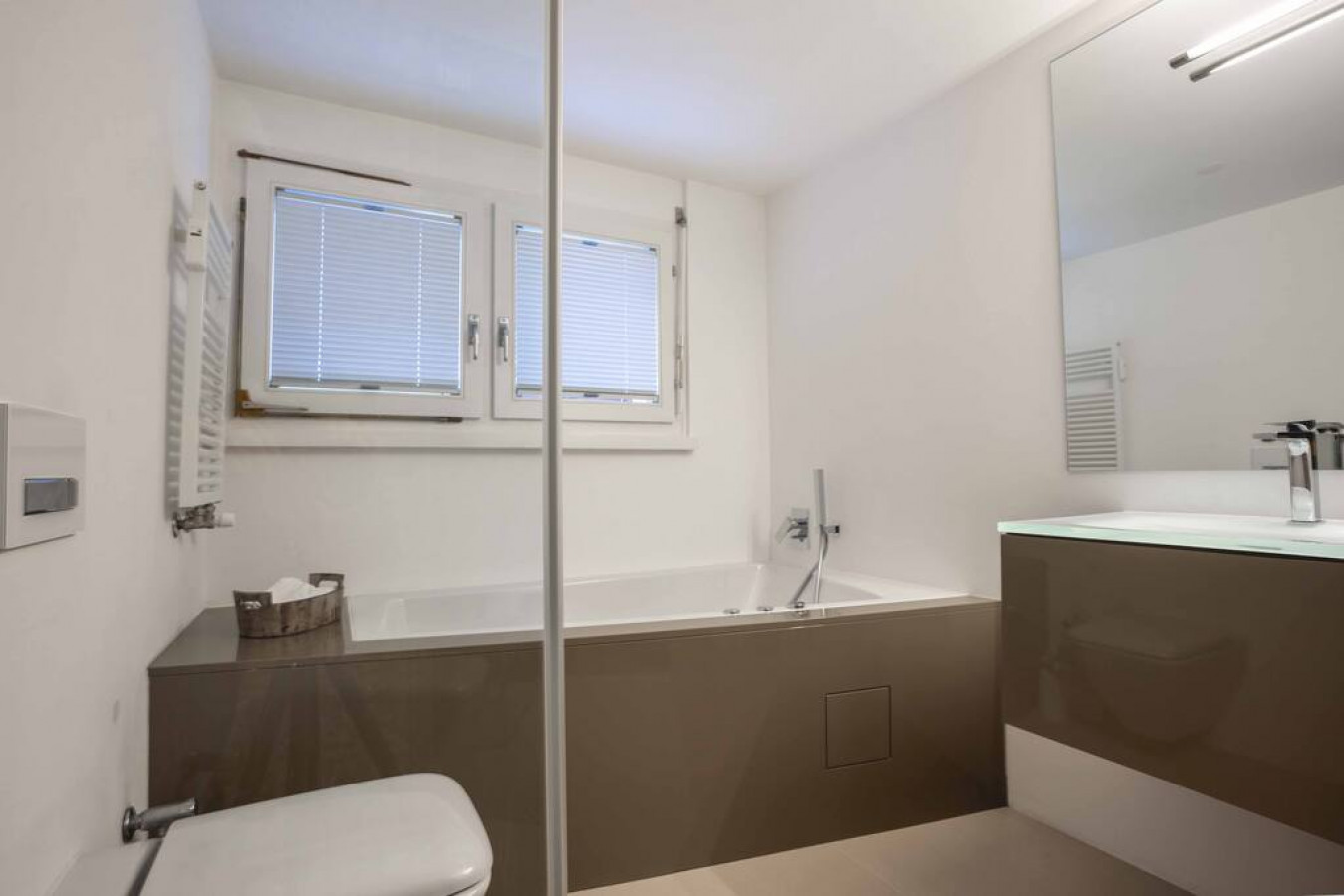 The apartment is thoughtfully designed with both comfort and elegance in mind. It features two spacious bedrooms and one smaller bedroom, offering ample space for all guests. The modern bathroom includes both a bathtub and a shower, providing a perfect spot to relax after a day of skiing or exploring the beautiful surroundings.