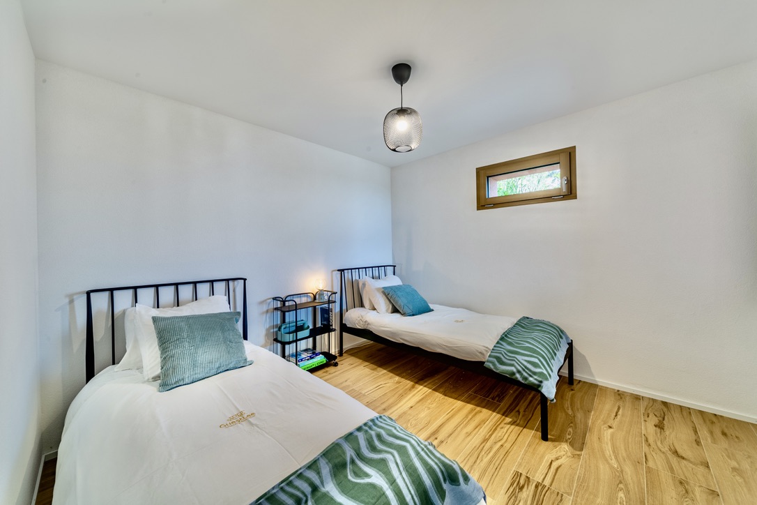 Moreover, the lower floor is a haven of relaxation. It includes three generously sized bedrooms and beautifully appointed shared bathrooms. This level also opens to the garden and additional terraces, offering perfect spots for outdoor enjoyment.