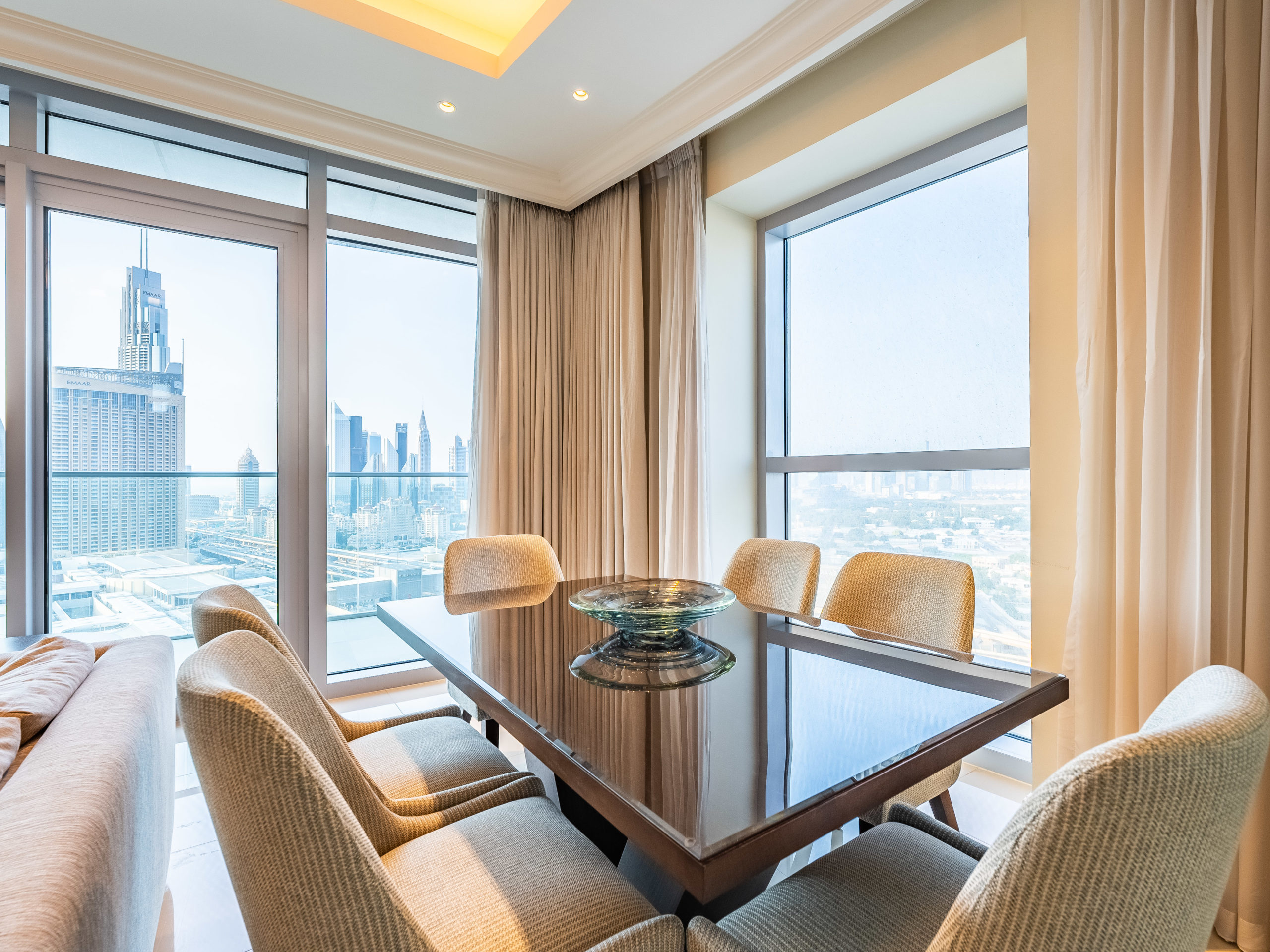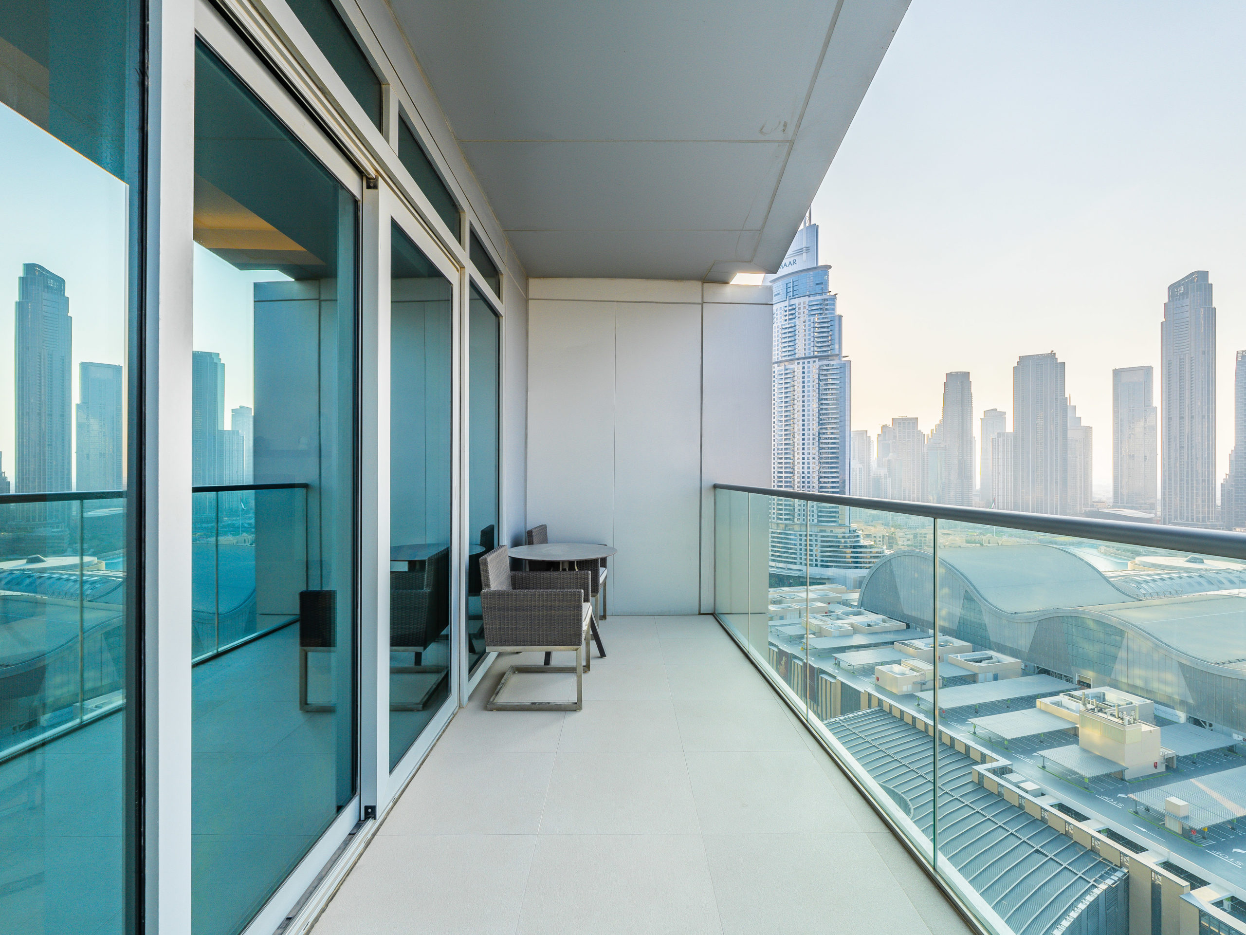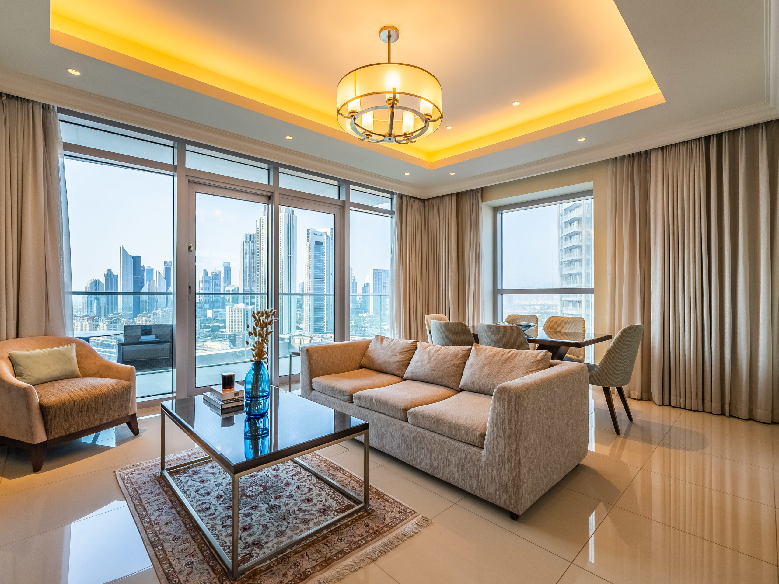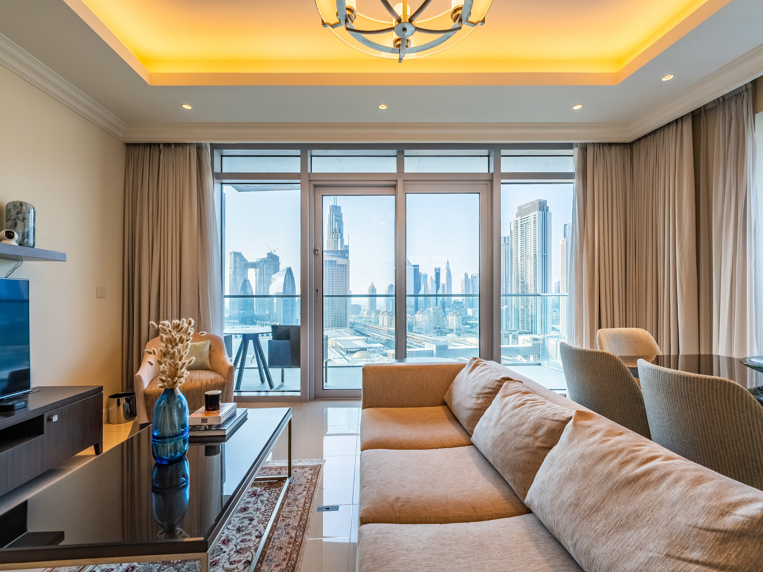 Enjoy panoramic views of Dubai’s skyline, the Burj Khalifa, and the Dubai Fountain from your apartment.