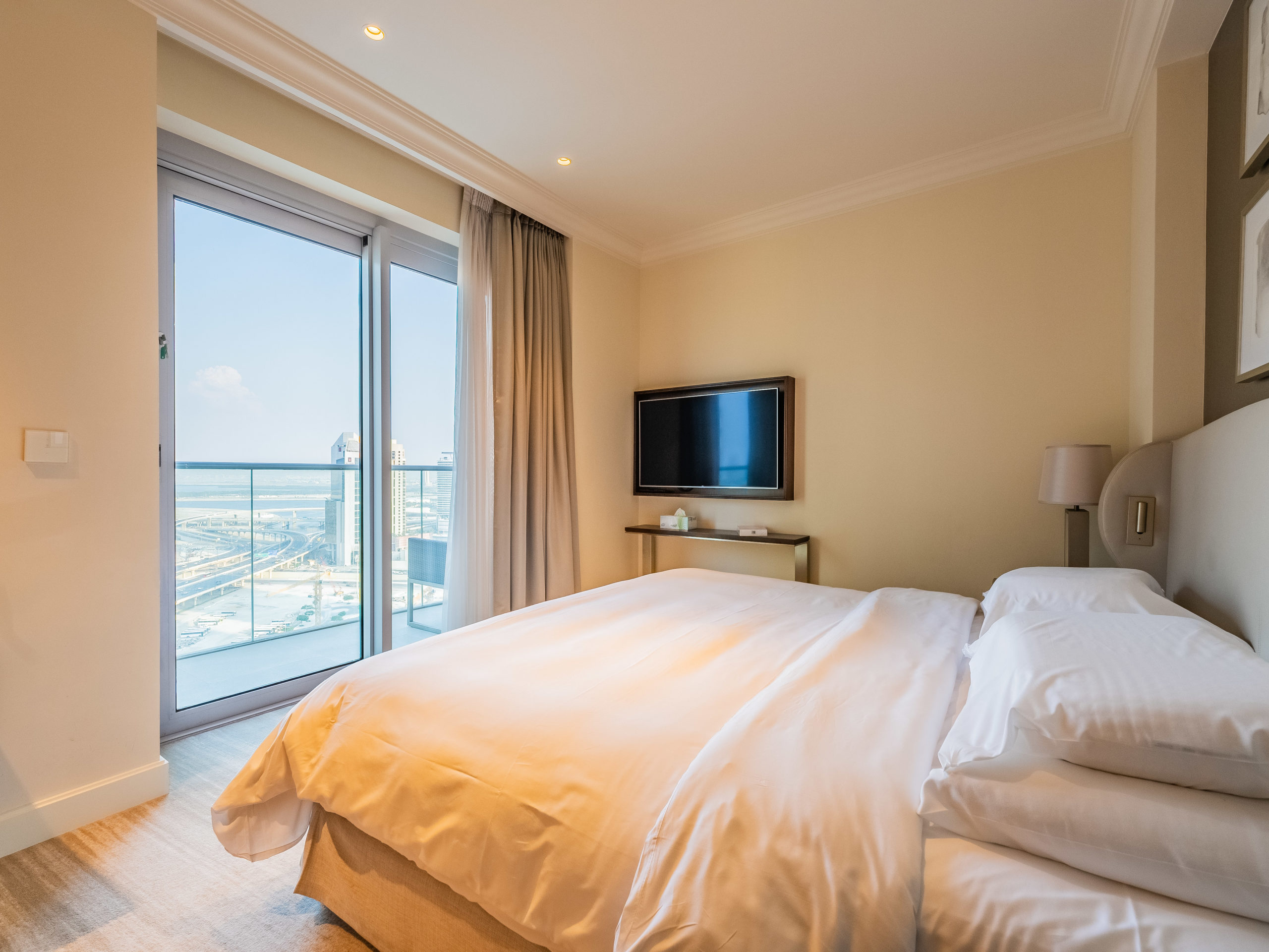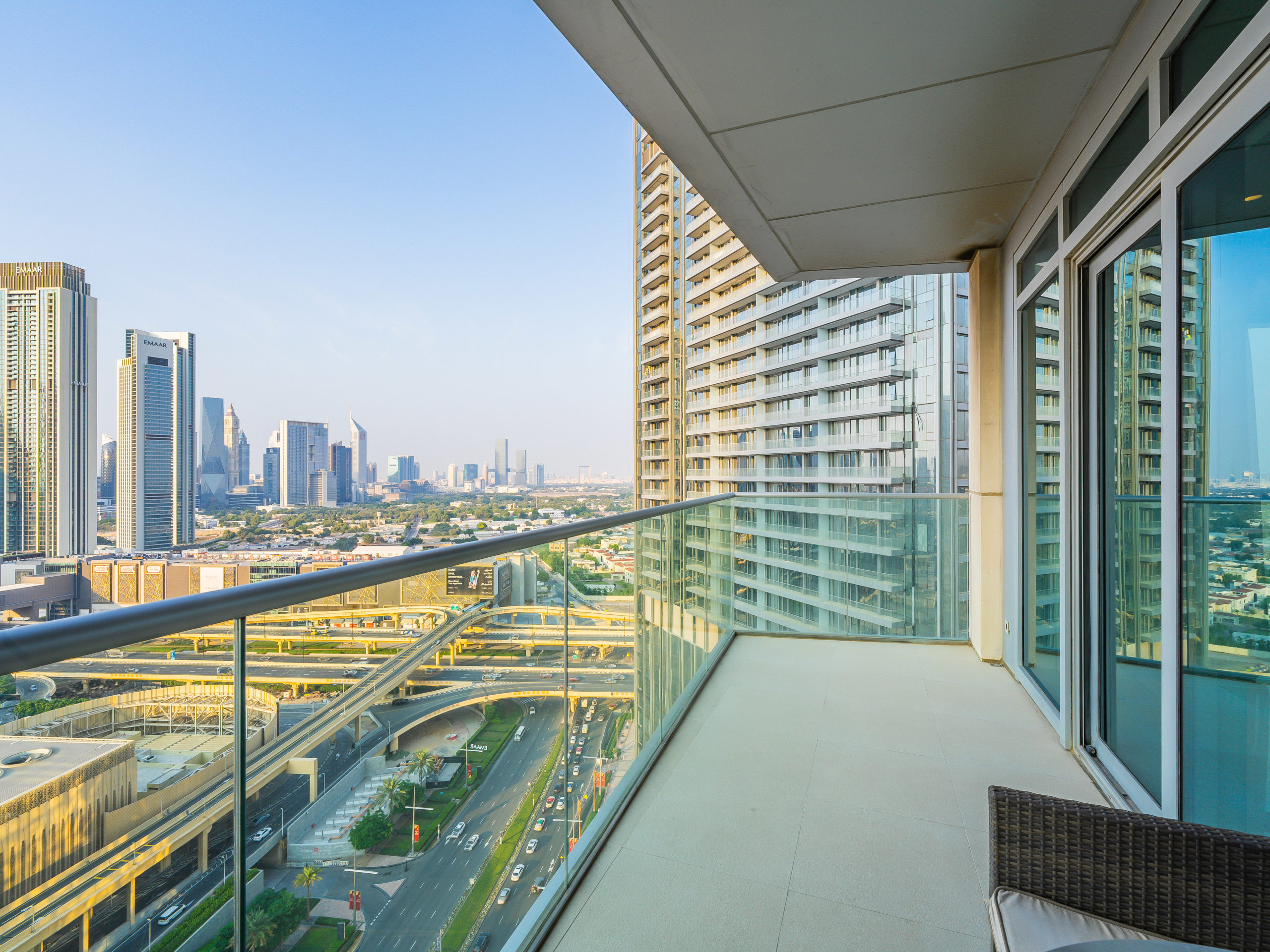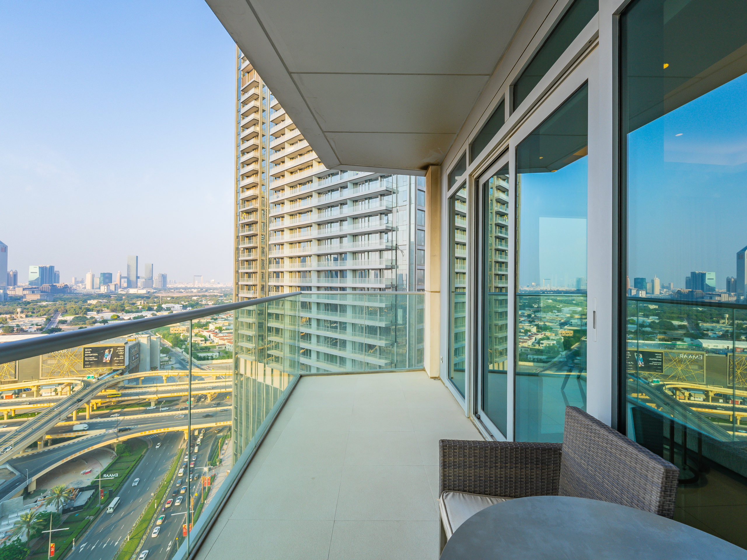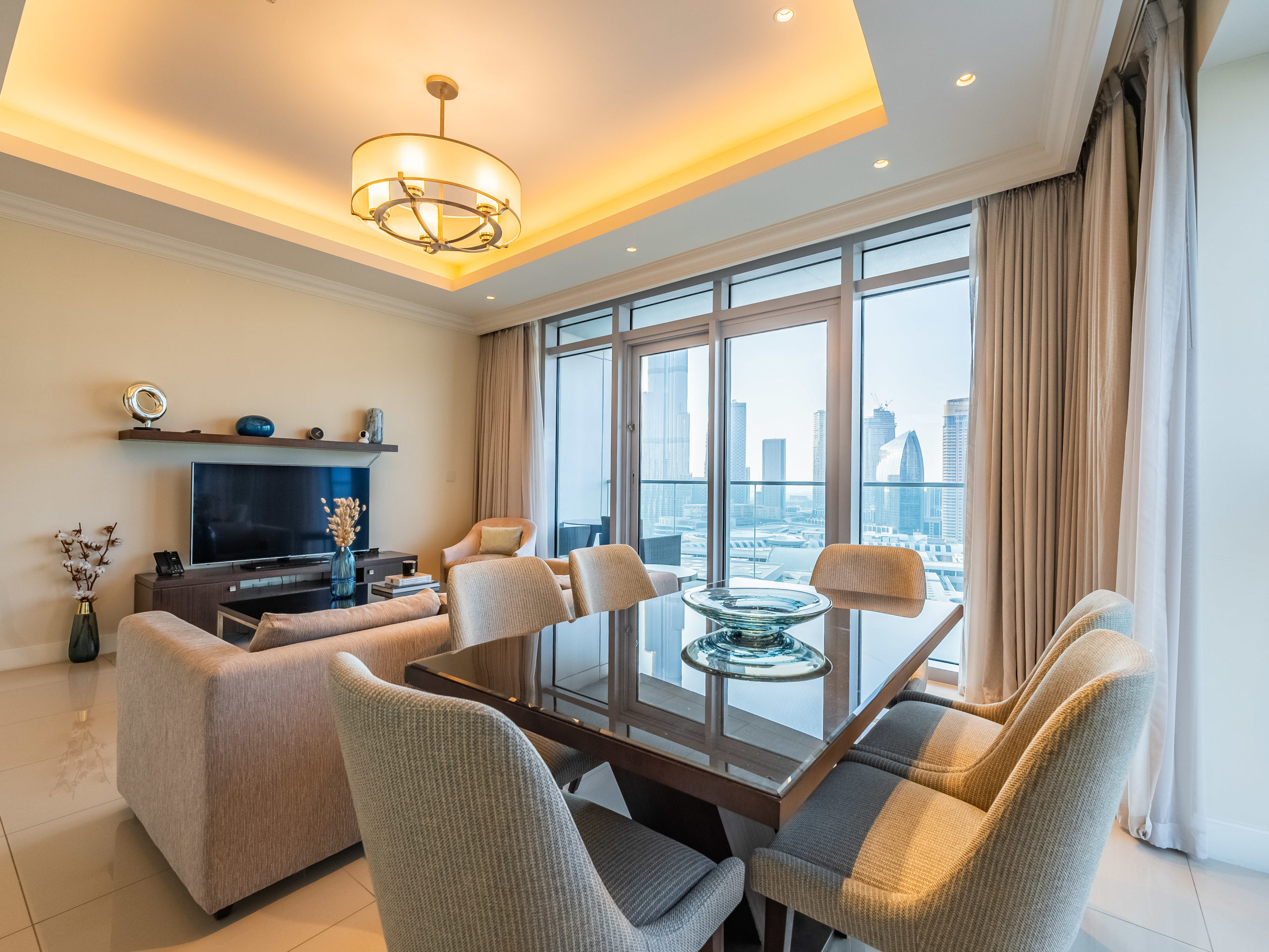 Enjoy panoramic views of Dubai’s skyline, the Burj Khalifa, and the Dubai Fountain from your apartment.