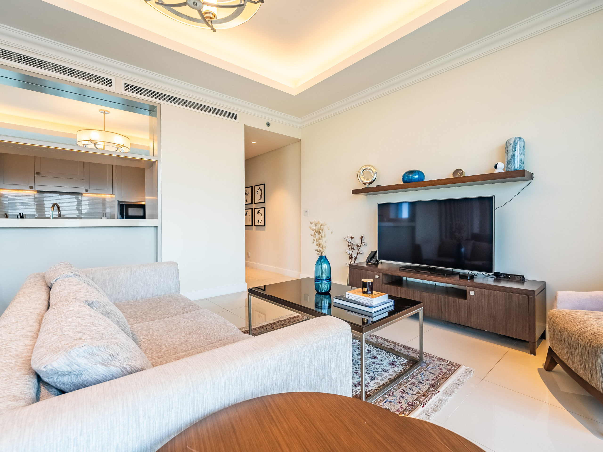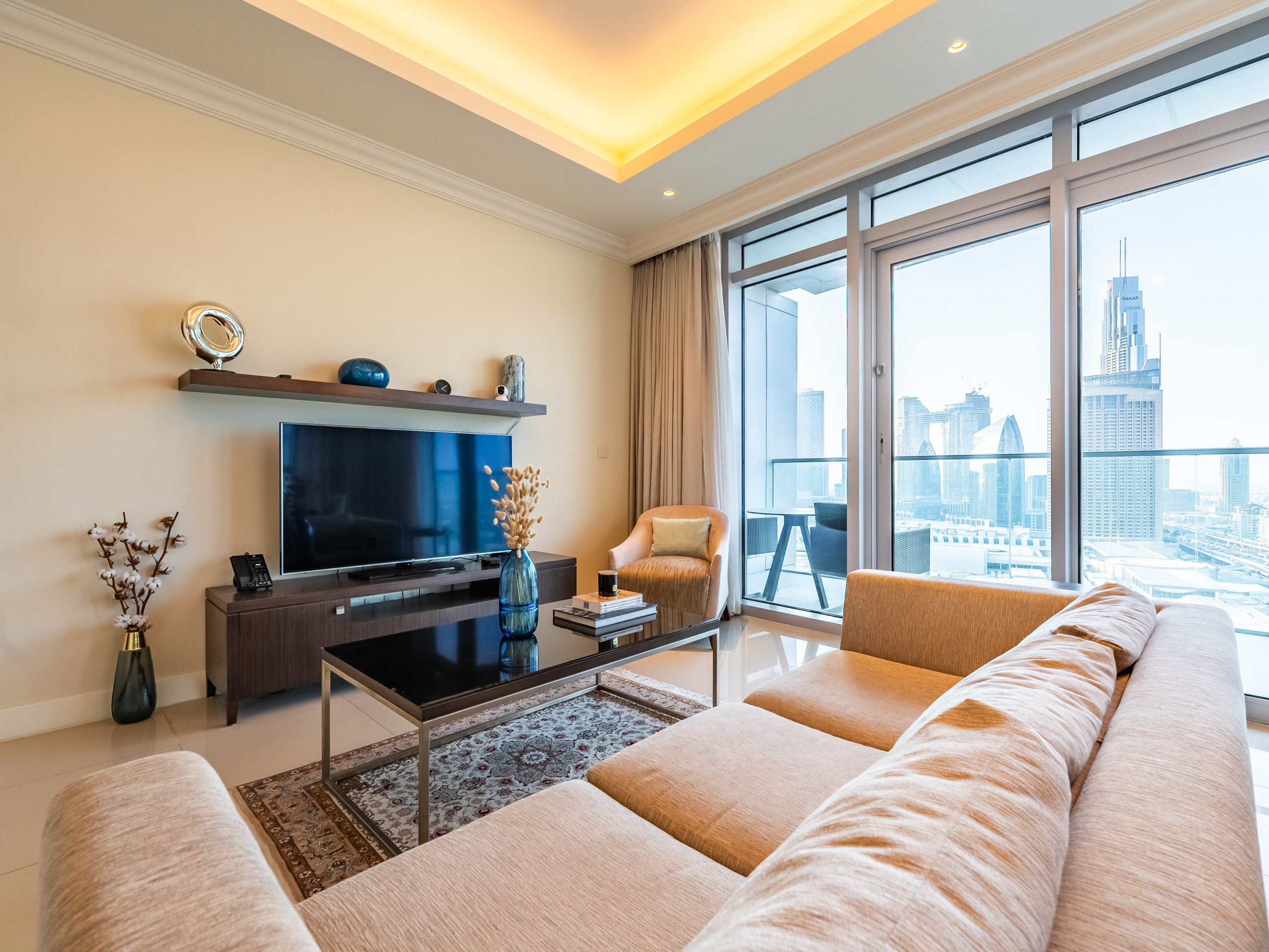 The open-plan living space exudes sophistication and comfort. Relax on plush seating while enjoying your favorite shows on a large smart TV, or step onto the private balcony to admire Dubai’s iconic skyline at sunrise or under the city lights at night.