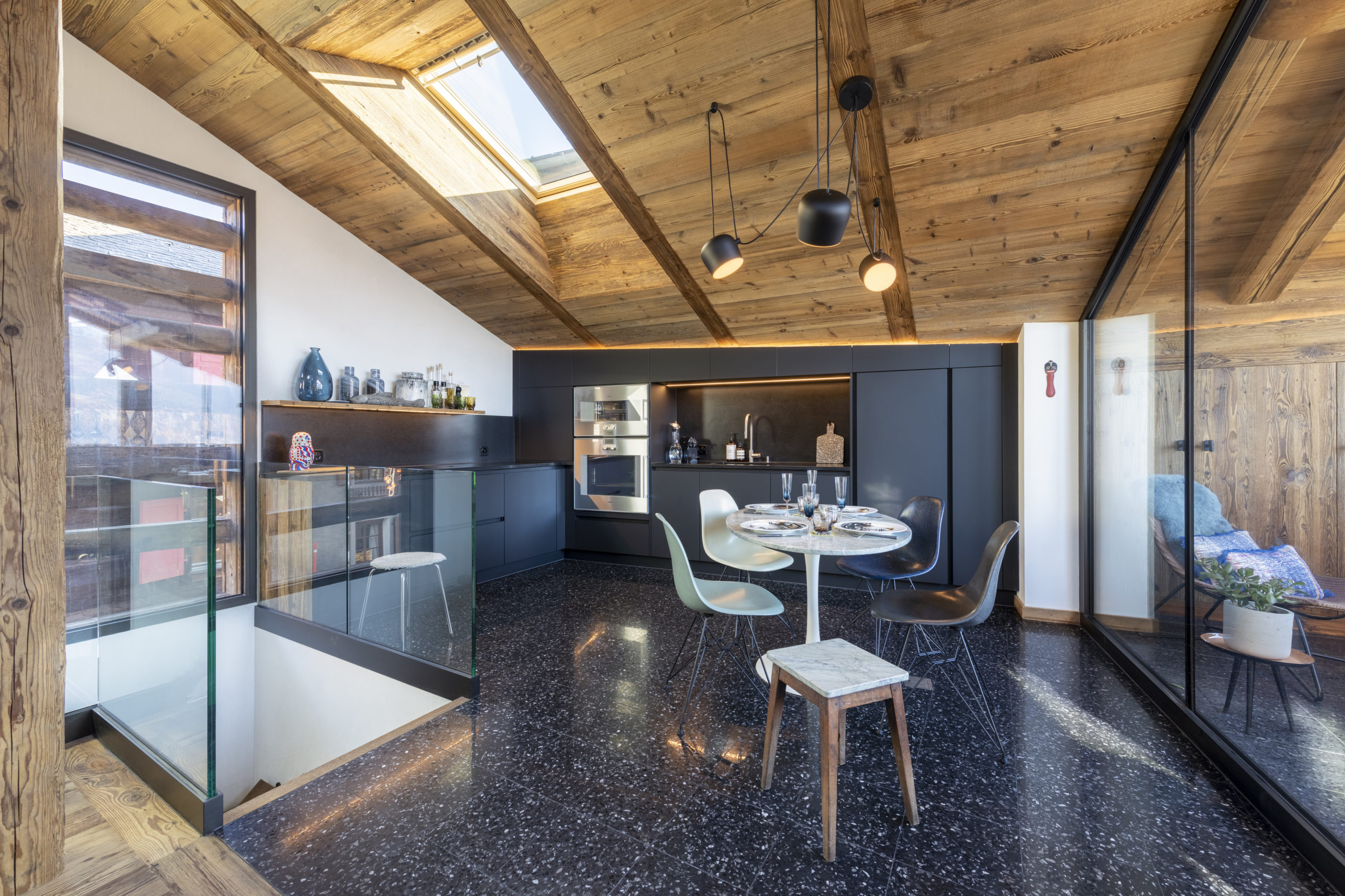 S’étendant sur environ 170 m², le chalet allie un caractère alpin authentique à des améliorations contemporaines. Le salon comprend une cheminée chaleureuse, des éléments en bois apparent et de grandes fenêtres encadrant la vue panoramique sur la vallée et la montagne. Un balcon spacieux sublime l’expérience montagneuse, offrant un cadre idéal pour un café du matin, des apéritifs au coucher de soleil ou une détente paisible.