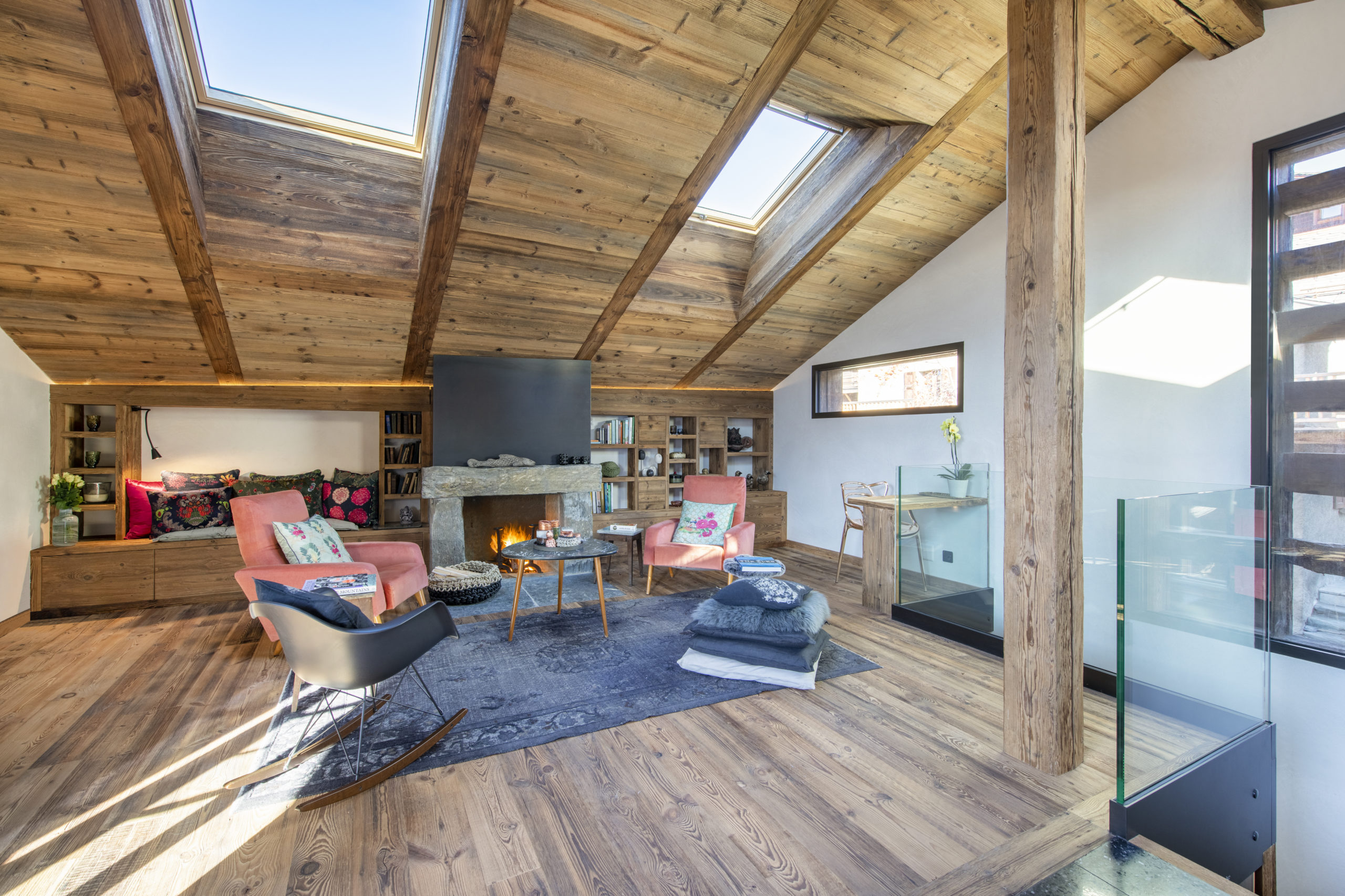 Salon chaleureux avec cheminée et ambiance alpine chaleureuse