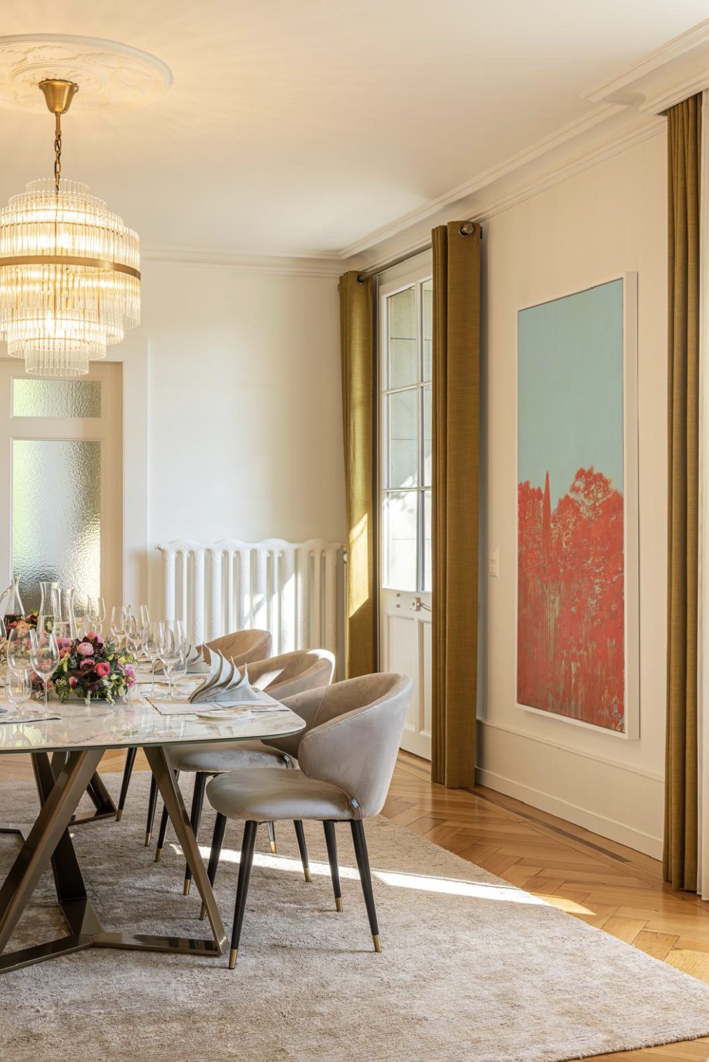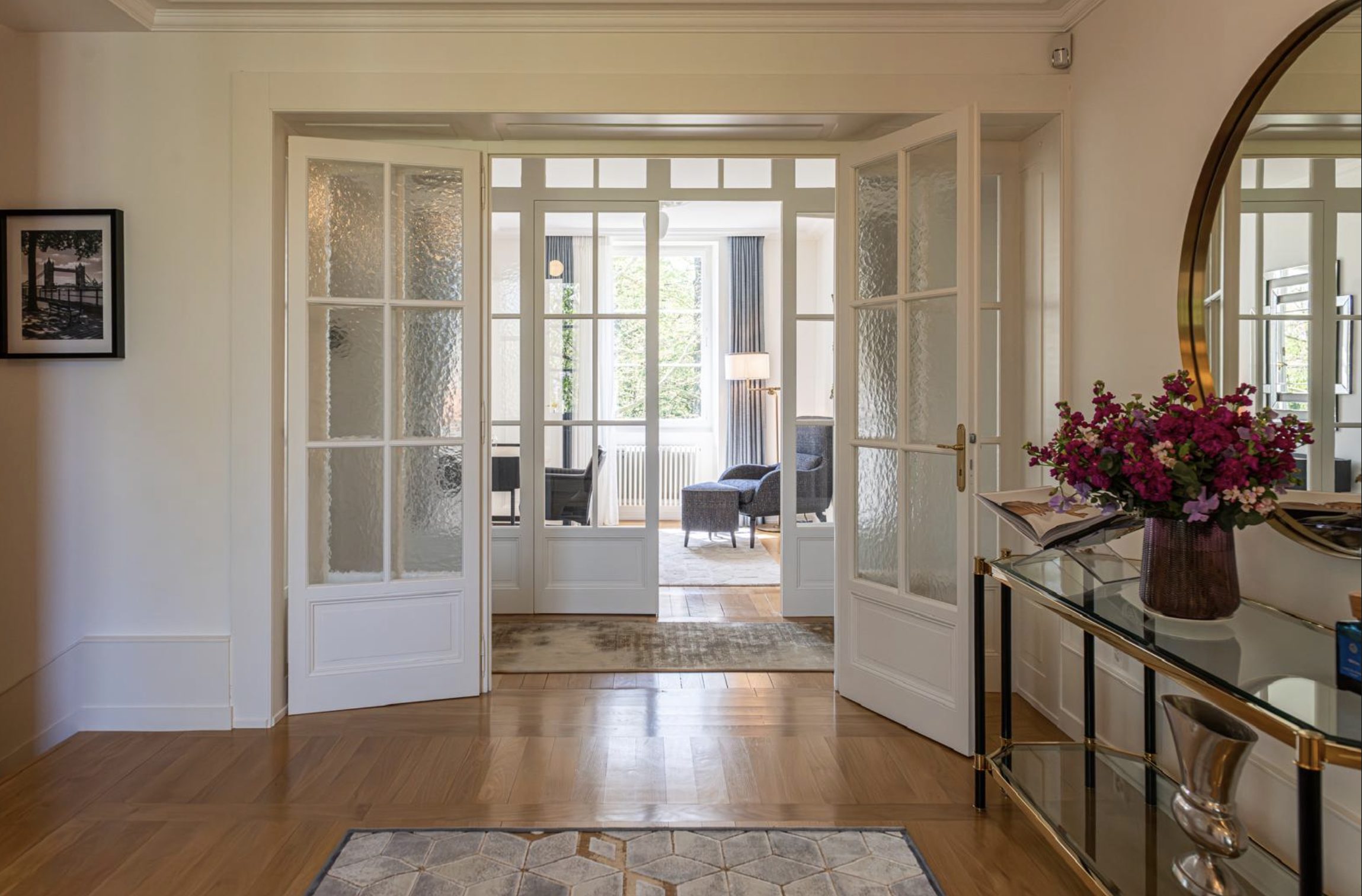 Upon entering, you’re greeted by an elegant welcome hall leading into a sun-filled 74 m² living room with bay windows, an open fireplace, and direct access to the expansive terrace and gardens.