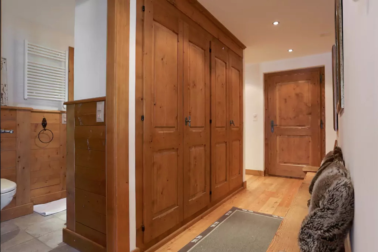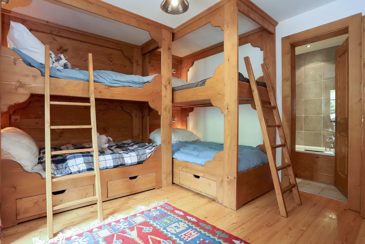 A children’s room with its four wooden bunk beds and its attached bathroom.