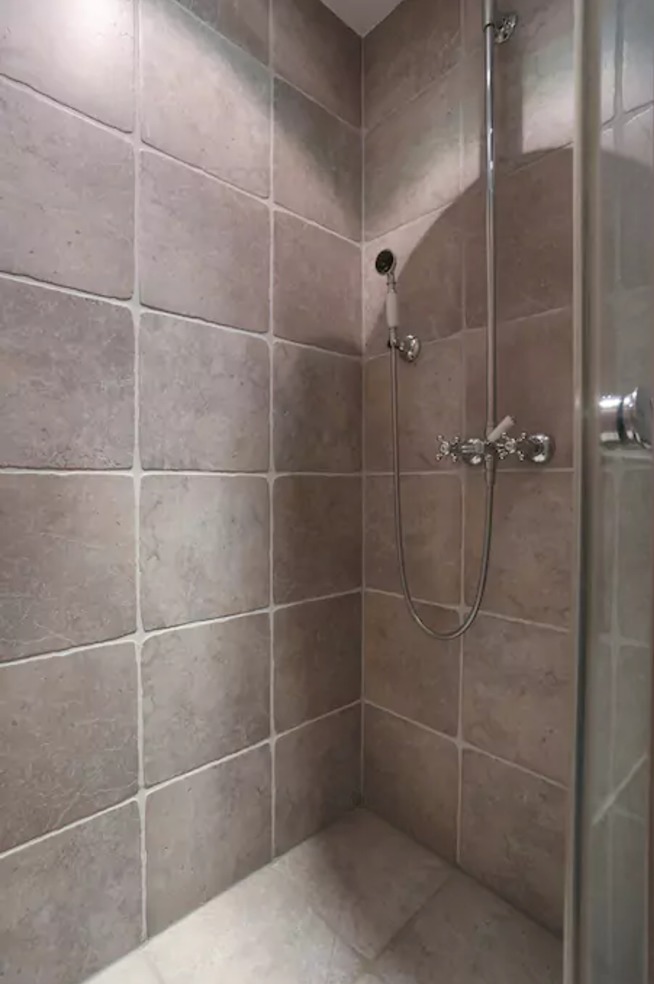 A guest bedroom with two single beds and its shower room with WC