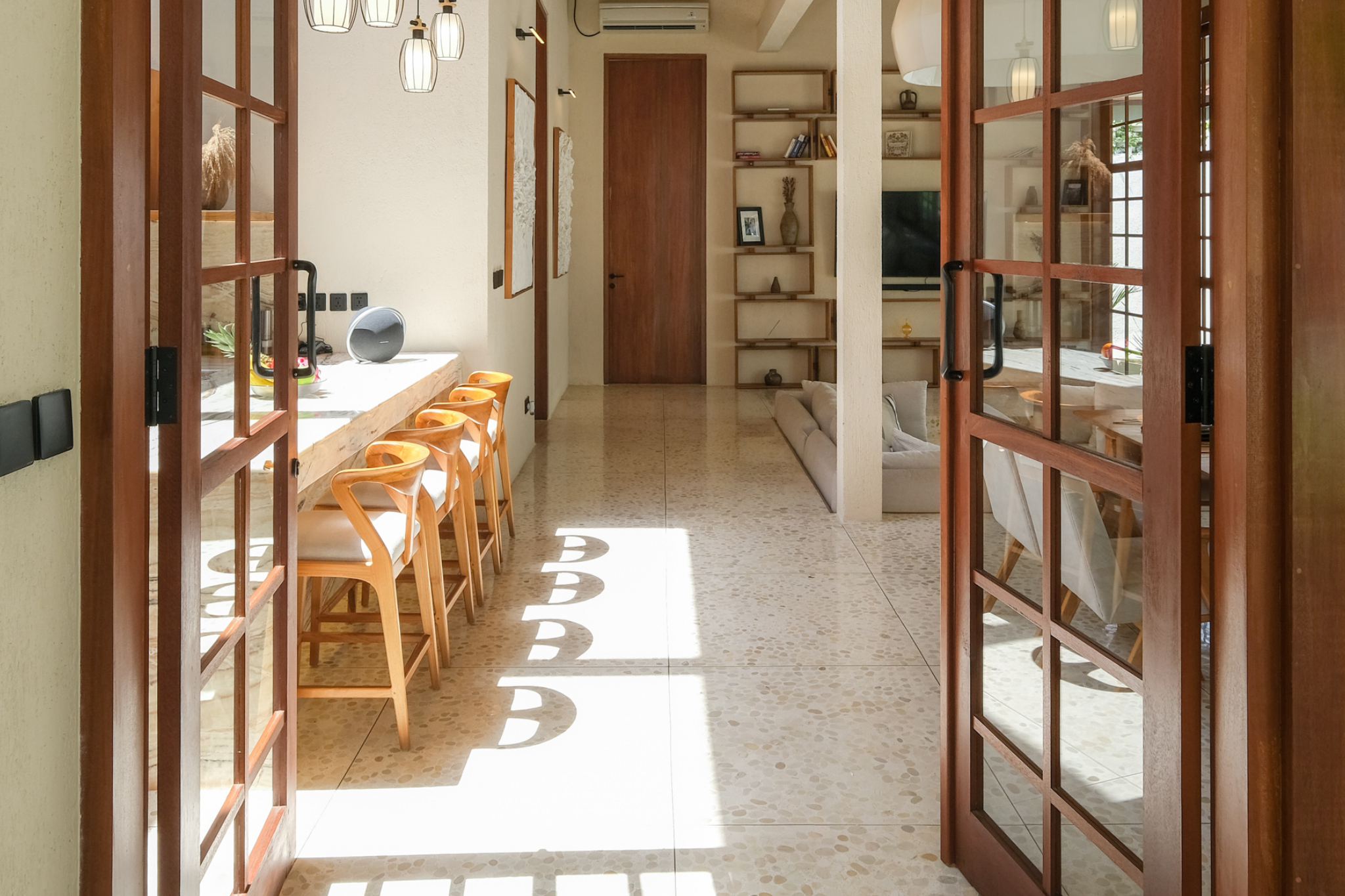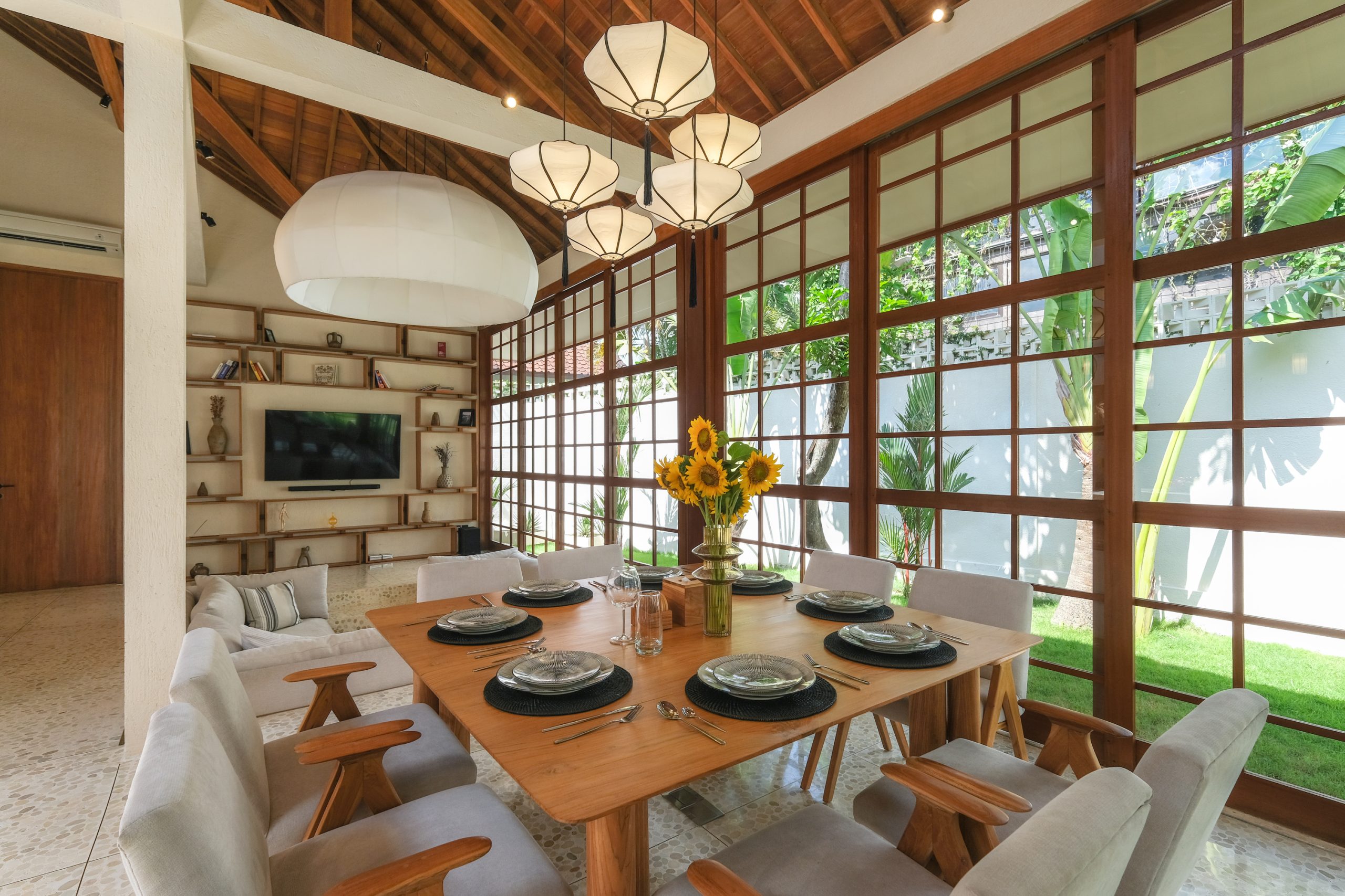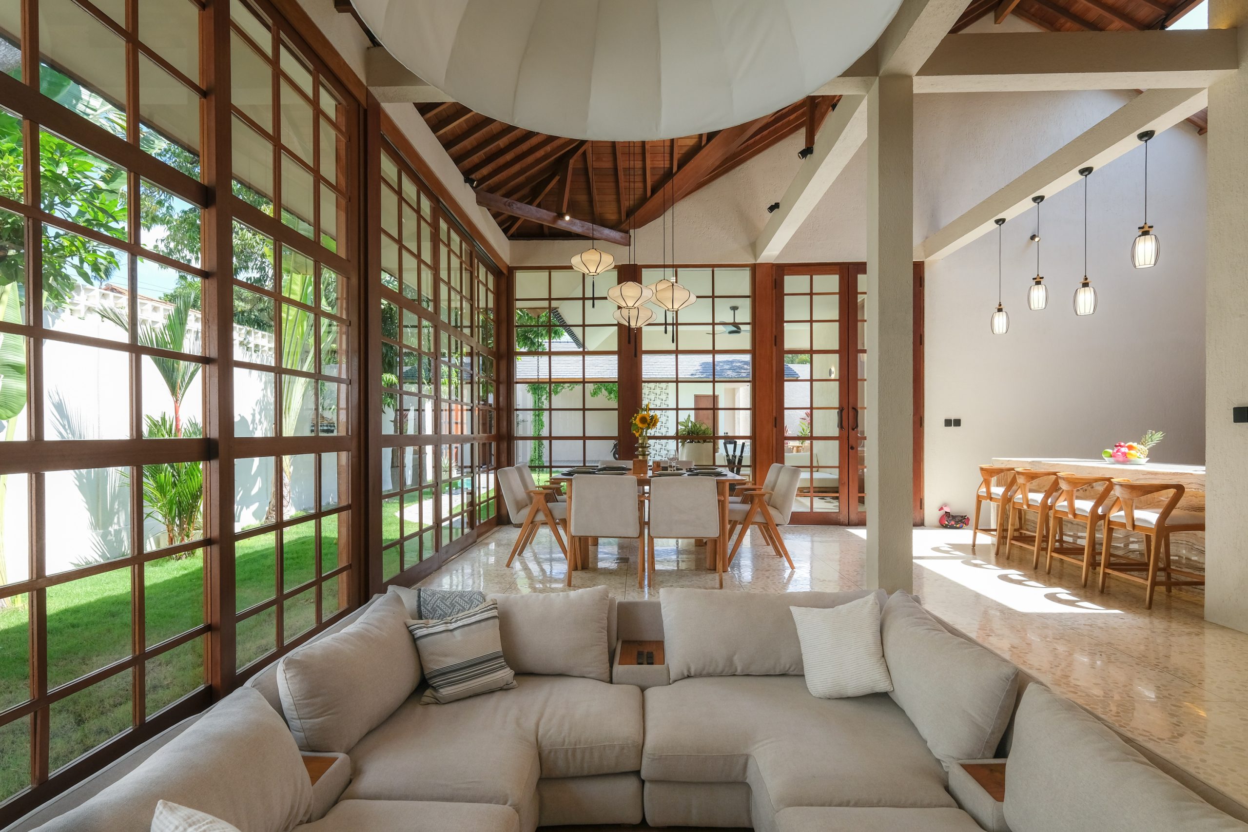 Natural light floods the villa through large wooden windows, reminiscent of a traditional Japanese home.