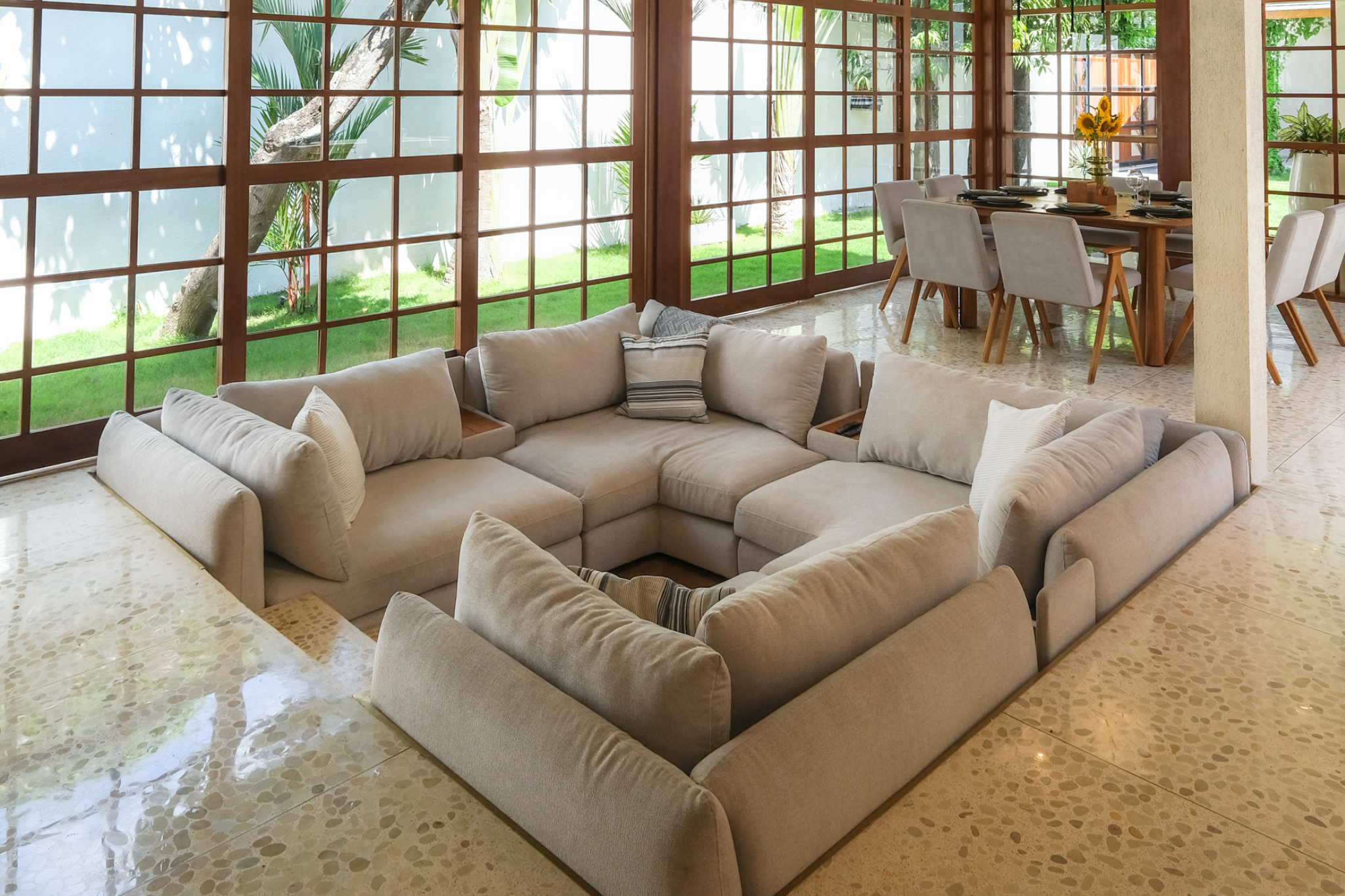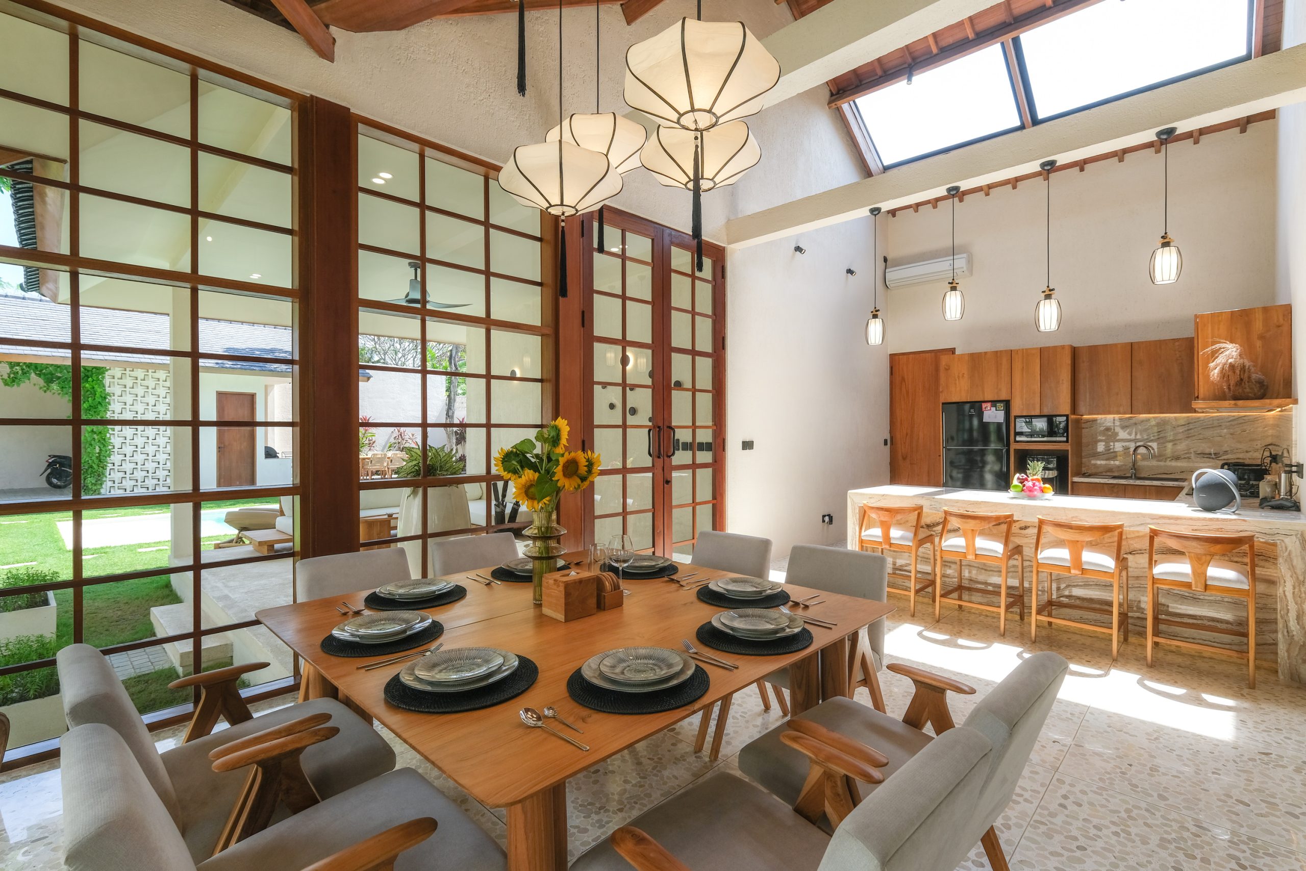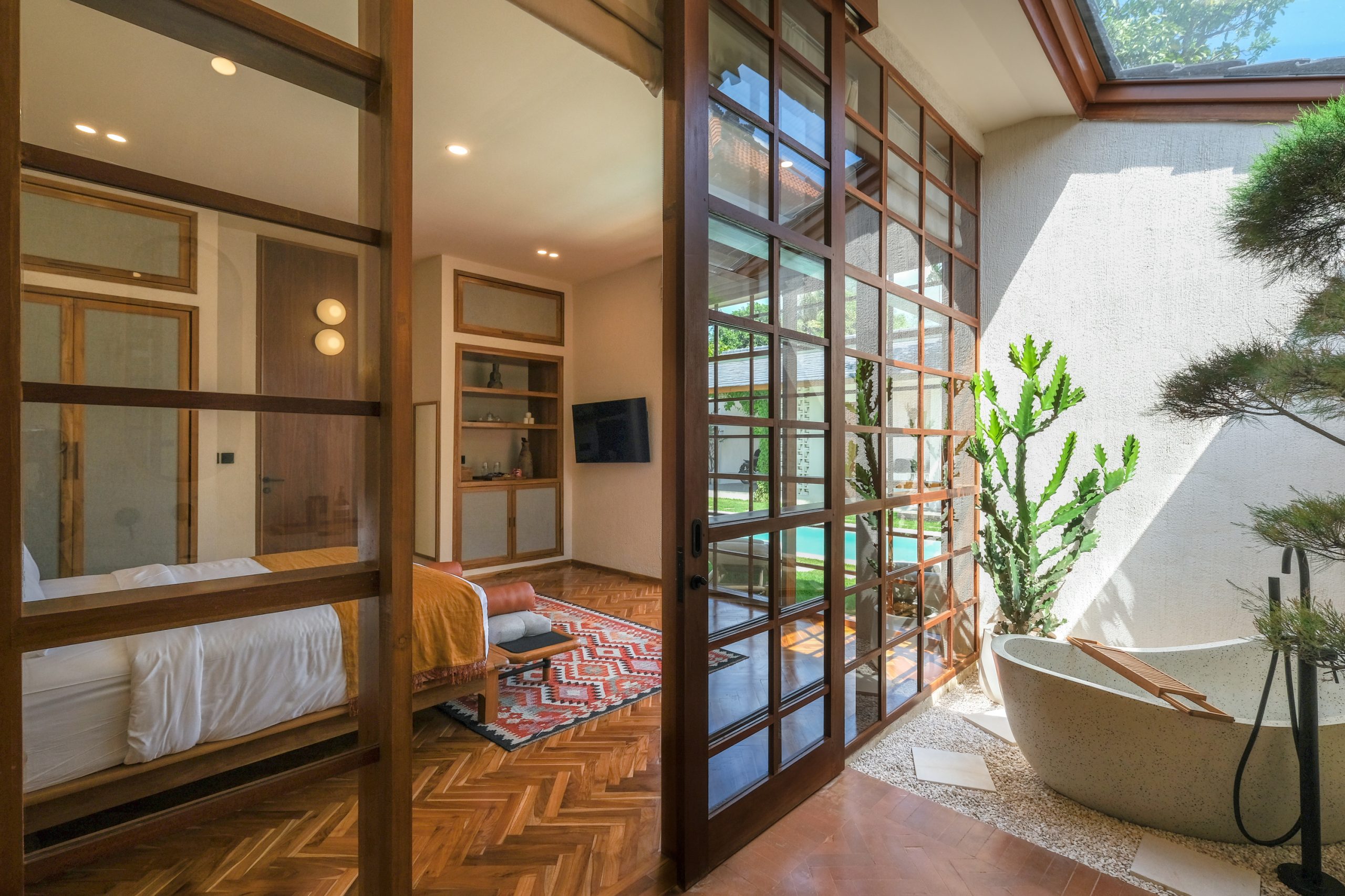 Natural light floods the villa through large wooden windows, reminiscent of a traditional Japanese home.
