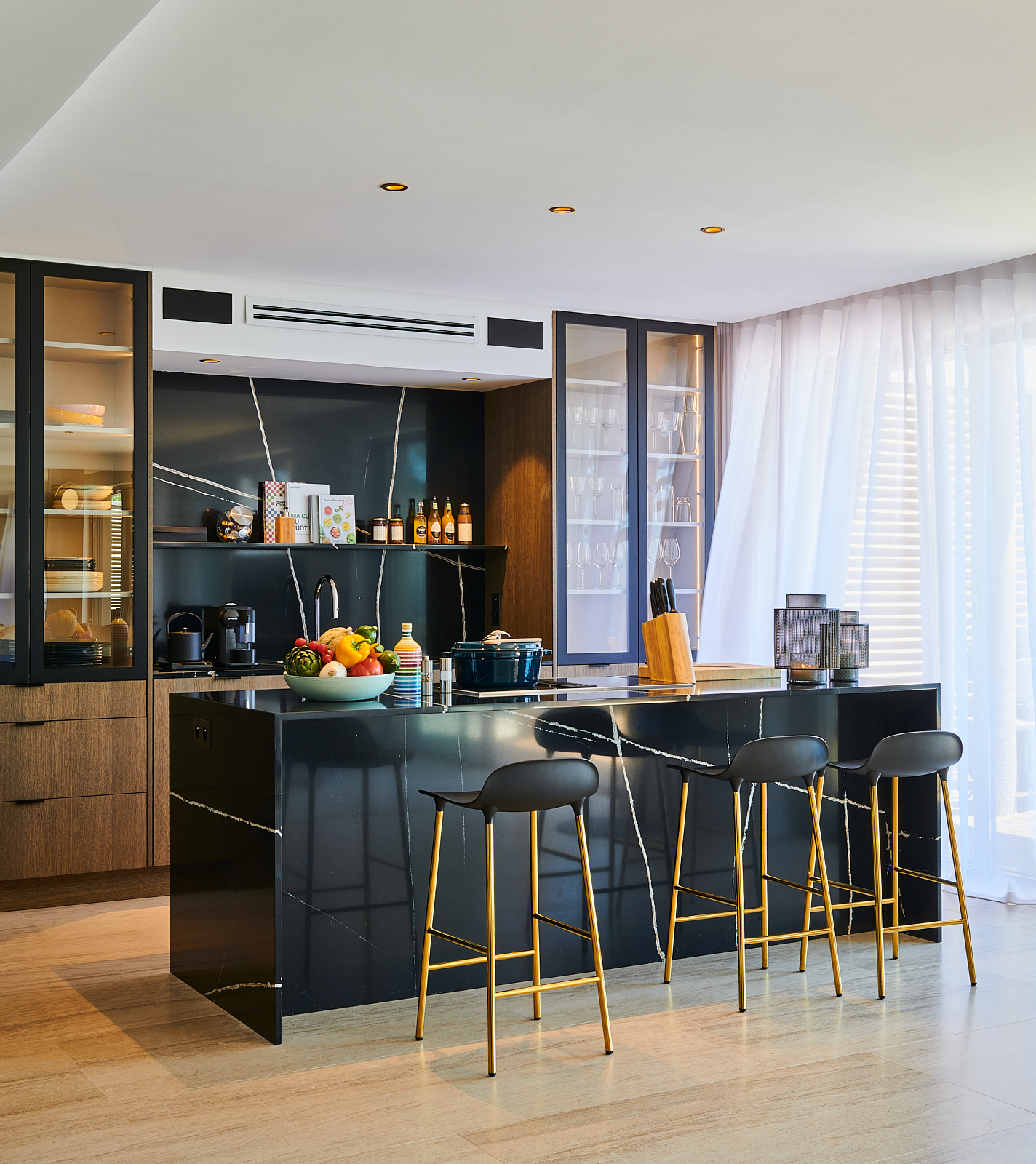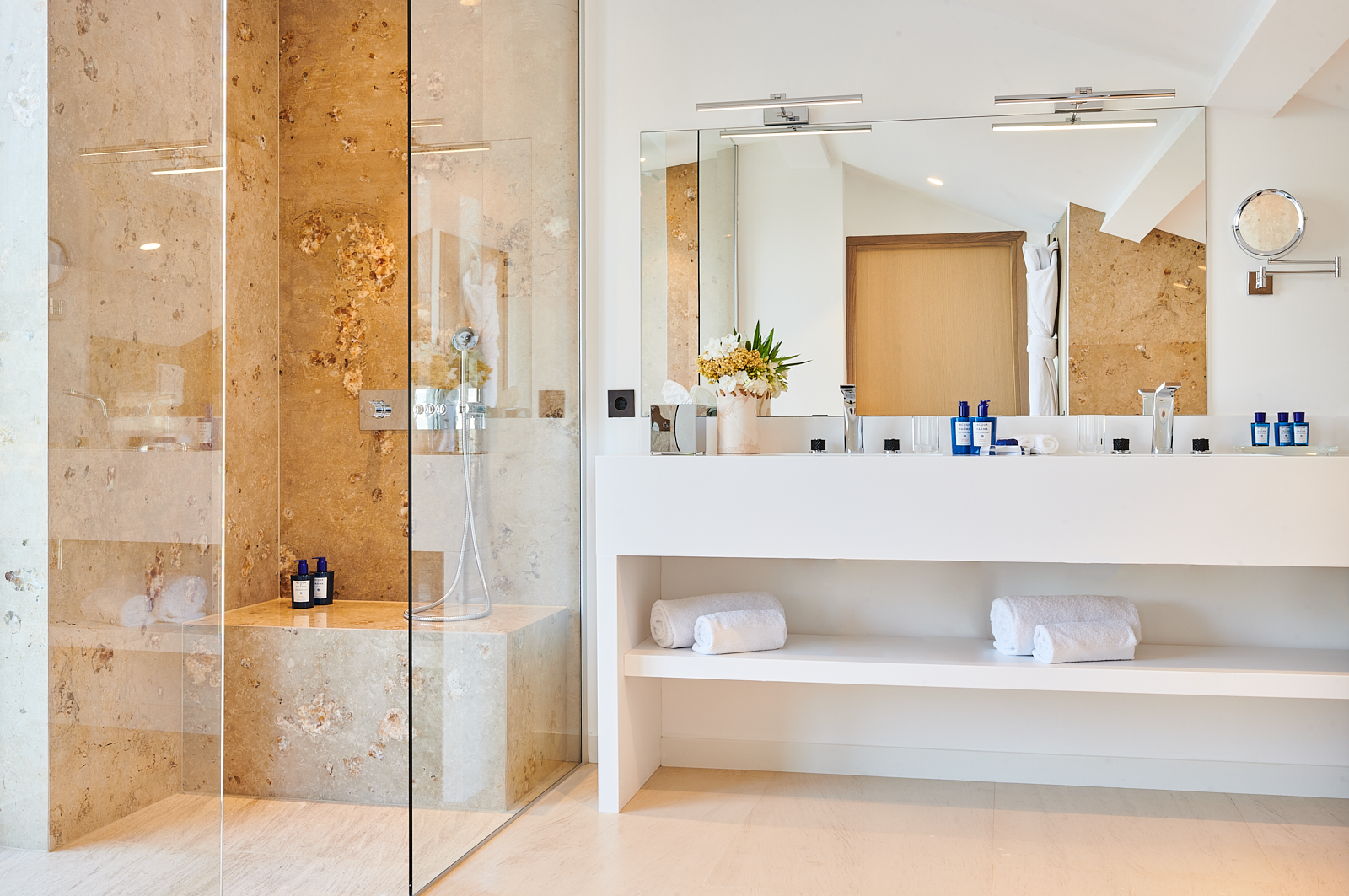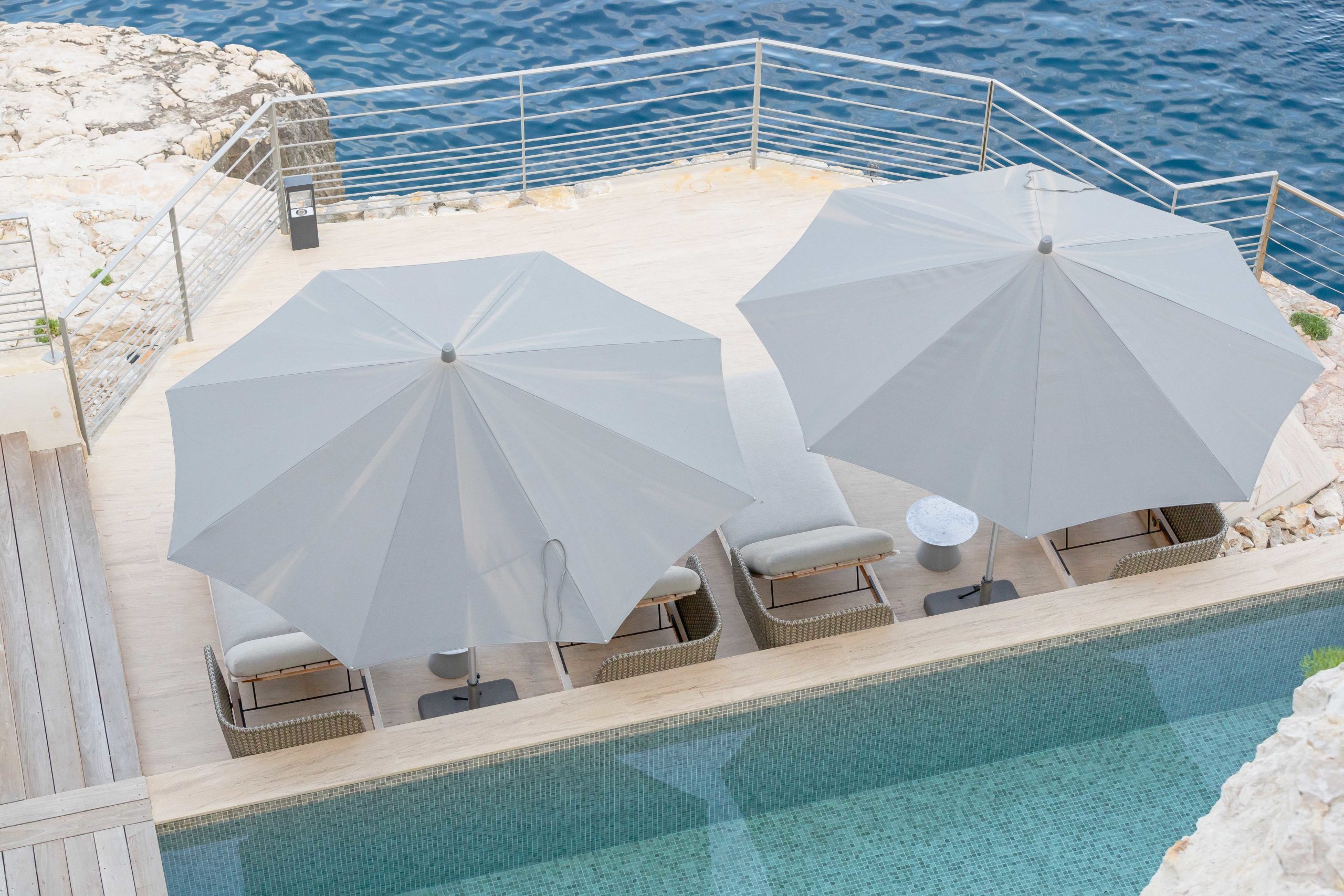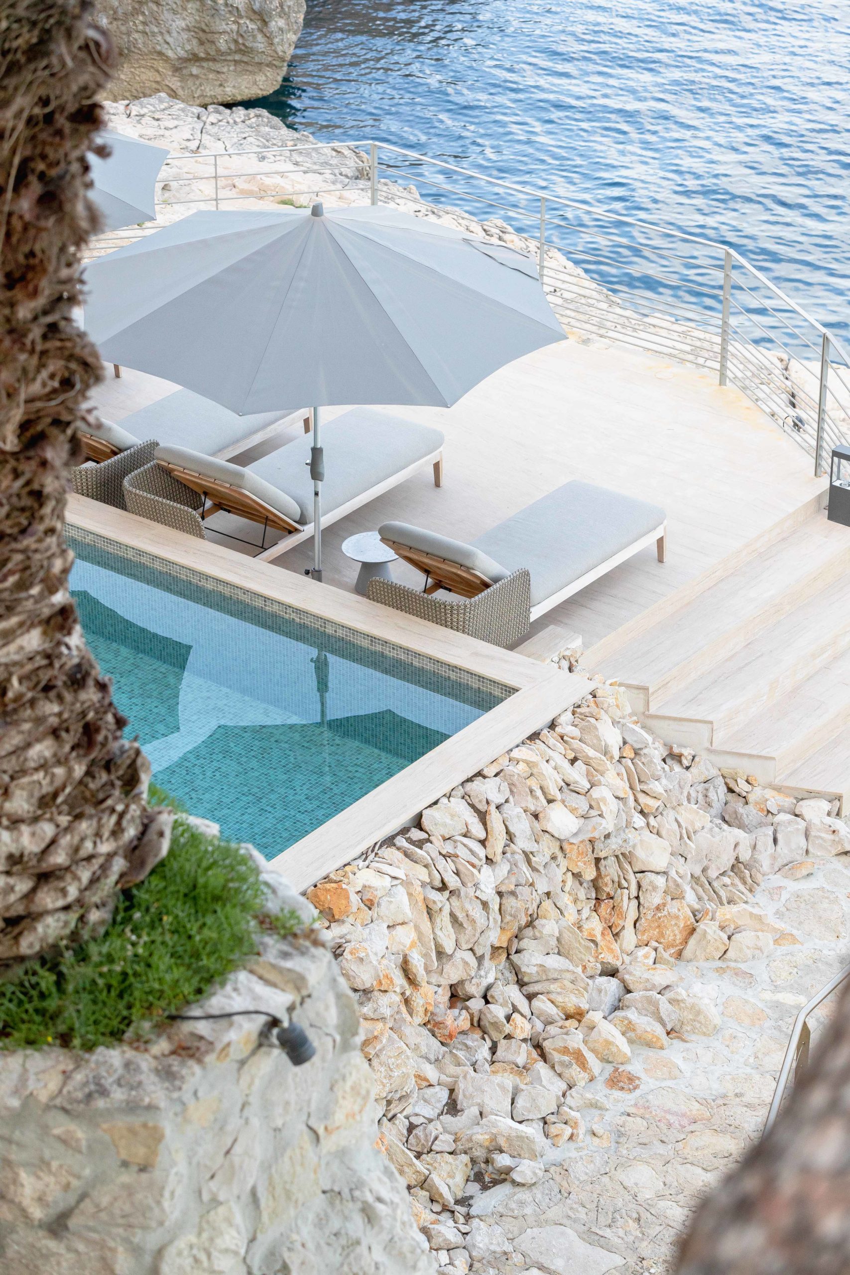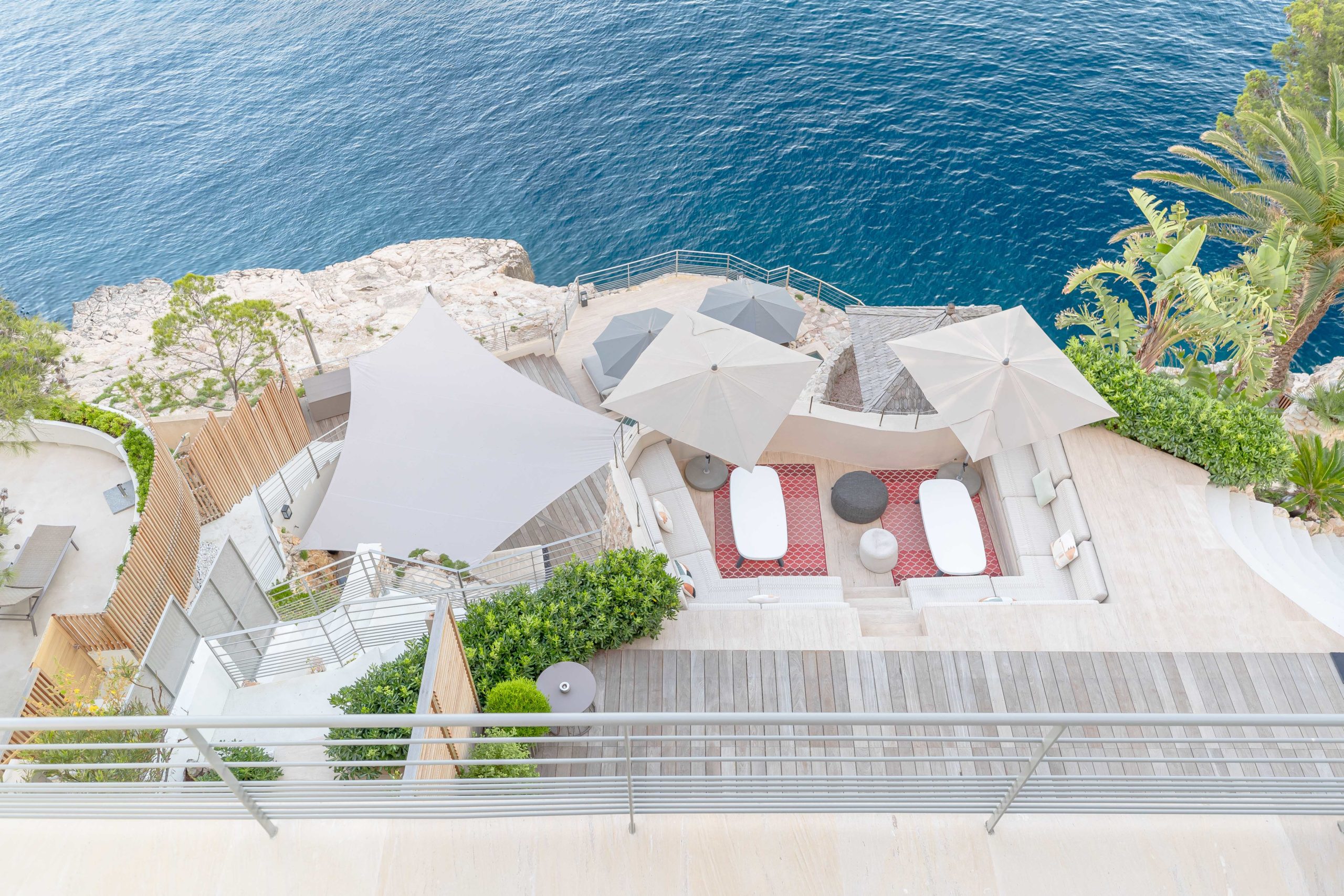 S’étendant sur quatre niveaux, l’architecture de la villa s’intègre parfaitement à la roche environnante. De plus, les espaces extérieurs vous invitent à vous détendre et à savourer le plus grand art de vivre du sud de la France. Ils célèbrent les jardins méditerranéens qui semblent plonger dans la mer. Par exemple, vous pouvez vous détendre près de l’une des deux piscines chauffées privées de Cala Bianca. Que vous choisissiez la piscine creusée dans la roche au bord de la mer ou la piscine supérieure près des salons d’été, l’expérience est inoubliable. À l’intérieur, des intérieurs minimalistes mettent en valeur des matériaux nobles et locaux. De plus, quatre chambres de style suite peuvent accueillir jusqu’à huit invités, chacune offrant un refuge privé et paisible.