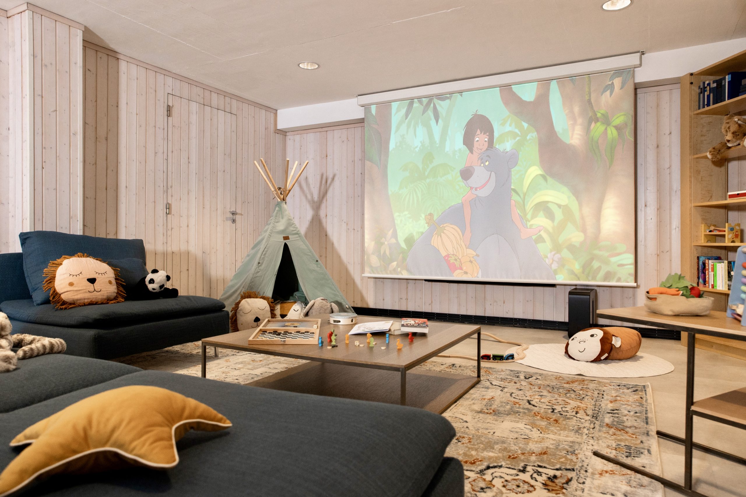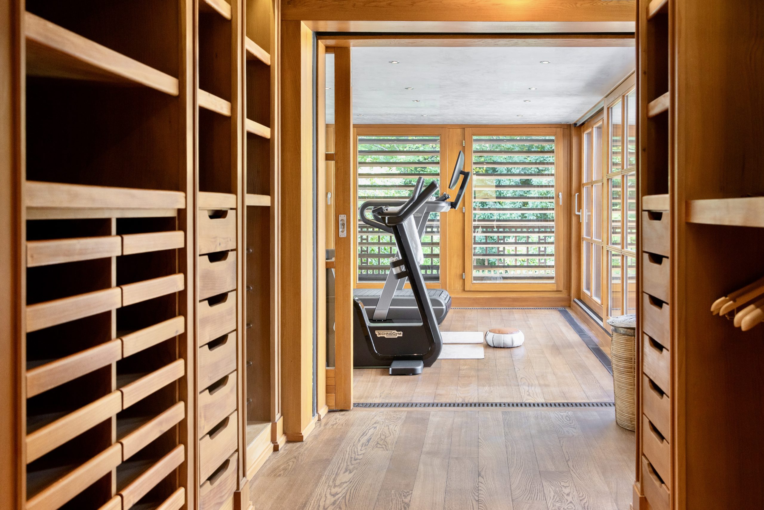 The property features five bedrooms and five bathrooms, alongside a lake-facing office, a fully equipped open kitchen, and dedicated wellness and fitness areas. A lower ground level includes a cinema and games room, a wine cellar, and extensive dressing spaces — making the villa particularly suited to longer stays or family residencies.