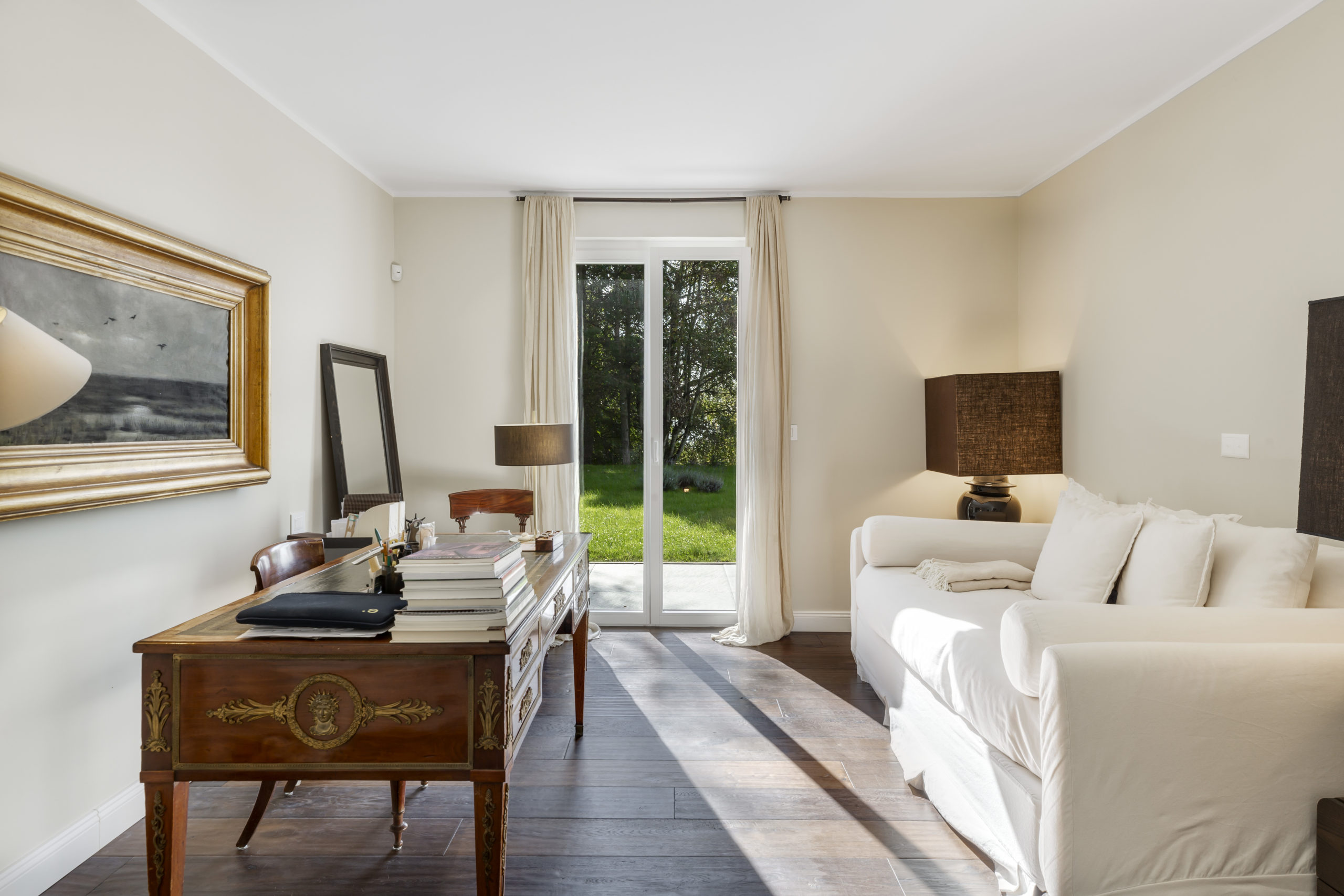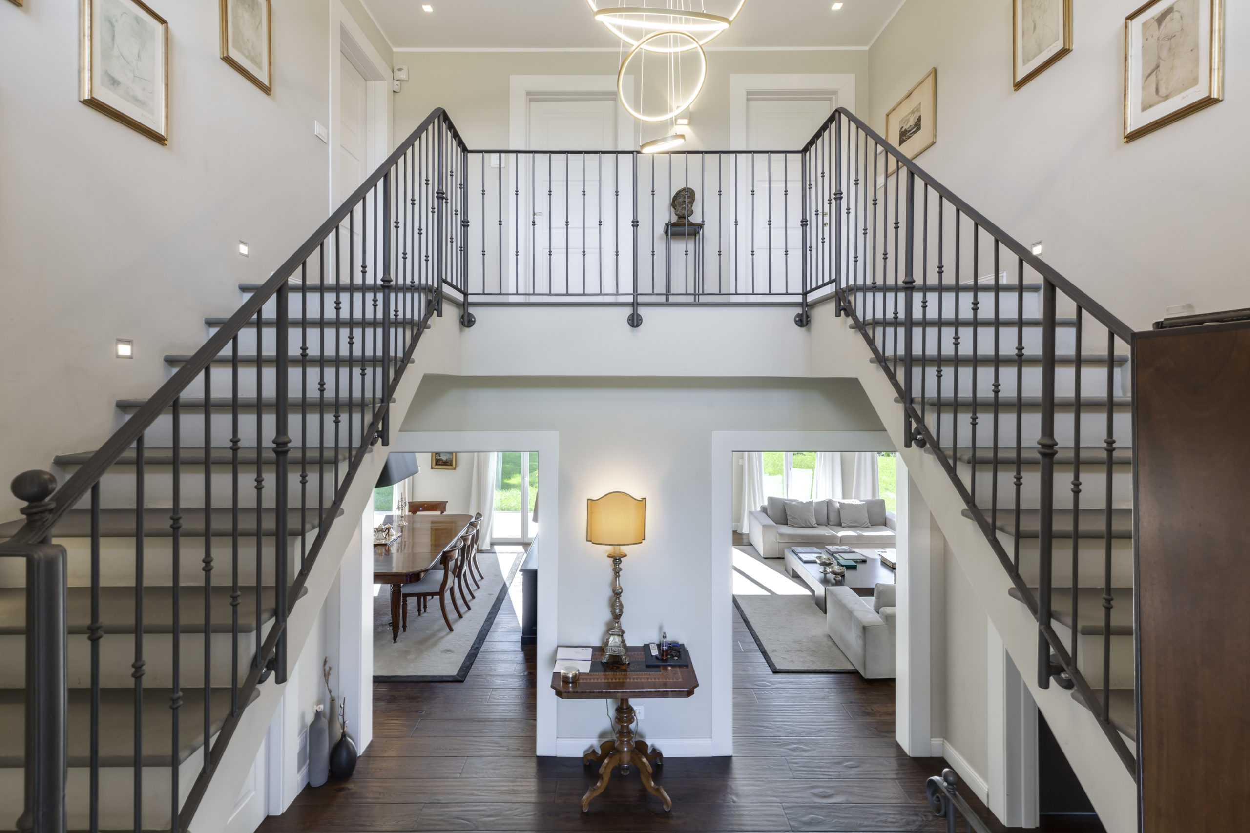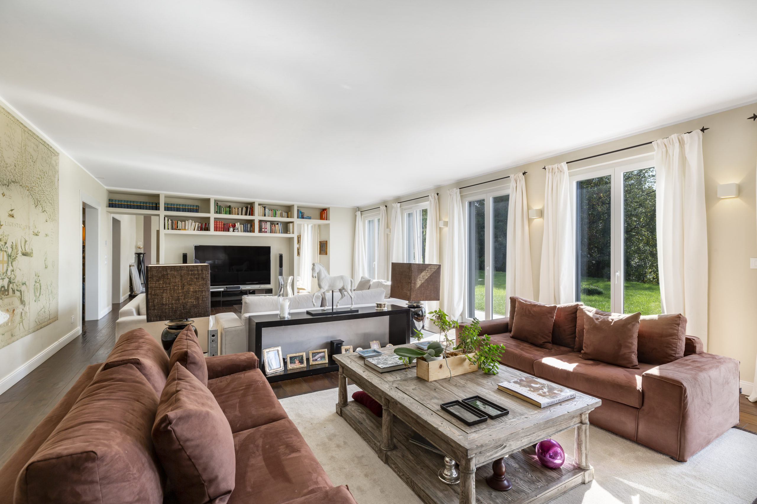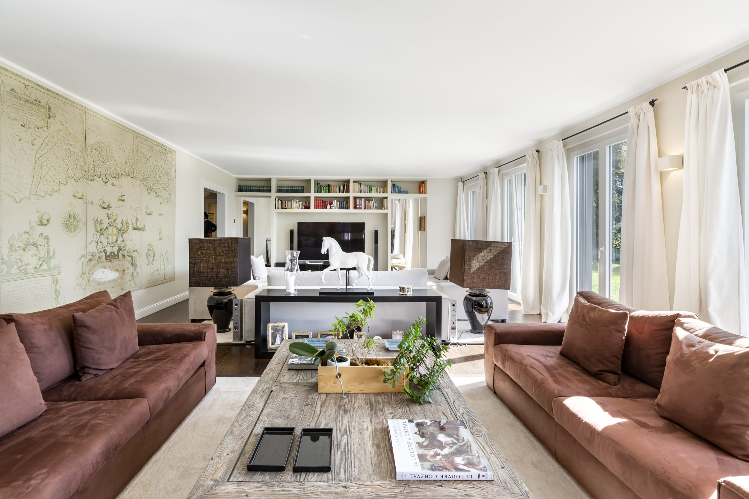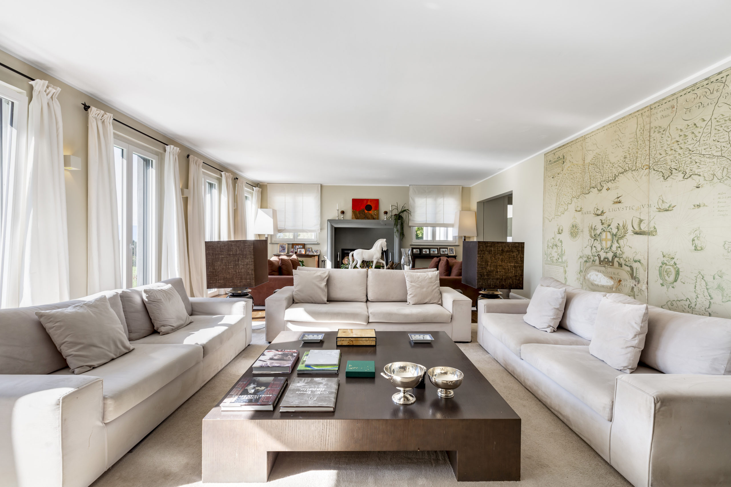 Spanning over 700 m² of usable floor space across two levels, this villa offers a central staircase and a plethora of elegant living spaces. The day area includes numerous reception rooms, a cozy reading nook, a sophisticated dining room, a large closed kitchen, and an office.