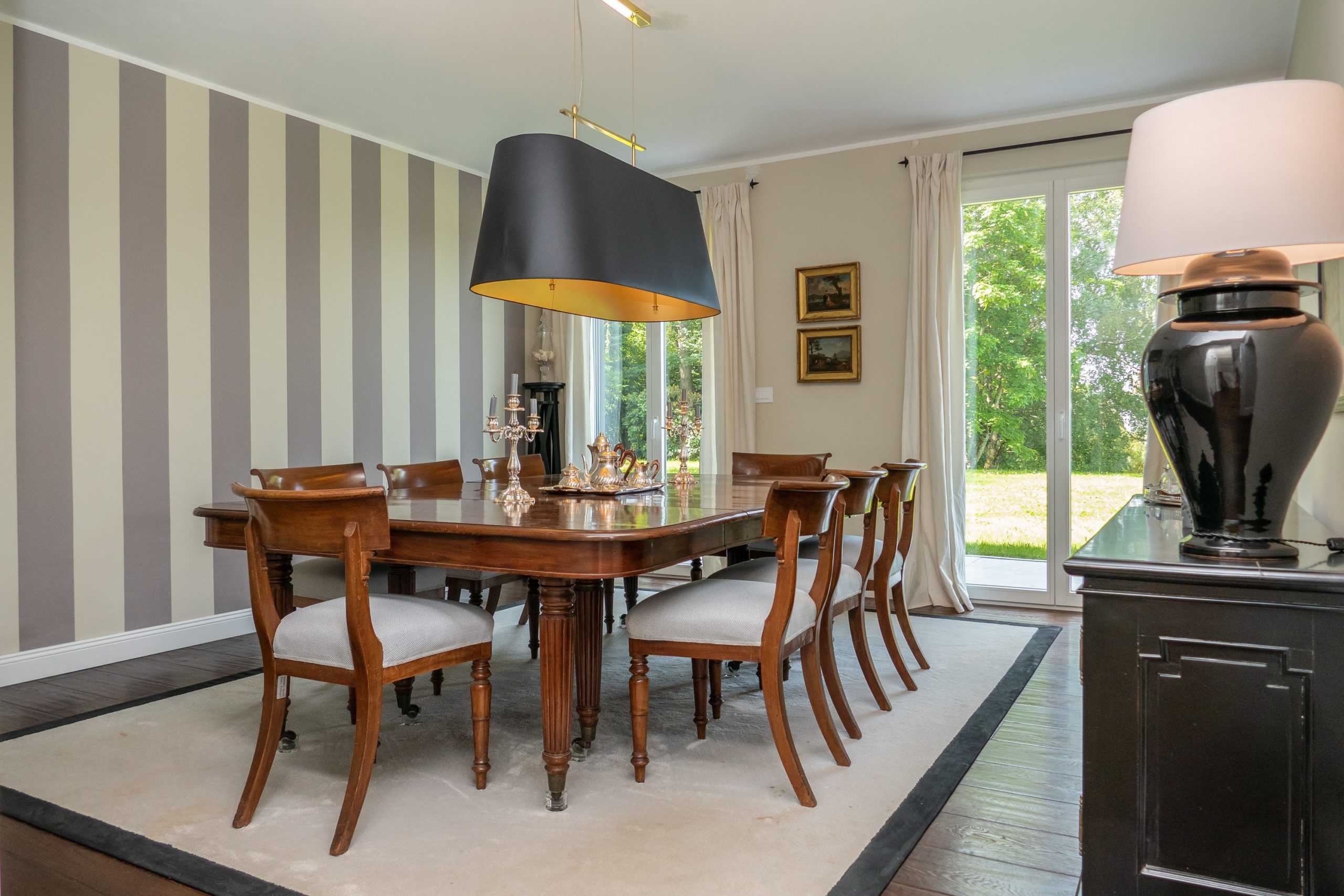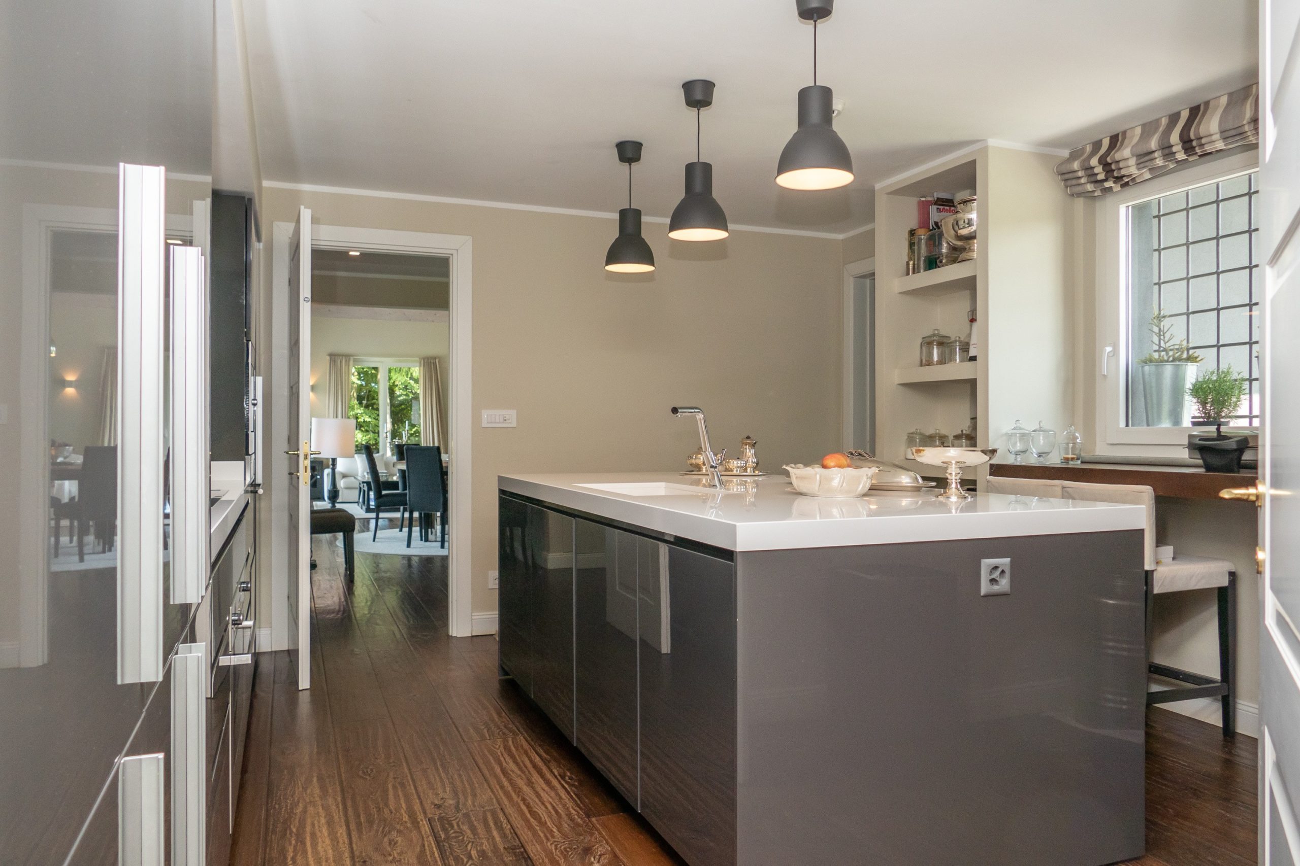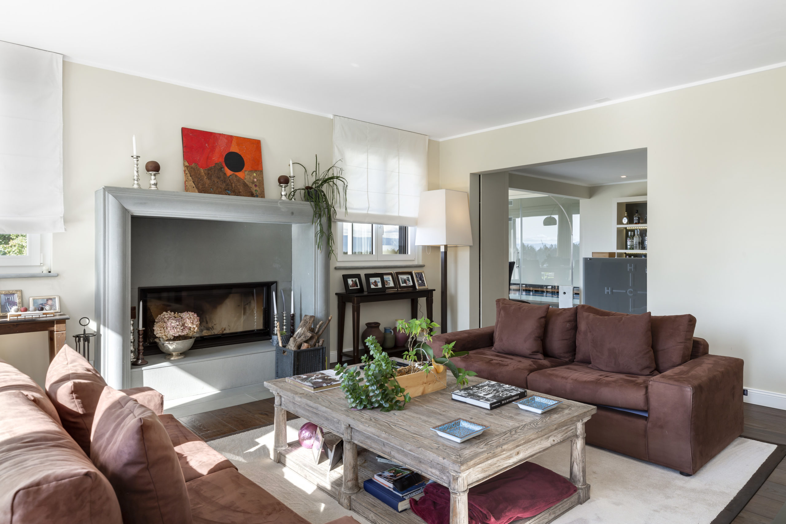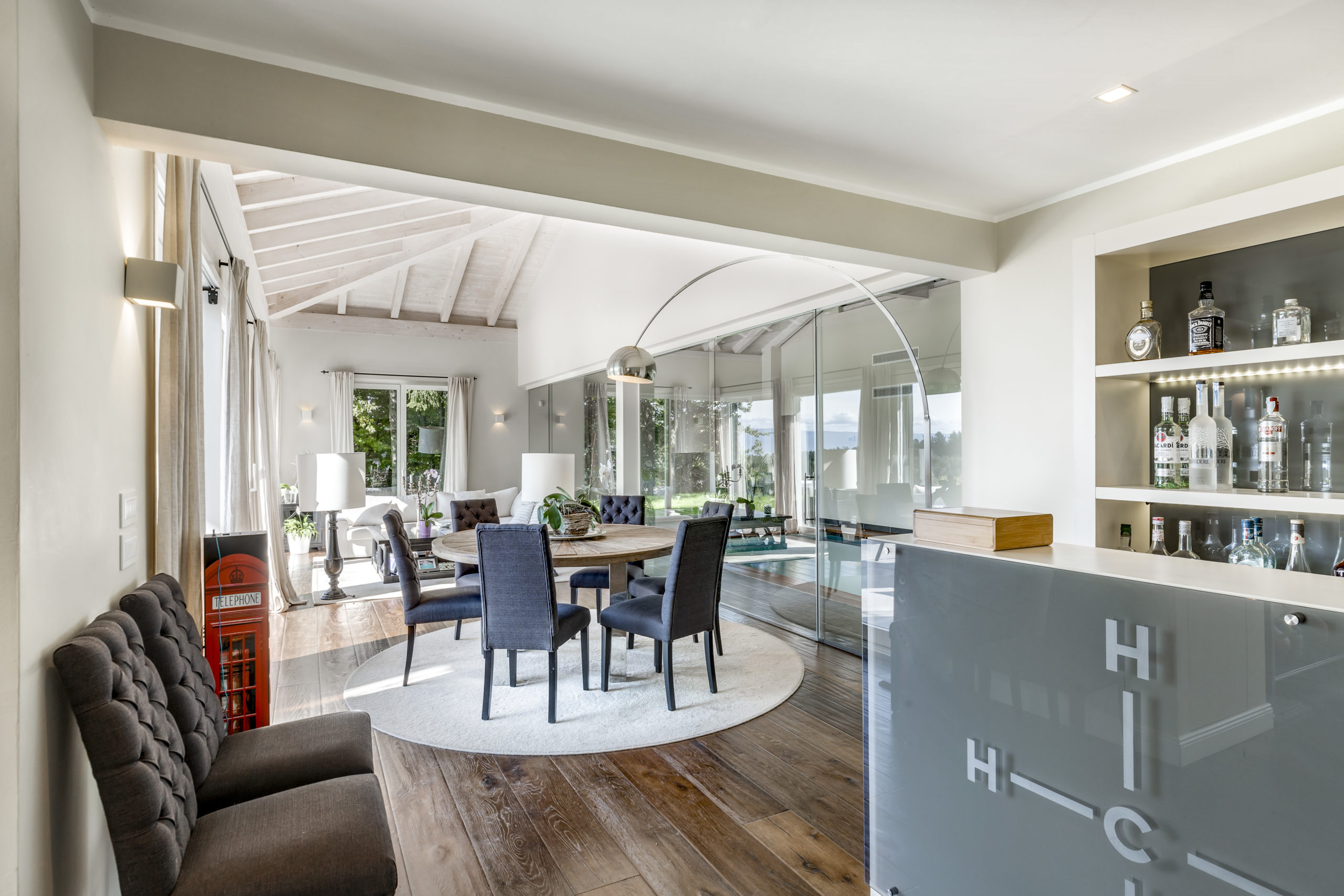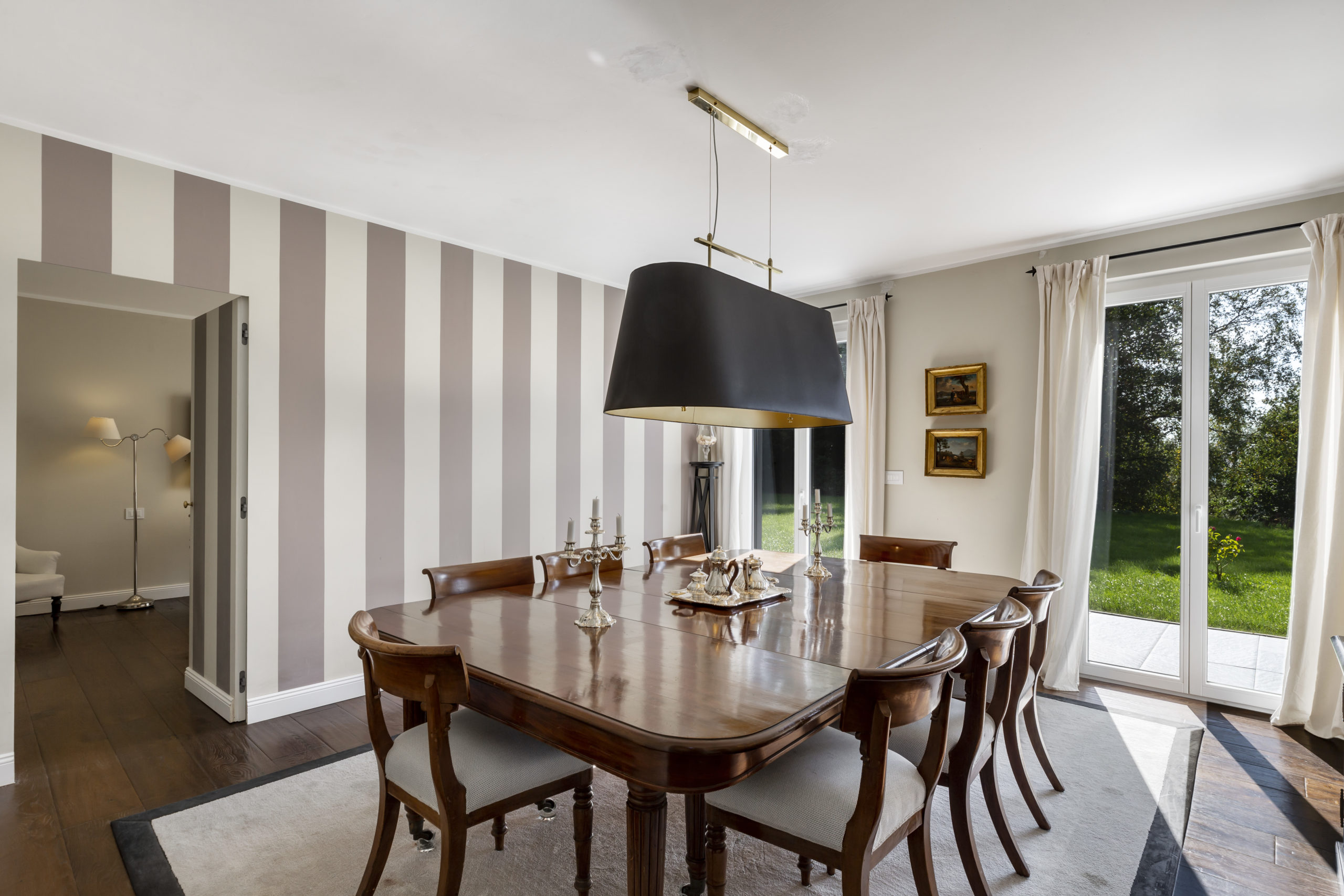 Spanning over 700 m² of usable floor space across two levels, this villa offers a central staircase and a plethora of elegant living spaces. The day area includes numerous reception rooms, a cozy reading nook, a sophisticated dining room, a large closed kitchen, and an office.