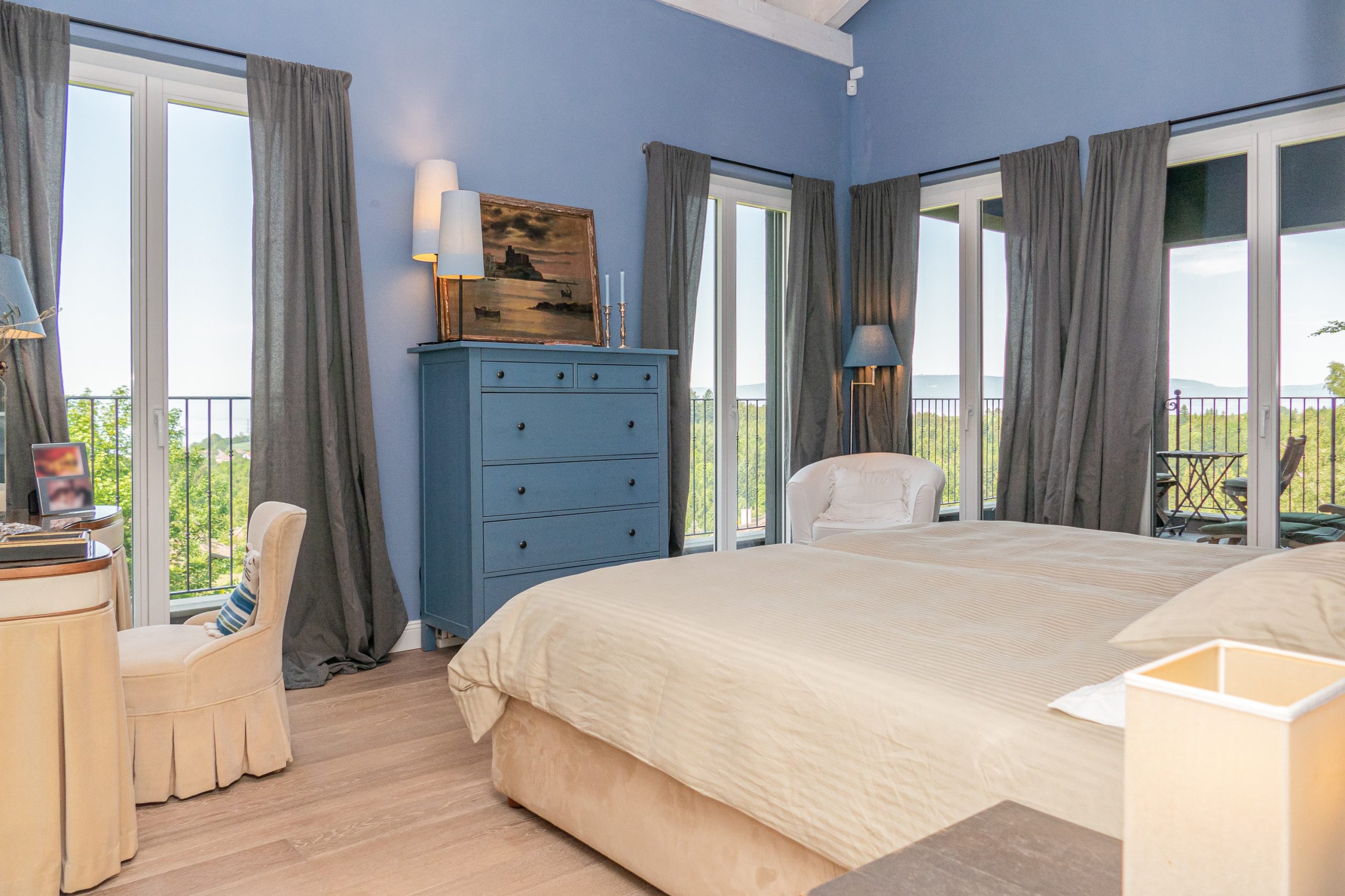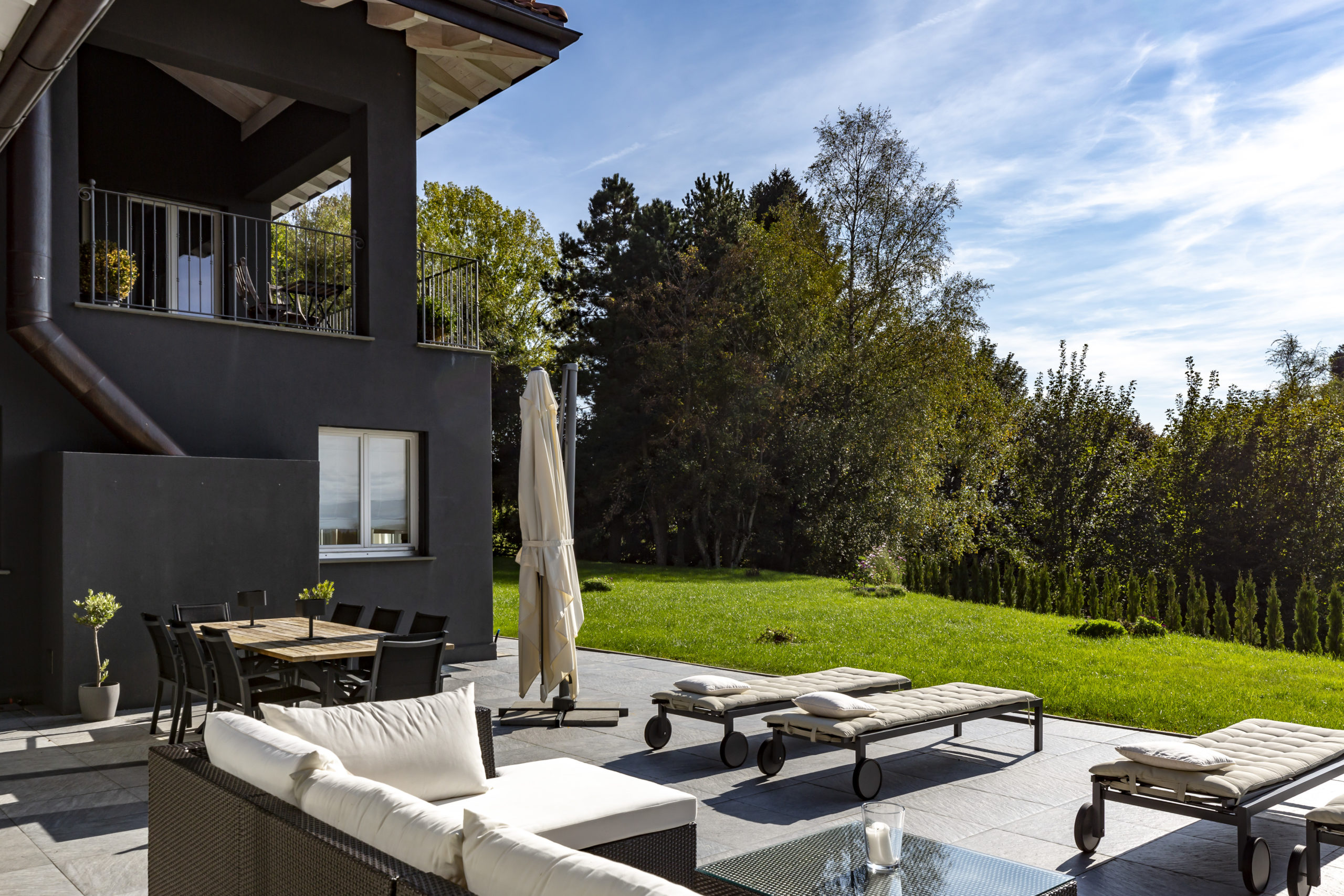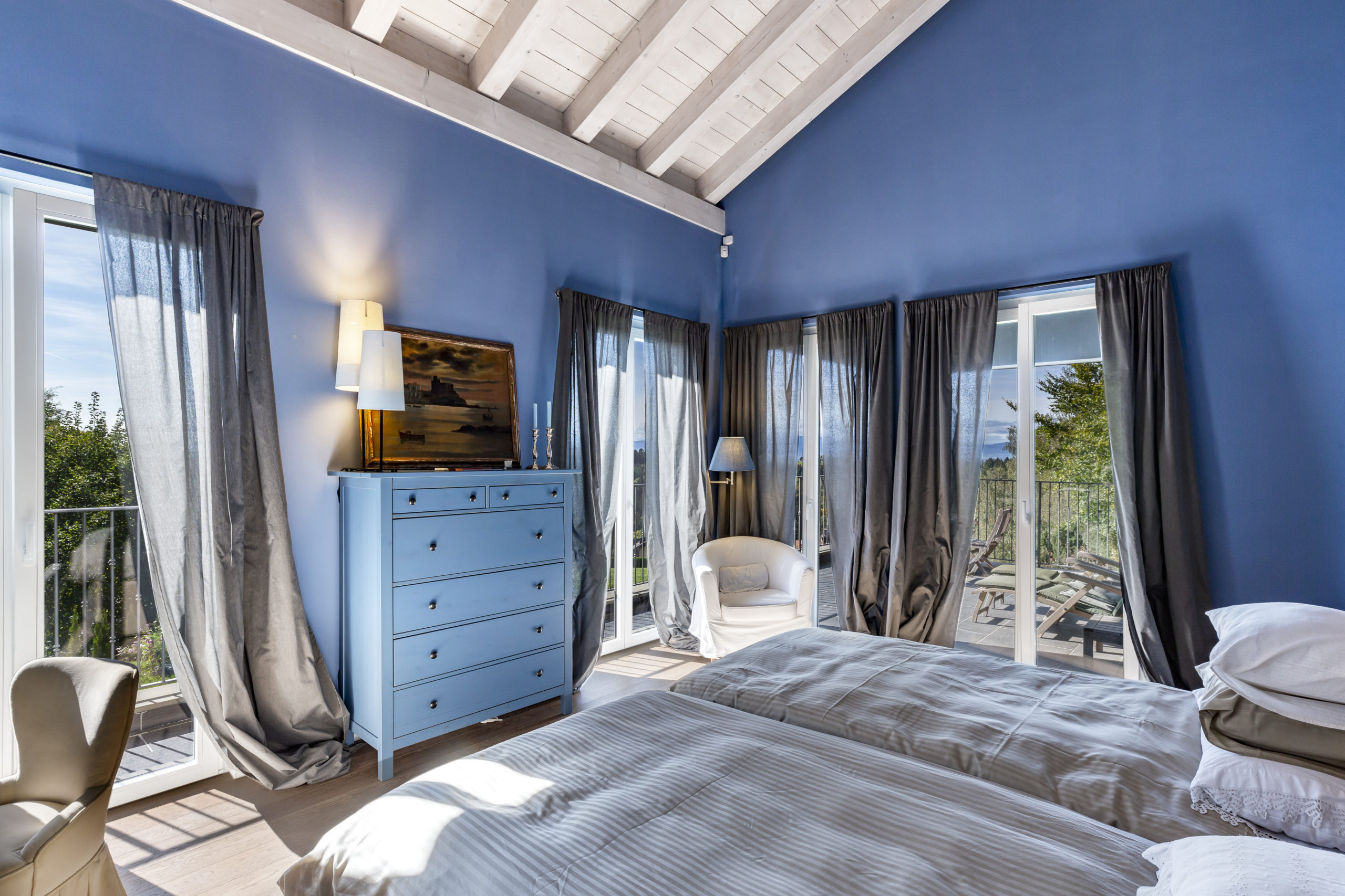 The night area features three en suite bedrooms, with the master bedroom boasting direct access to a spacious terrace that overlooks the serene surroundings, including the lake and the Alps.