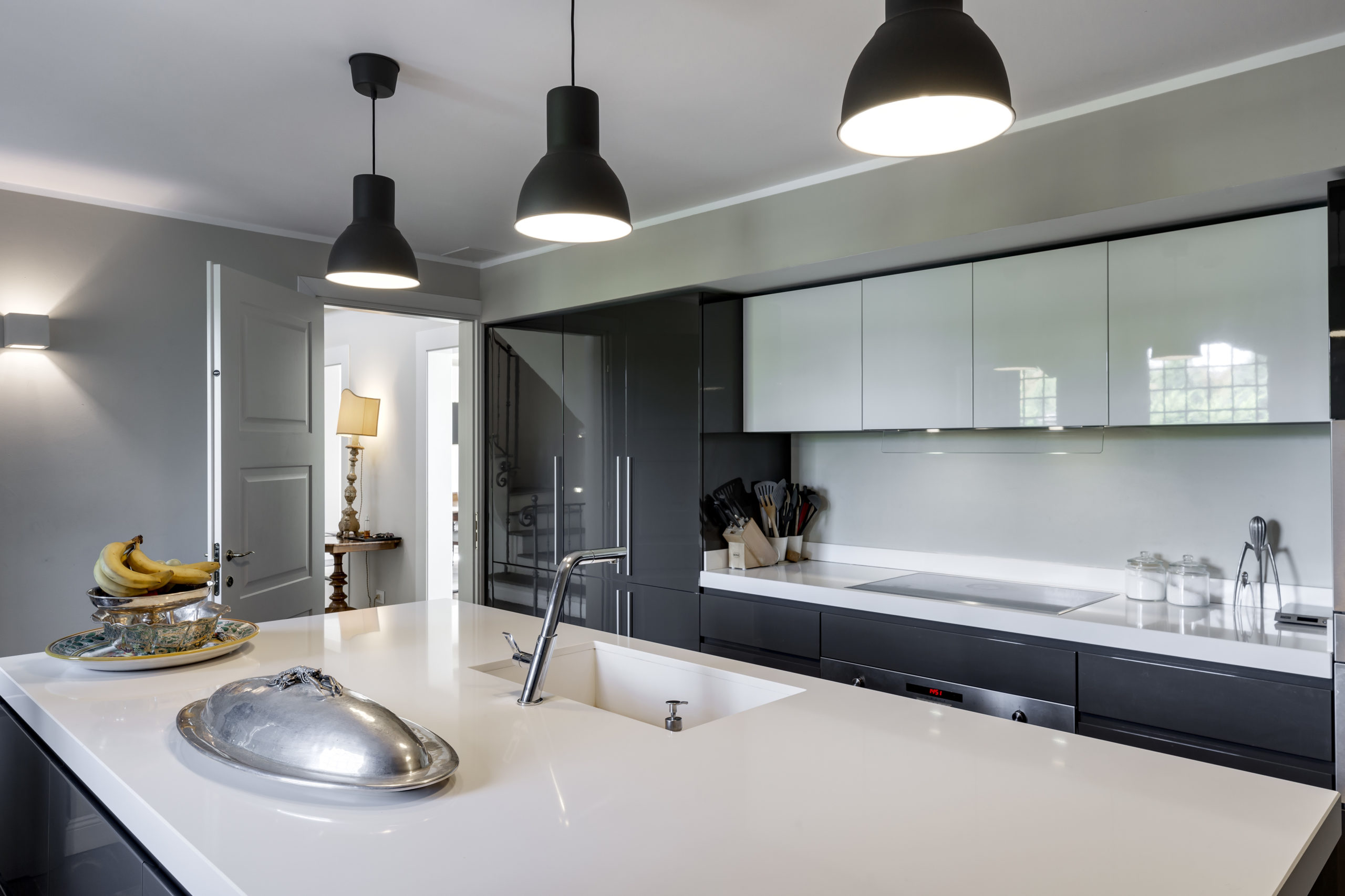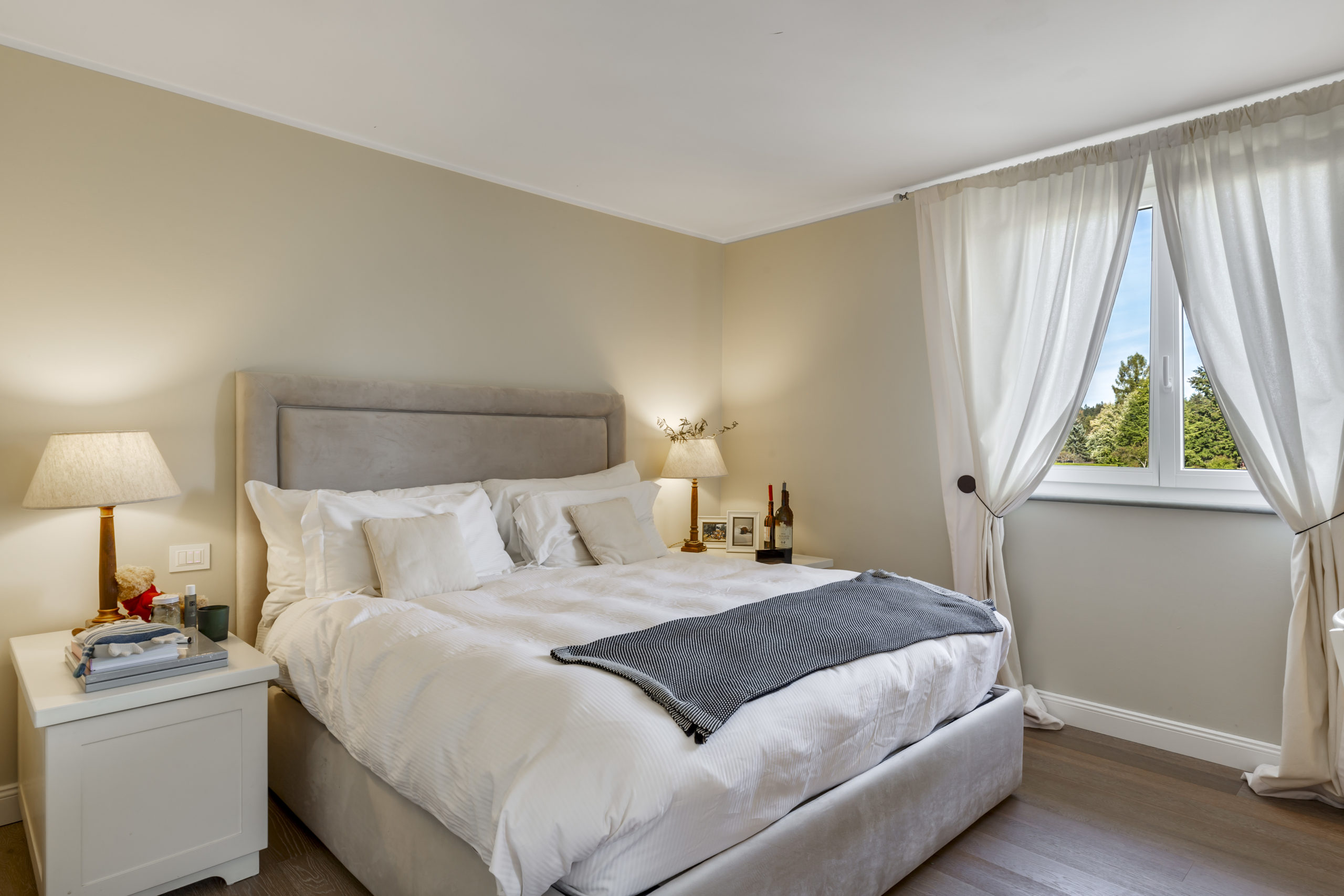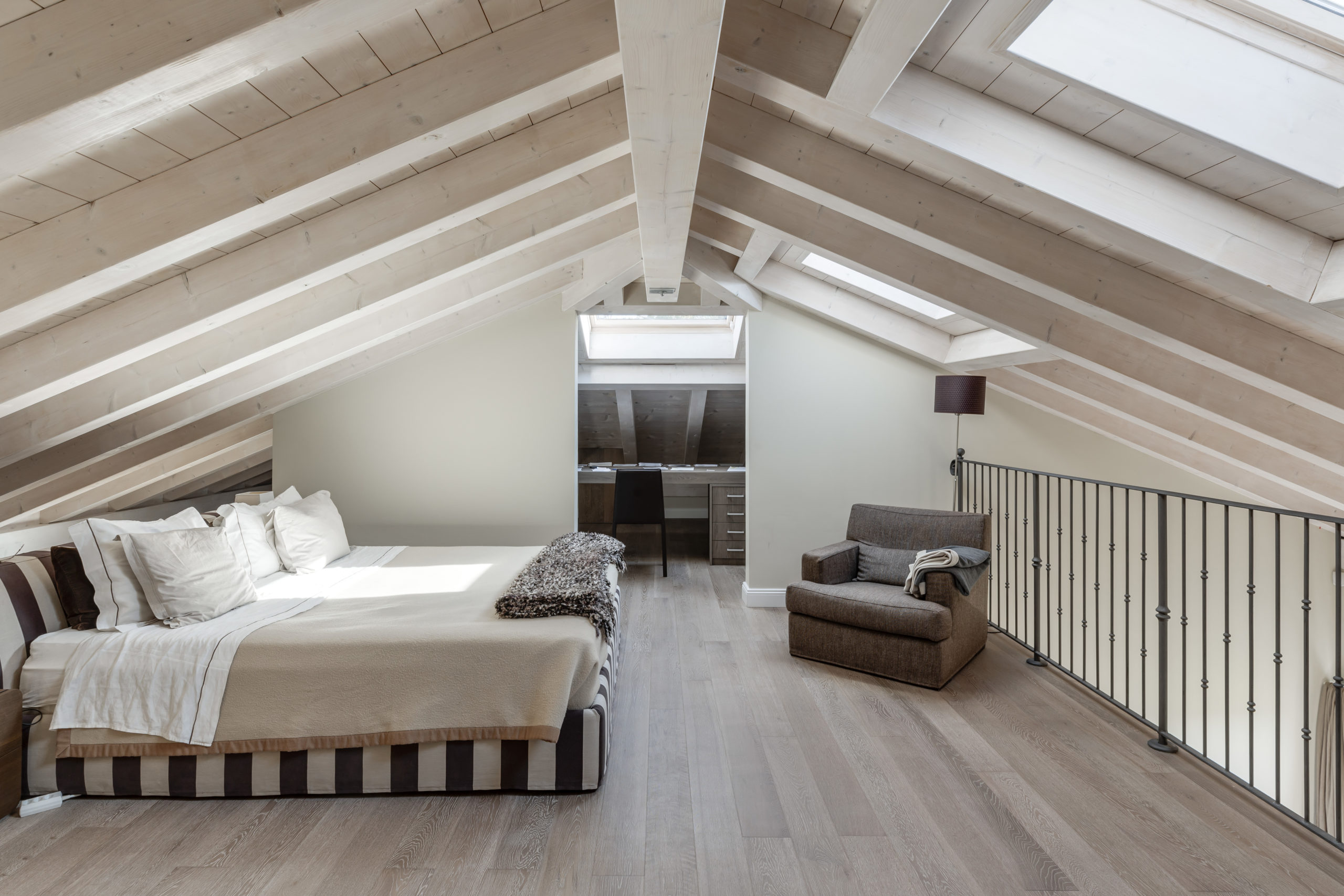 The night area features three en suite bedrooms, with the master bedroom boasting direct access to a spacious terrace that overlooks the serene surroundings, including the lake and the Alps.