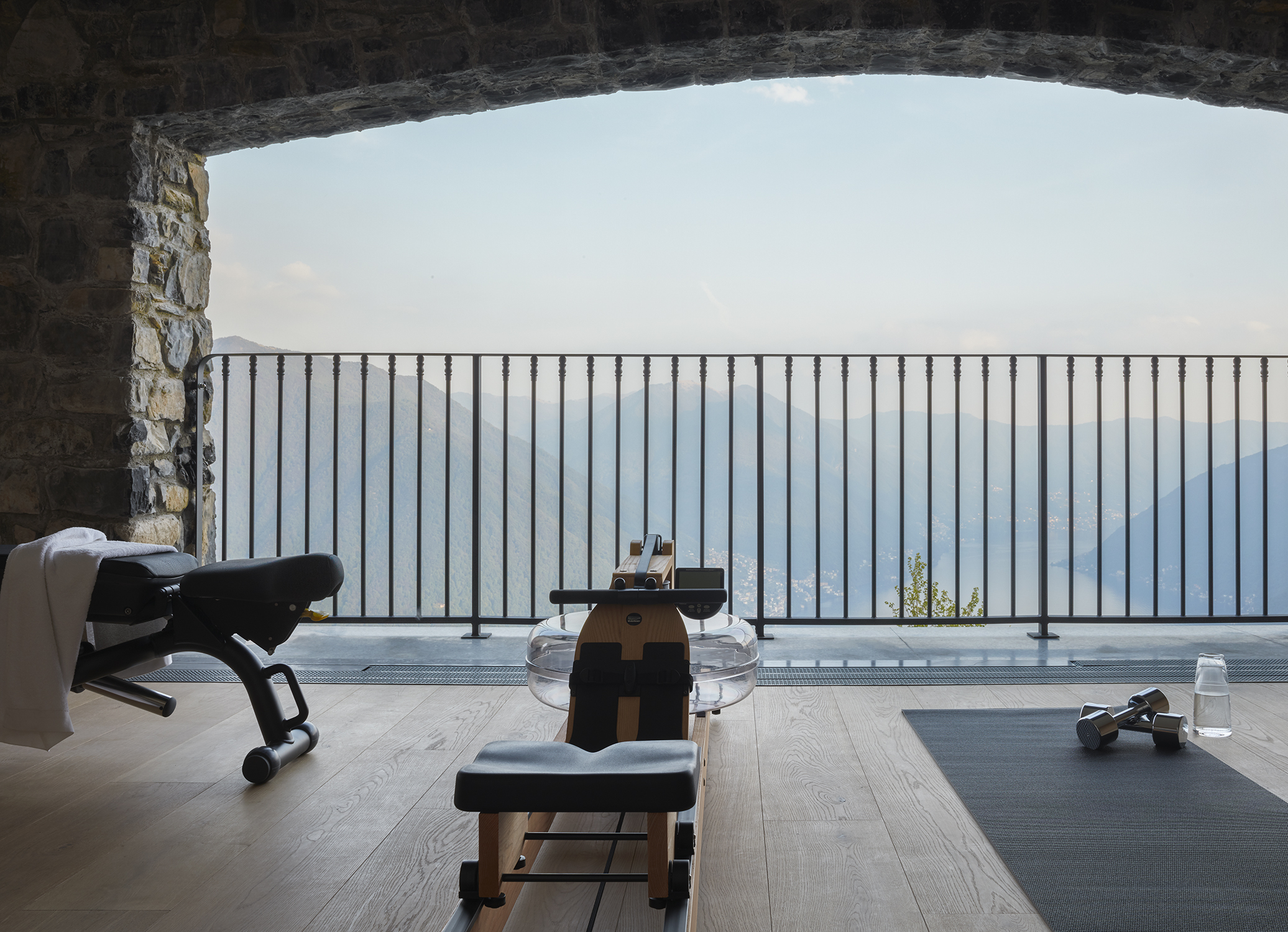 Également creusée dans la paroi rocheuse se trouve une installation de yoga/bien-être vraiment impressionnante. Cette grande salle offrant une vue inspirante sur le lac peut facilement accueillir 8 pratiquants de yoga côte à côte et comprend également un espace pour le matériel de sport de Technogym. Cela inclut le système de musculation par câble Kinesis, un rameur, un vélo d’appartement, des haltères, des bandes élastiques et des ballons d’exercice. Cette chambre bénéficie également d’une salle de bain attenante, d’un hammam et d’une douche.