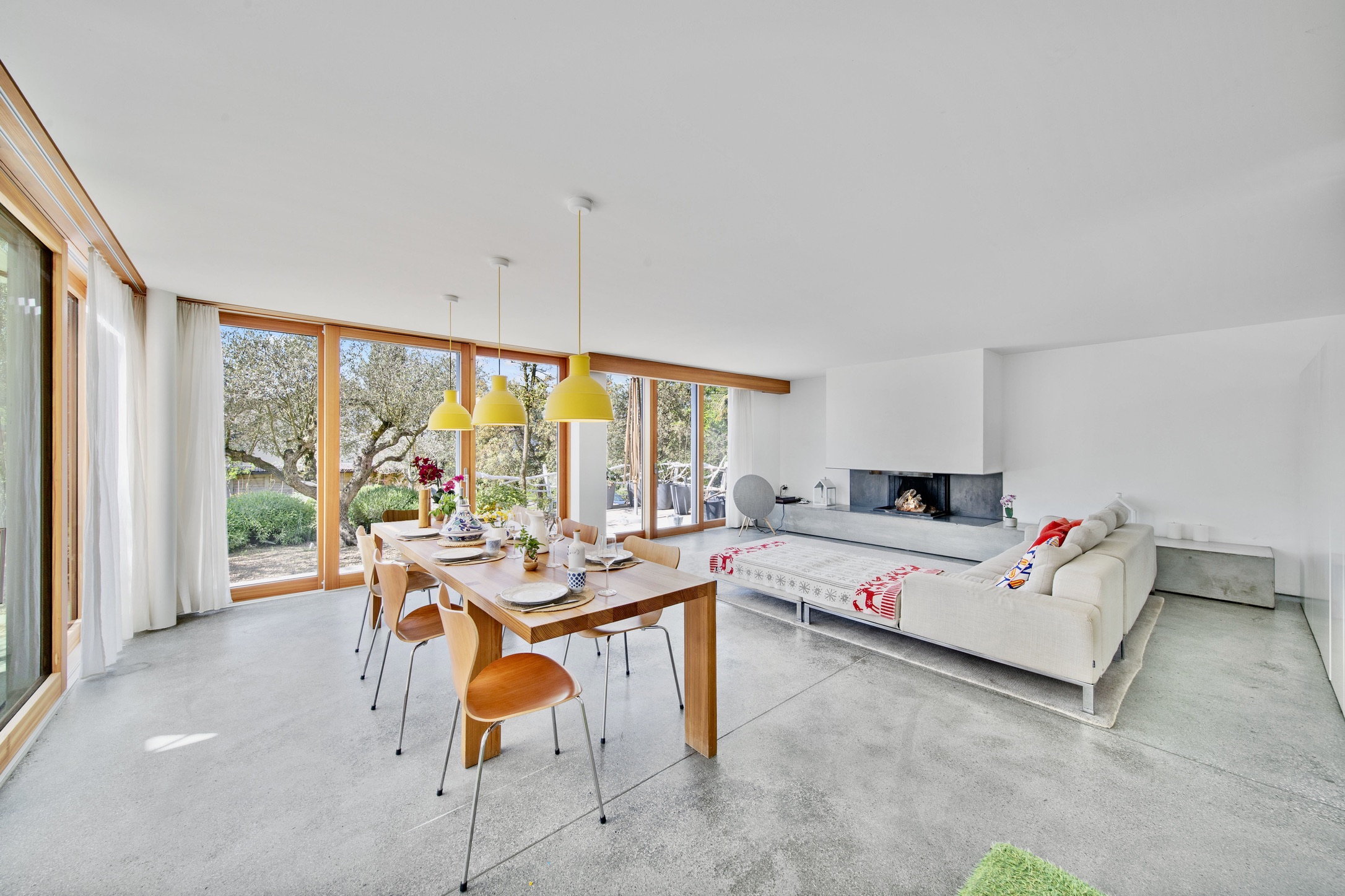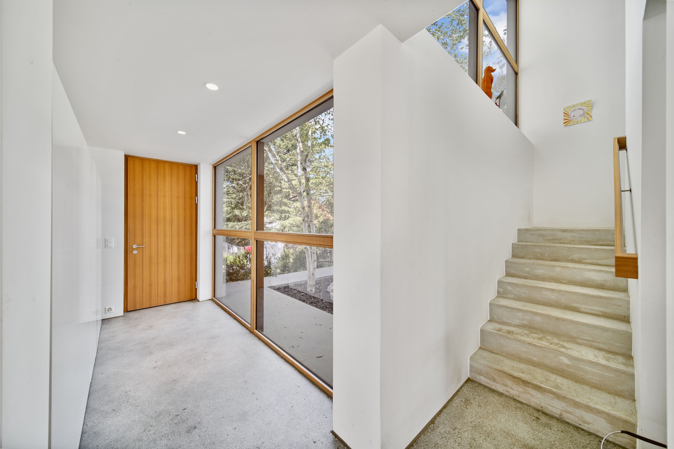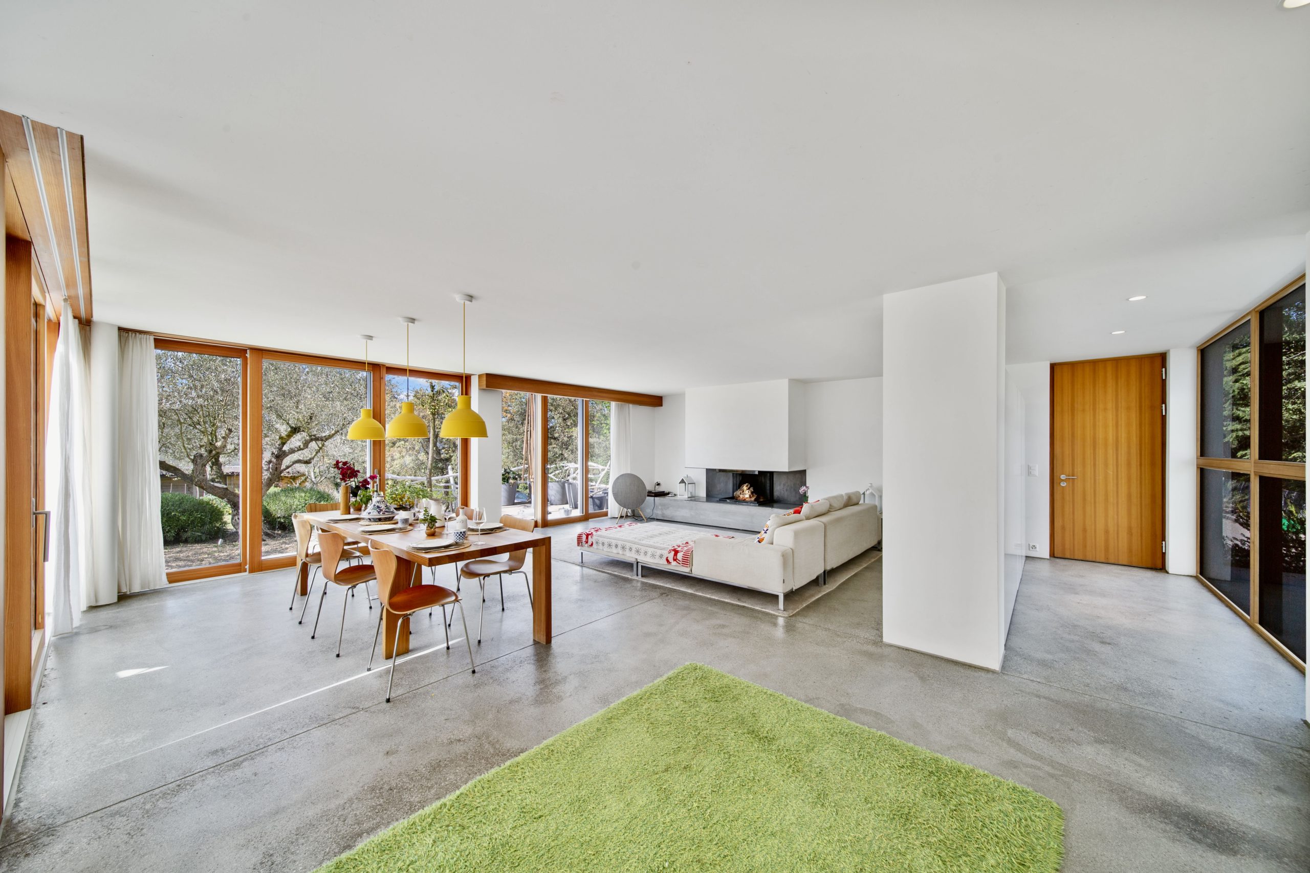 The interior of the house is tastefully decorated with elegant minimalistic finishes, including concrete floors, custom cabinetry, and high-end appliances. The main living area is bright and airy, with large windows that flood the space with natural light and offer stunning views of the surrounding landscape and nature. The property’s ground floor features a fully equipped kitchen, a dining area and a spacious living room, and access to outdoor terraces.