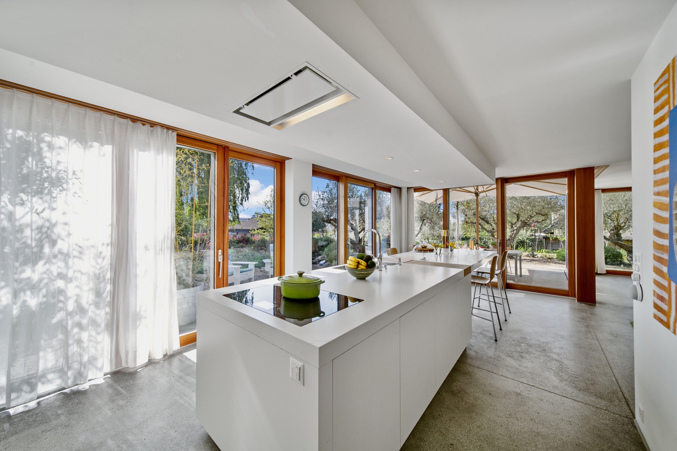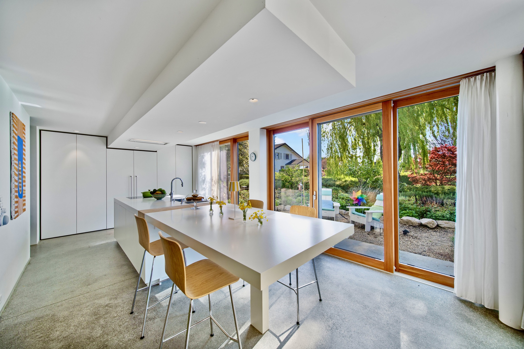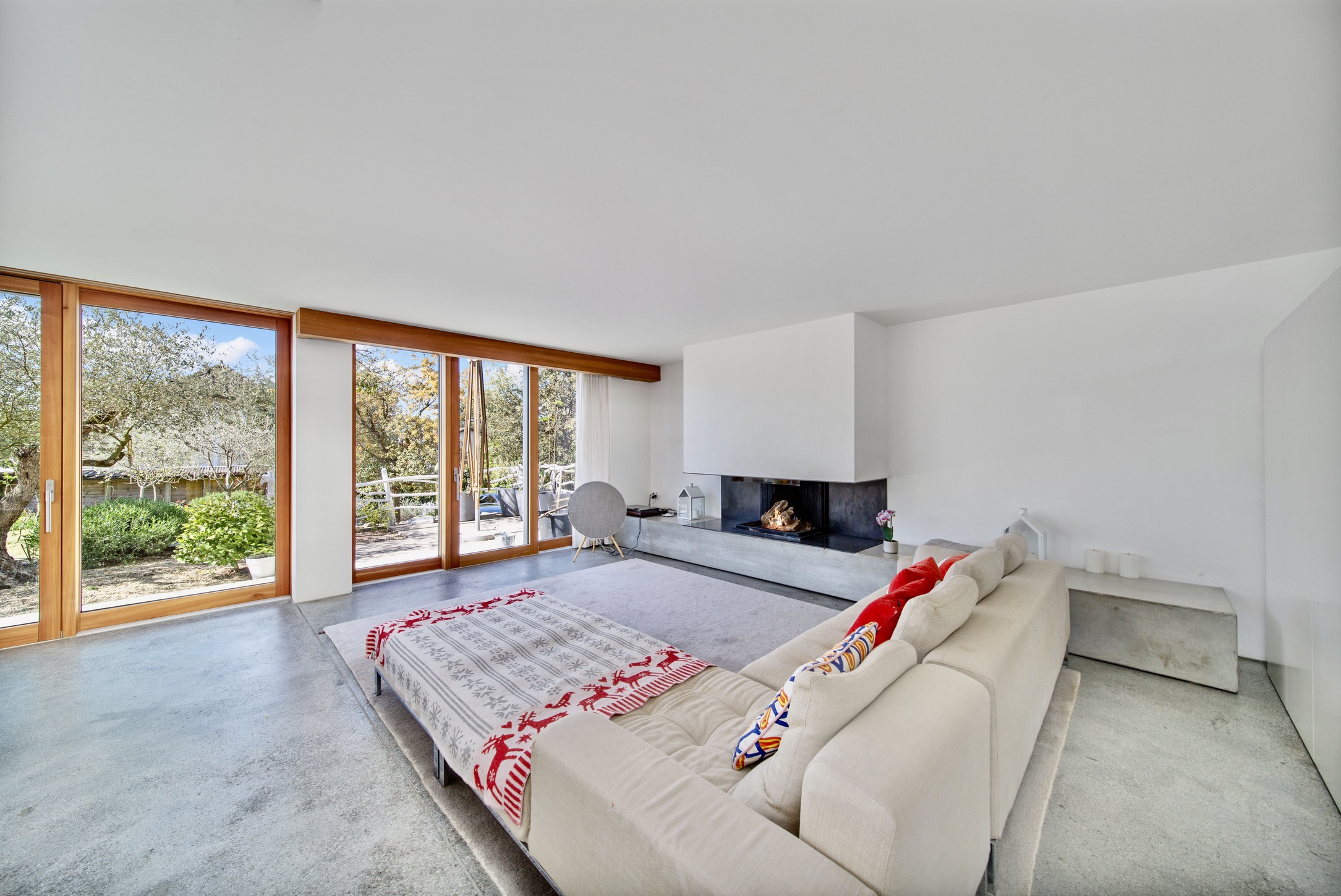 The interior of the house is tastefully decorated with elegant minimalistic finishes, including concrete floors, custom cabinetry, and high-end appliances. The main living area is bright and airy, with large windows that flood the space with natural light and offer stunning views of the surrounding landscape and nature. The property’s ground floor features a fully equipped kitchen, a dining area and a spacious living room, and access to outdoor terraces.