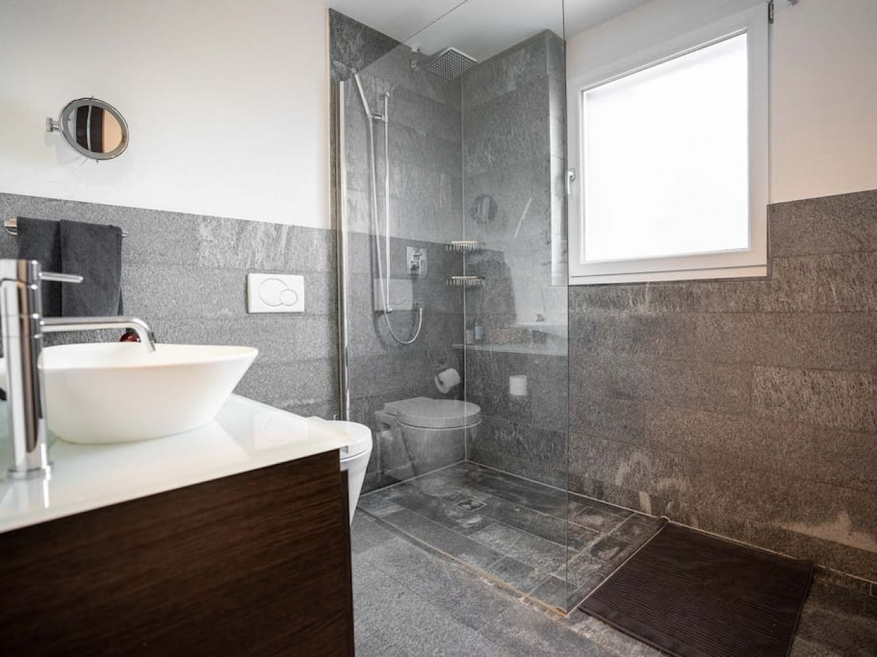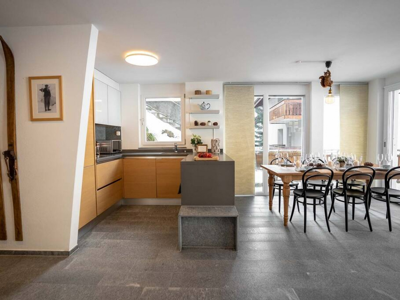 The Zermatt Duplex Apartment Verona has a big, open kitchen and living room, perfect for relaxing or spending time with friends and family. The kitchen features modern appliances, making it easy to cook meals during your stay. Whether you’re preparing a big dinner or a quick snack, you’ll find everything you need here. The living room connects to two large balconies, where you can admire the amazing Matterhorn views and enjoy sunshine all day, thanks to the apartment’s south-facing spot.