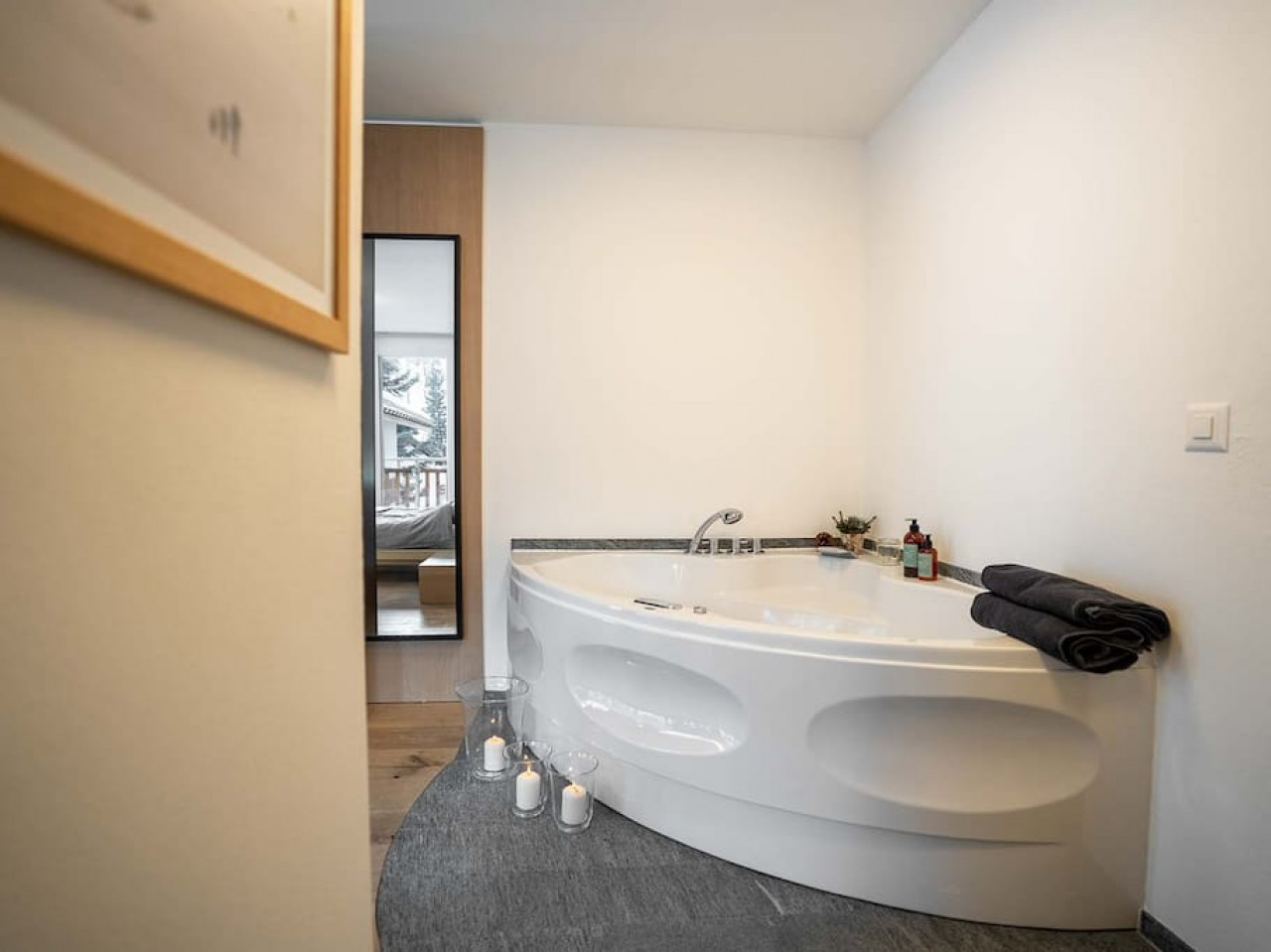 This duplex also includes two full bathrooms and an extra restroom, offering convenience for all guests. The master bedroom shines with its jacuzzi that directly overlooks the Matterhorn, providing a private place to relax. Each bedroom offers plenty of storage space, allowing you to keep your things organized during your stay.